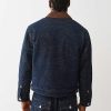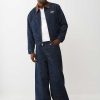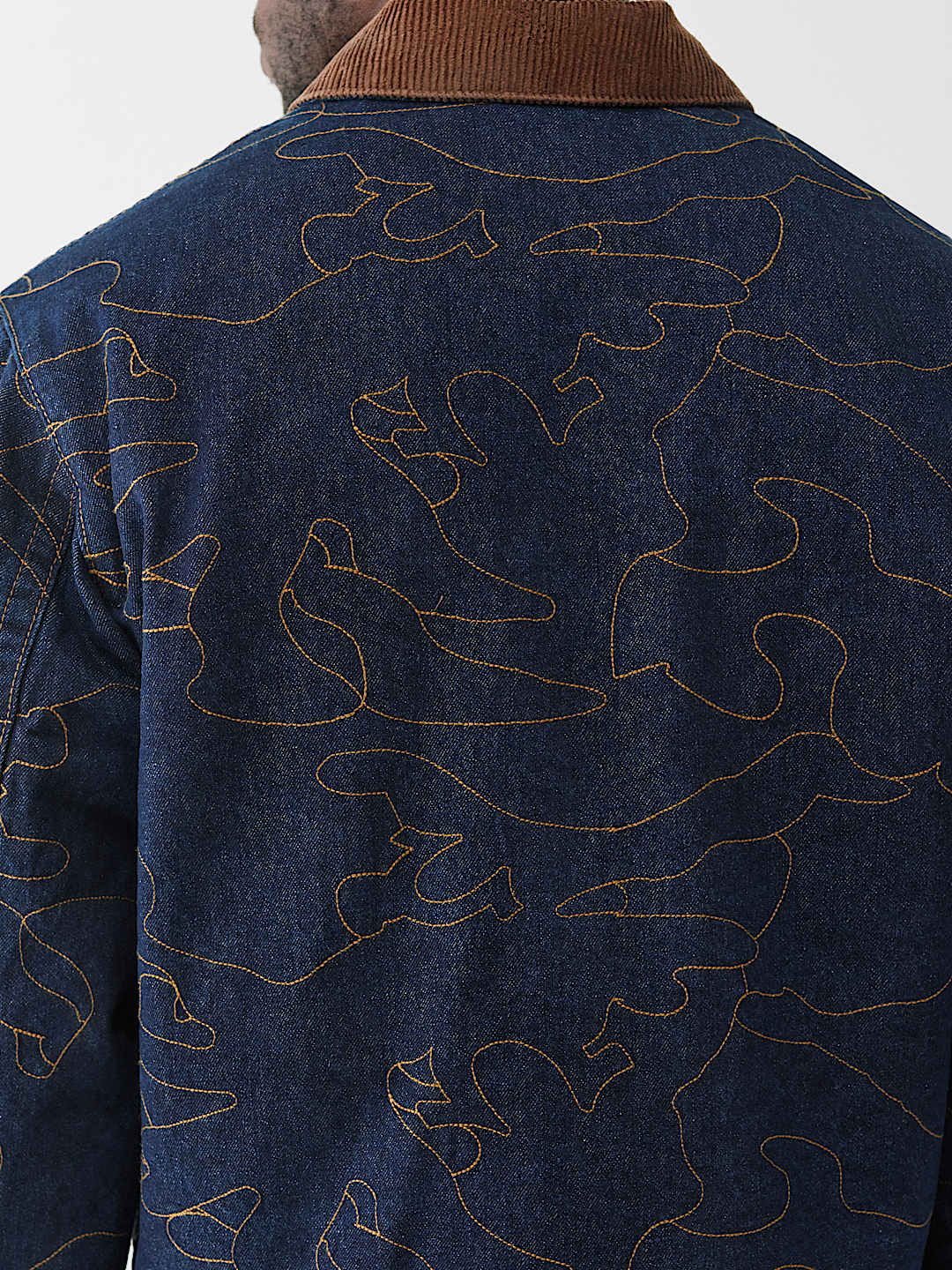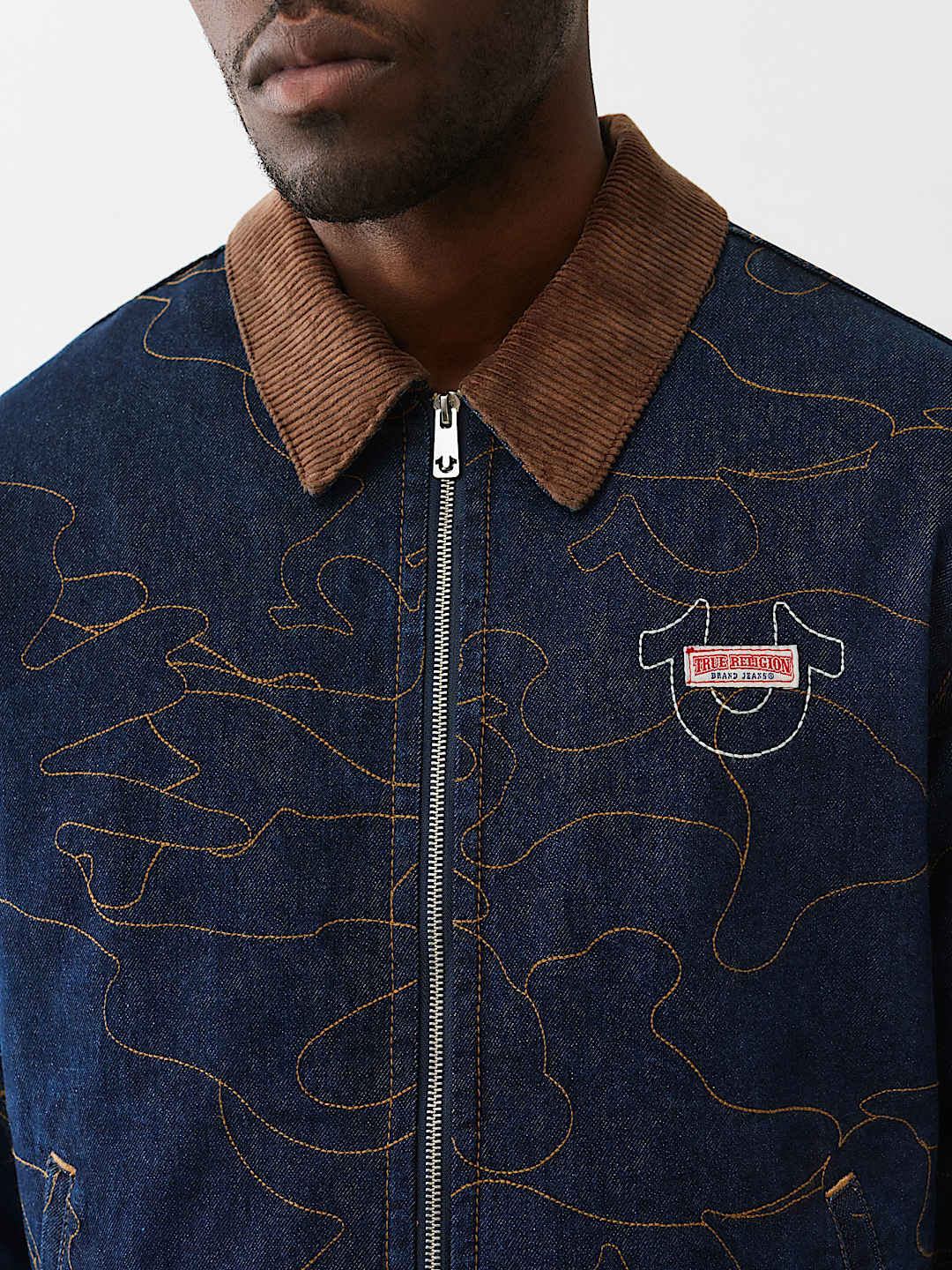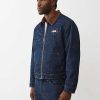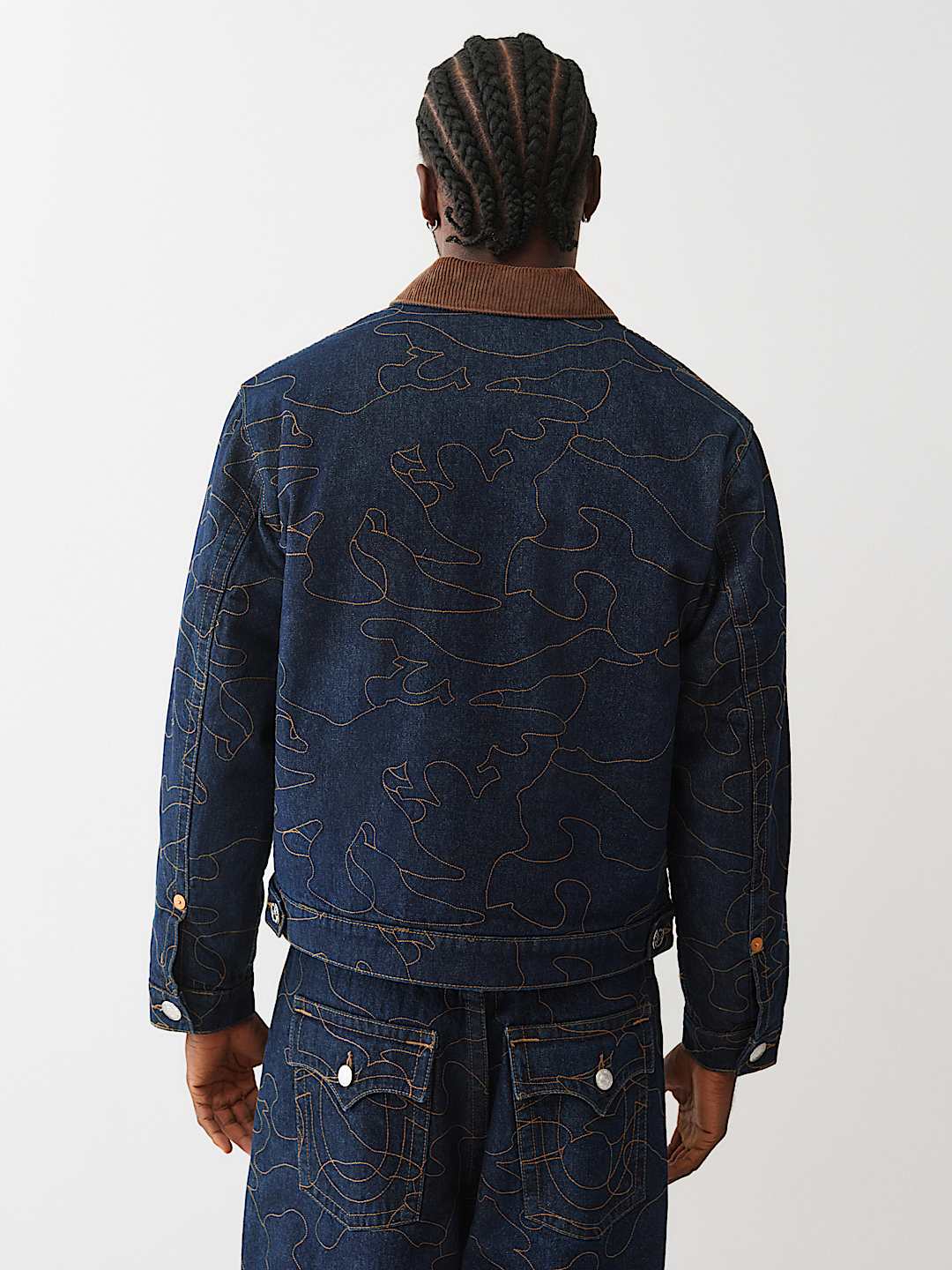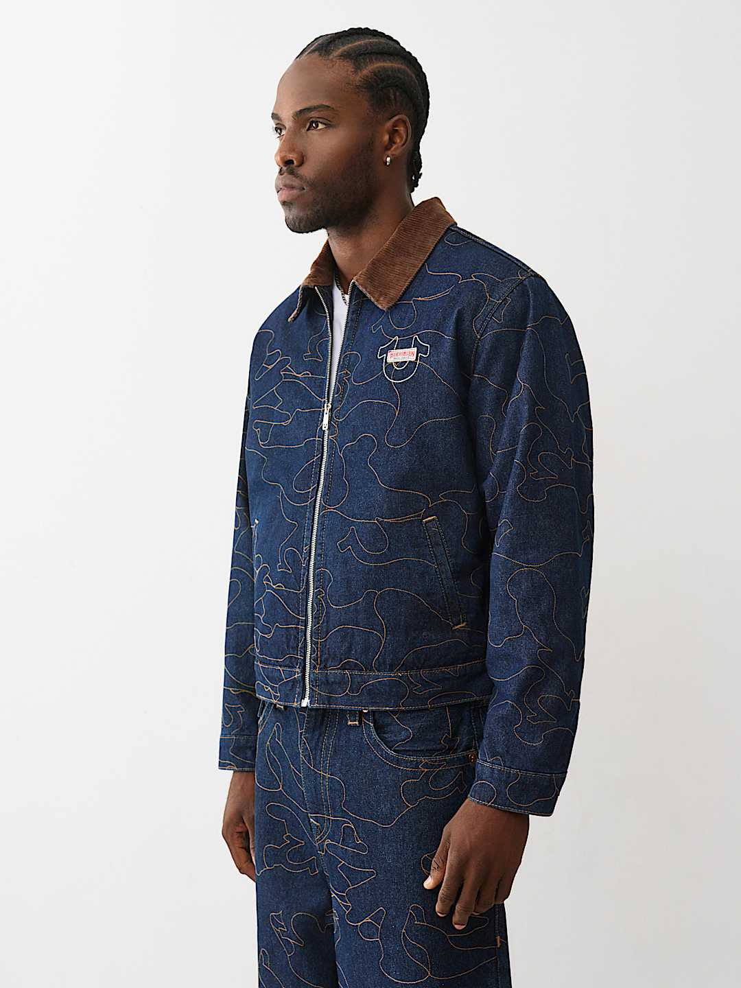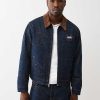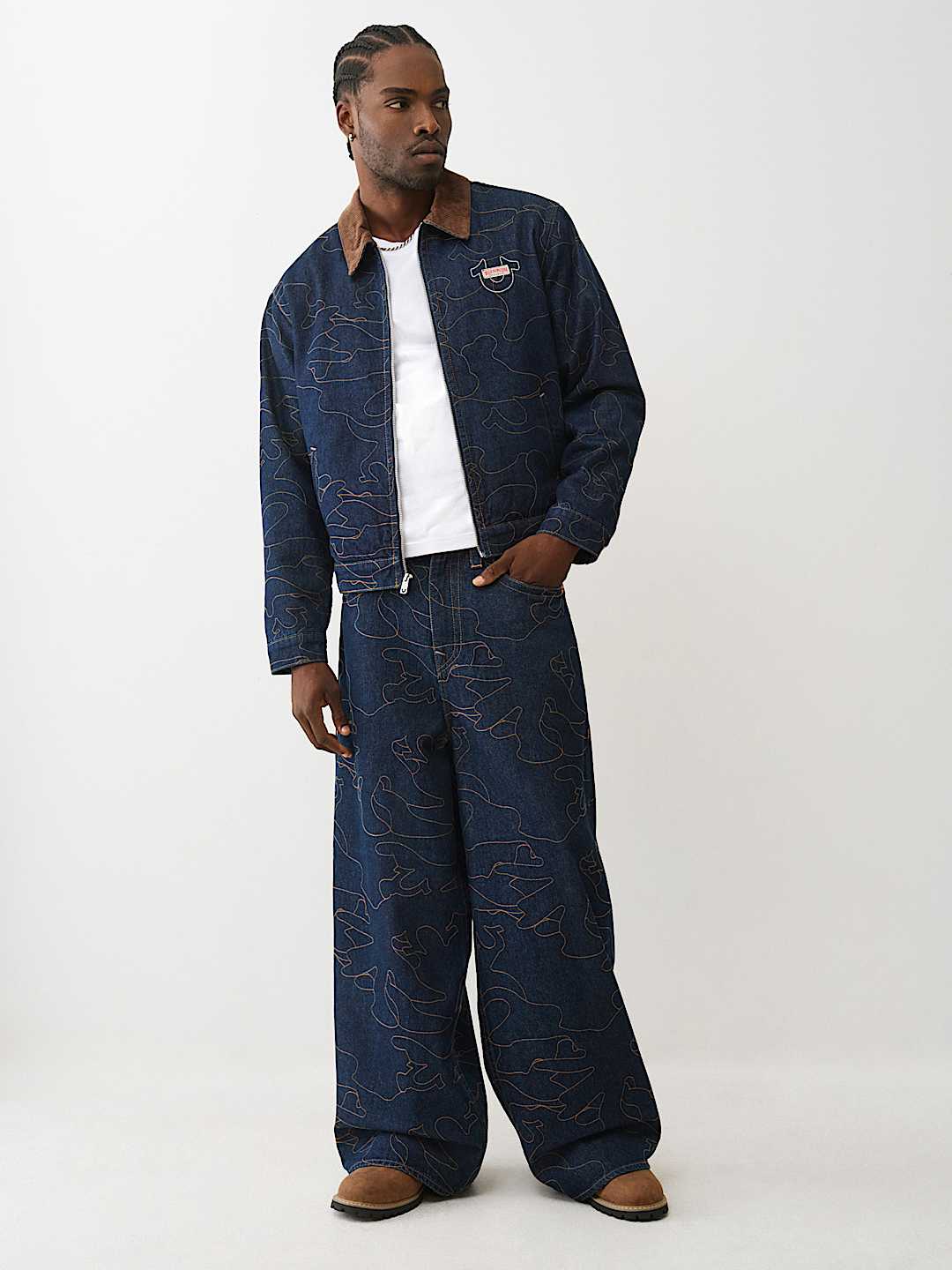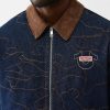 Stand out with your stitch in the Allover Embroidered Stitch Oversized Denim Jacket. This relaxed-fit, dark-wash jacket features allover single-needle stitching in abstract horseshoe and line patterns, a contrast-colored collar, slanted side pockets, and a branded horseshoe on the chest.