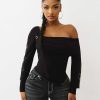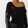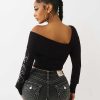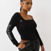 Cozy never looked this hot in the Asymmetric Off-The-Shoulder Sweater. Designed in a cropped fit, this sweater features an asymmetric neckline, off-the-shoulder fit, and a buckle at the collar. Finished with a bedazzled logo on the arm for that final, eye-catching touch.