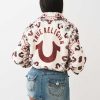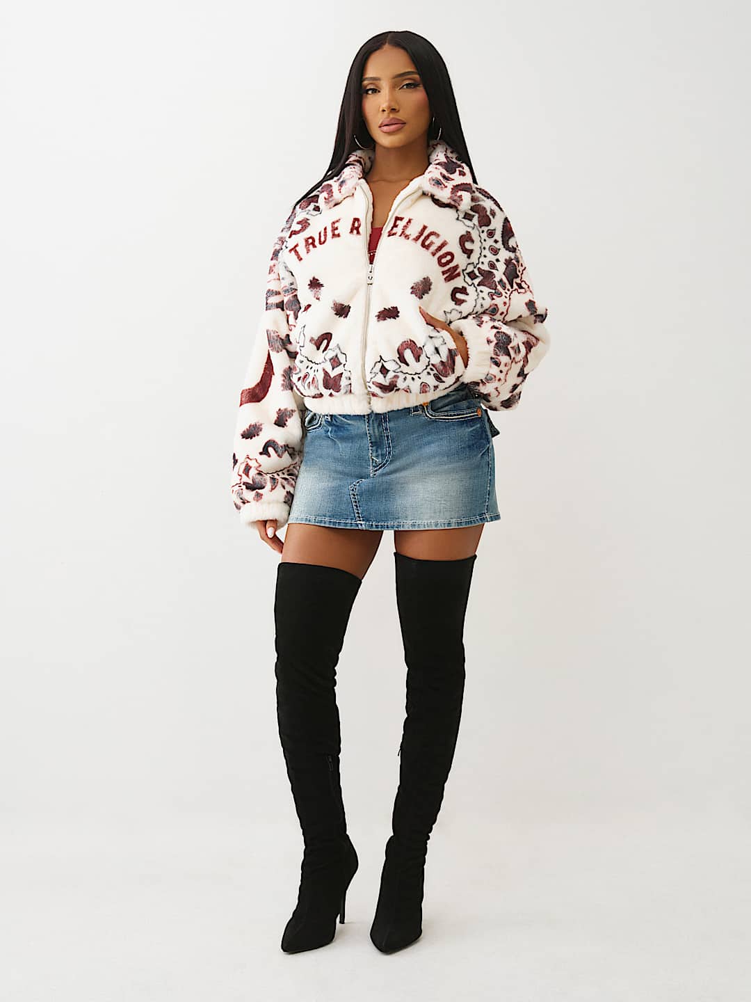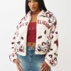 The cold (and haters) don’t stand a chance in the Bandana Print Faux Fur Jacket. This collared, zip-front jacket features bold bandana-and-horseshoe print throughout, side pockets, and a branded logo on the back.