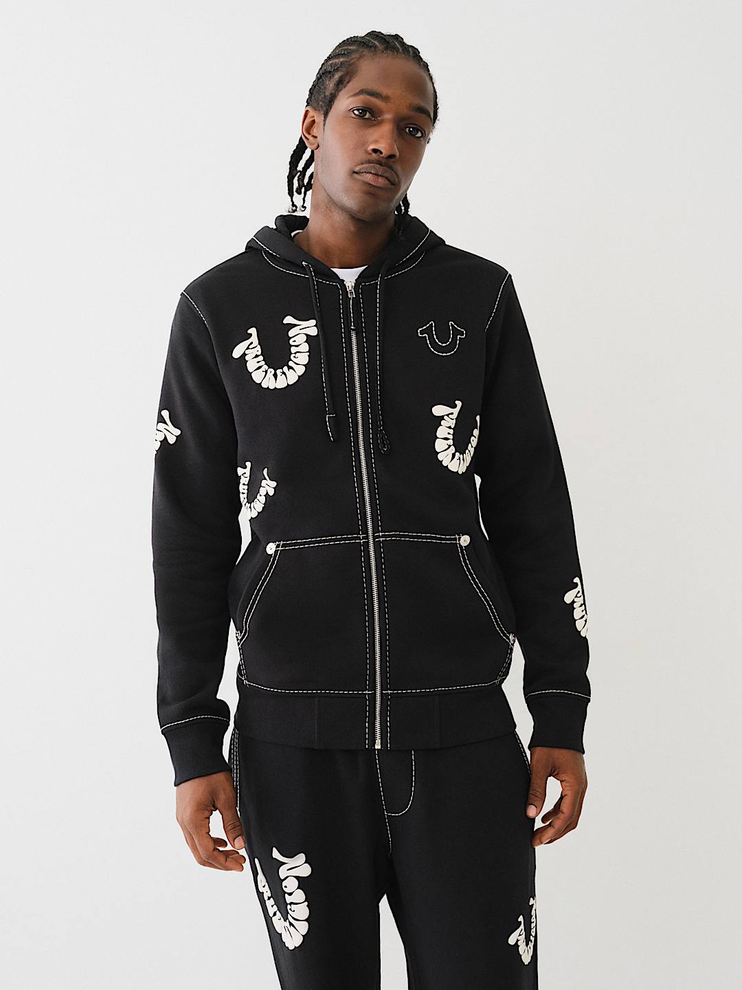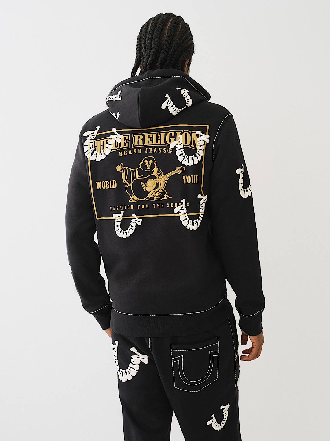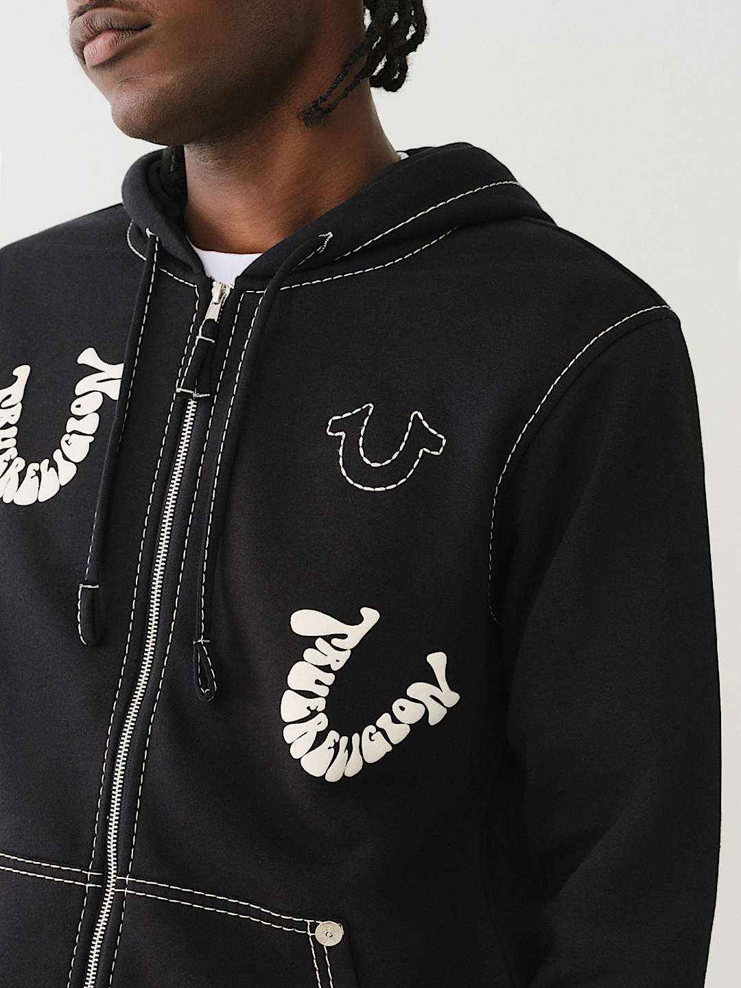Rock Designer Brand style with the Big T Warped Puff Print Logo Zip Hoodie. Crafted from cozy fleece-lined fabric, it boasts a drawstring hood, split kangaroo pocket, contrast Big T stitching, long sleeves, and a chest thread horseshoe logo. Complete with an allover “True Religion” puff print text warped into a horseshoe shape for a standout finish.