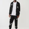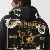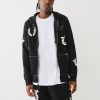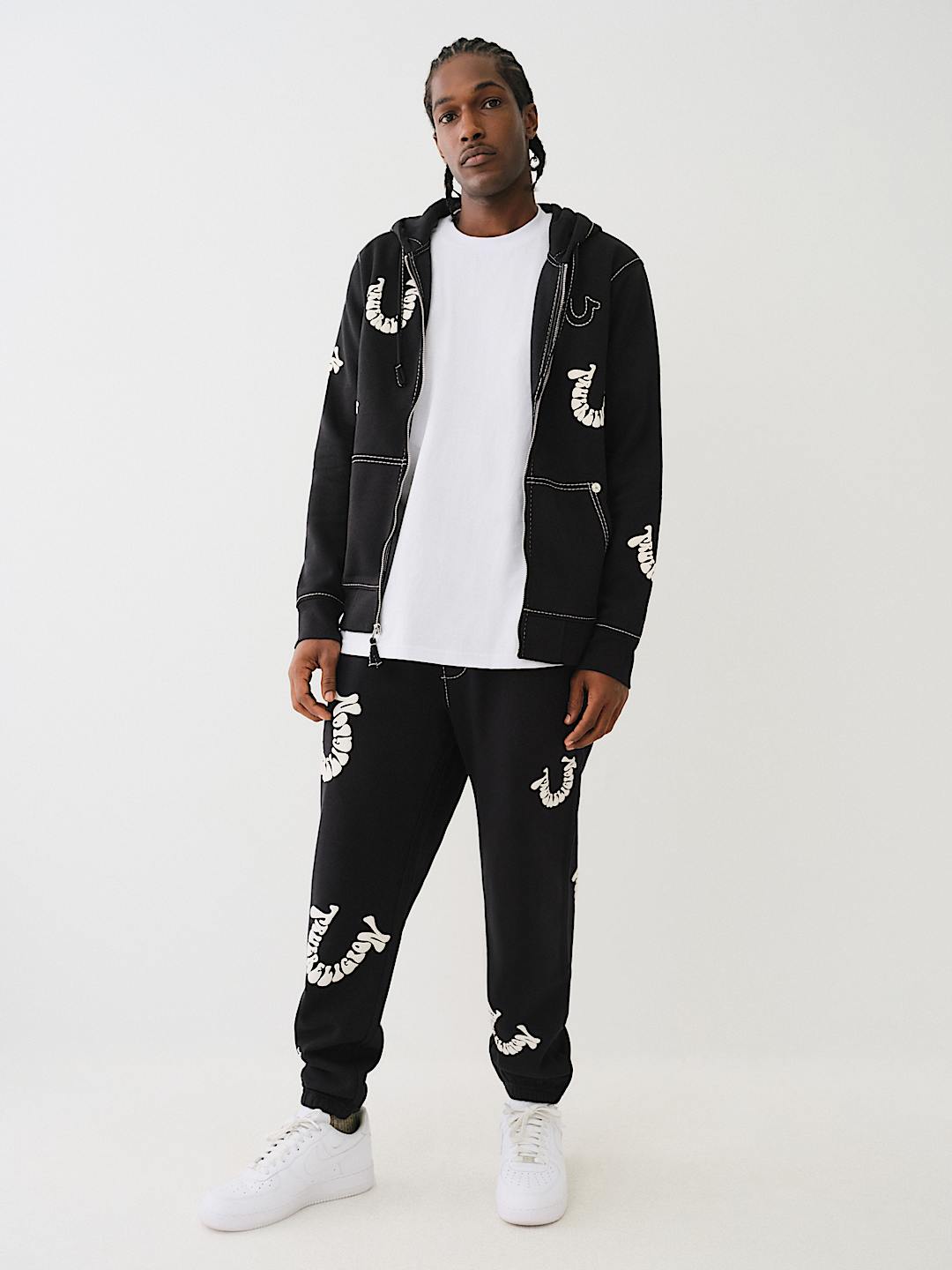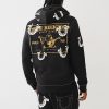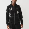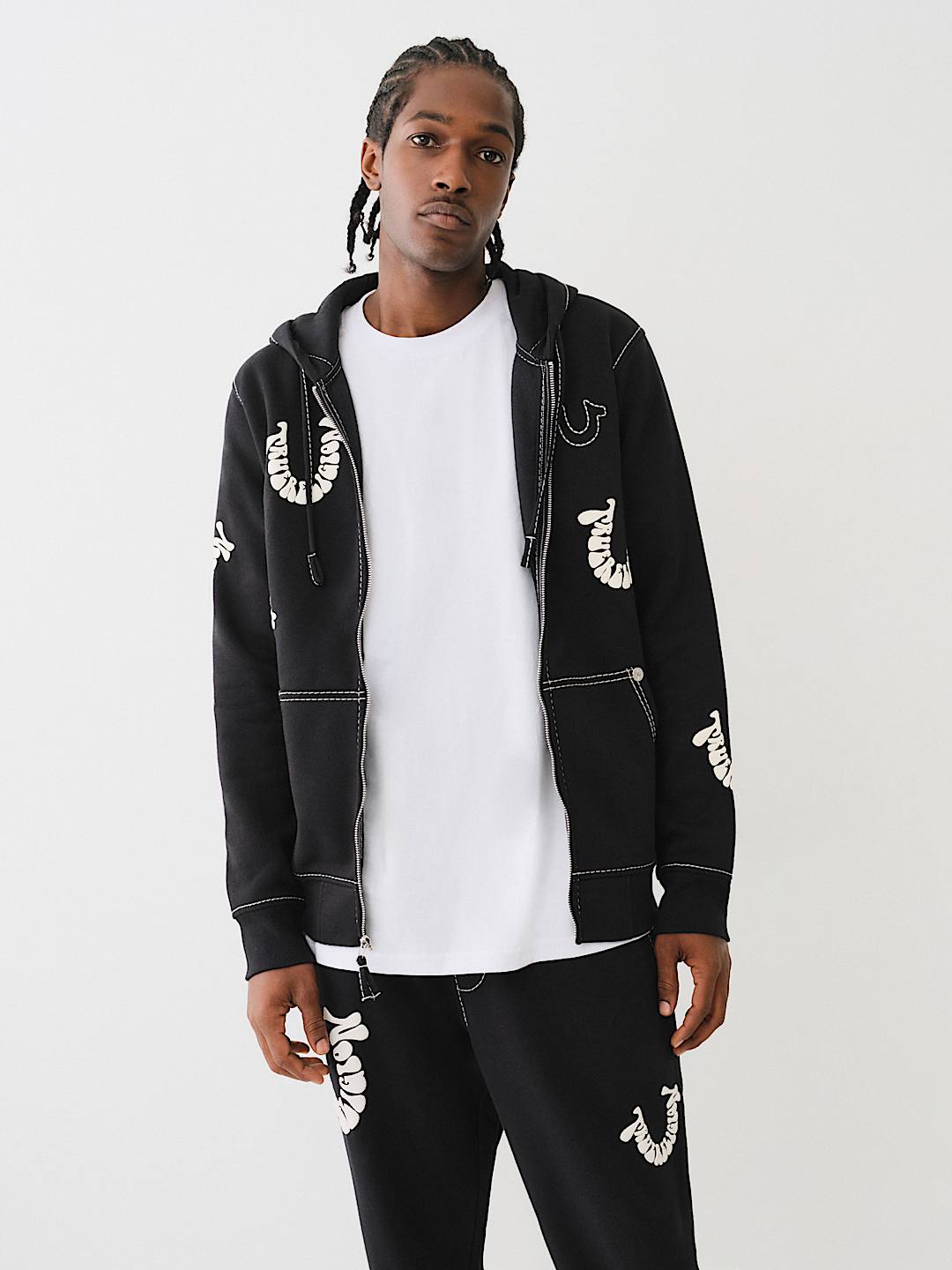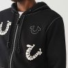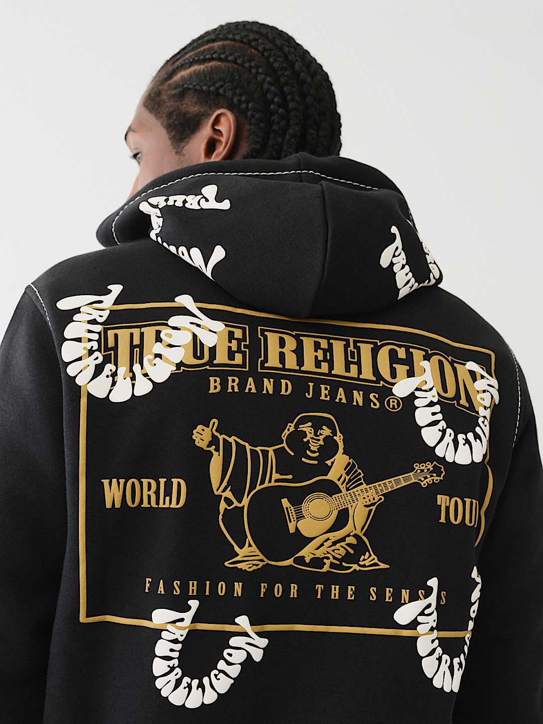 Rock Designer Brand style with the Big T Warped Puff Print Logo Zip Hoodie. Crafted from cozy fleece-lined fabric, it boasts a drawstring hood, split kangaroo pocket, contrast Big T stitching, long sleeves, and a chest thread horseshoe logo. Complete with an allover “True Religion” puff print text warped into a horseshoe shape for a standout finish.