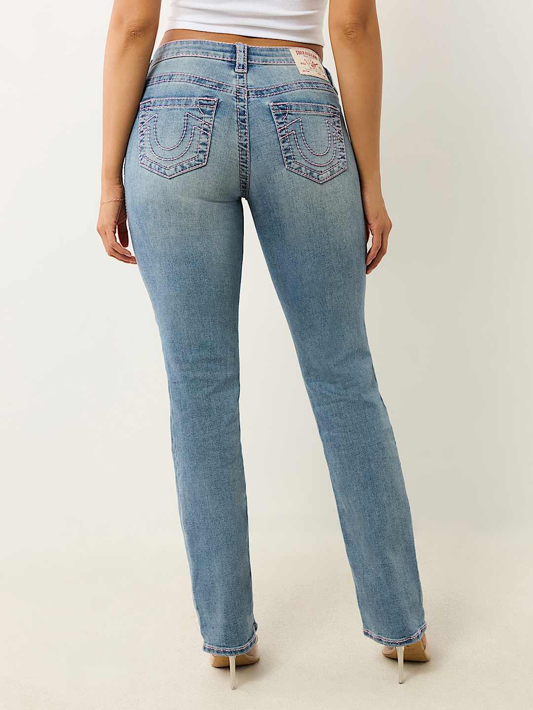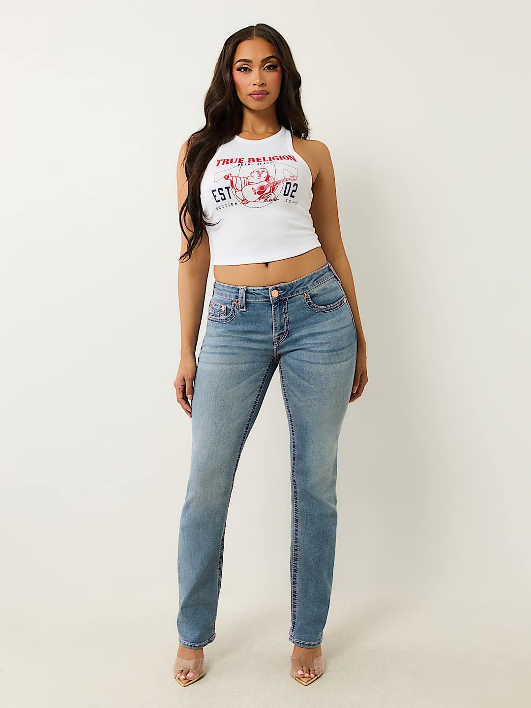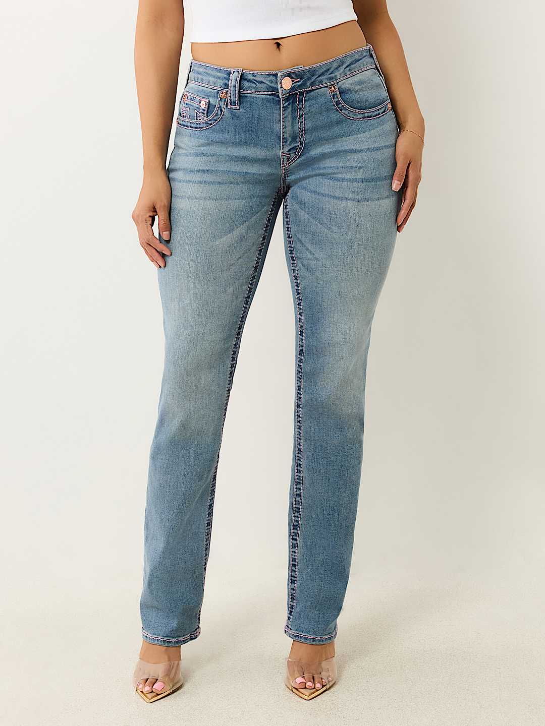 Go from day to night in the Billie Mid Rise Big T Straight Jean. Crafted in a light wash, this pair of women’s jeans feature a zip fly, belt loops, whiskering, and mid-rise waist. Finished with pink Big T stitching and horseshoe detailing on the back pockets.