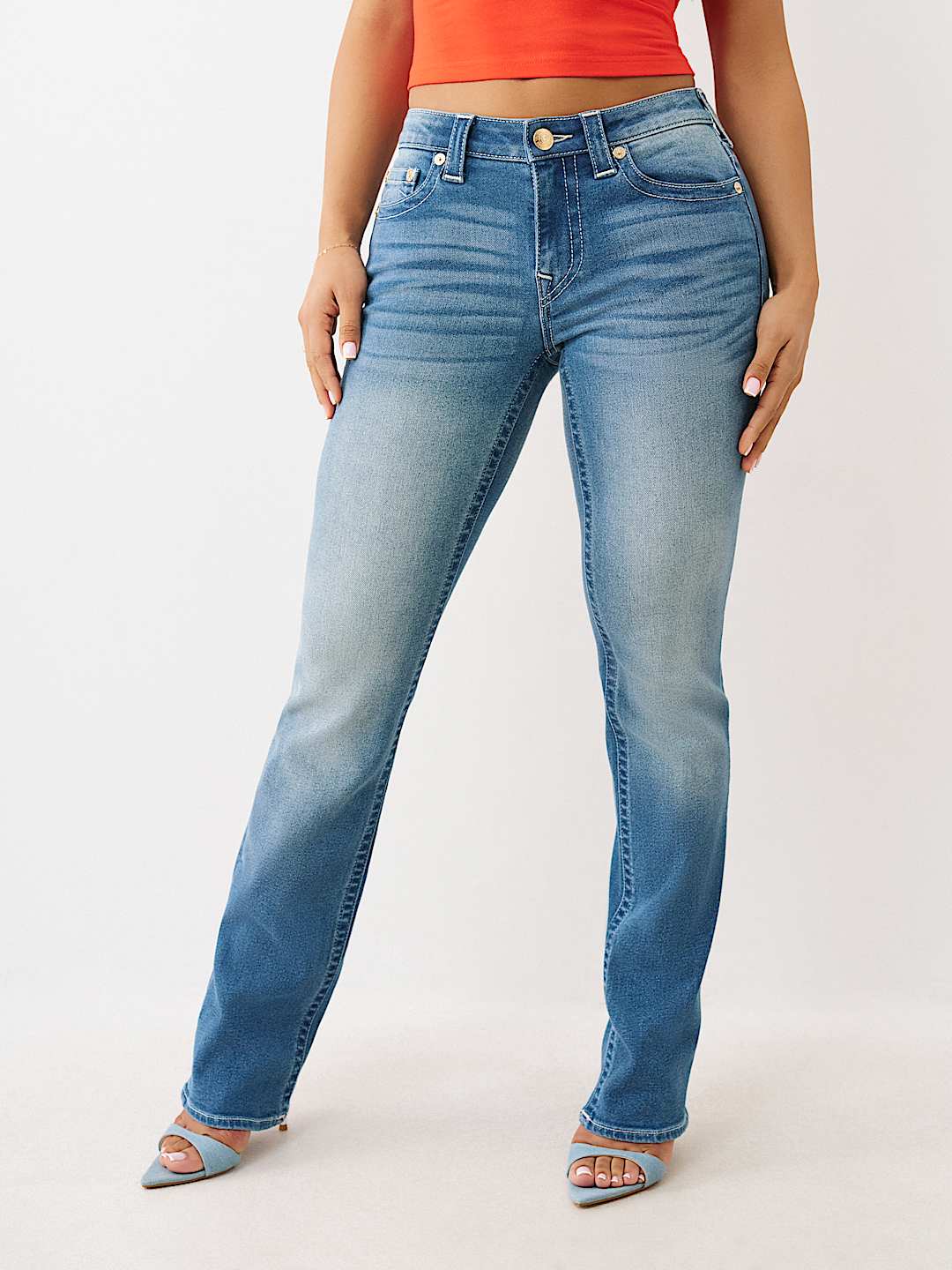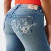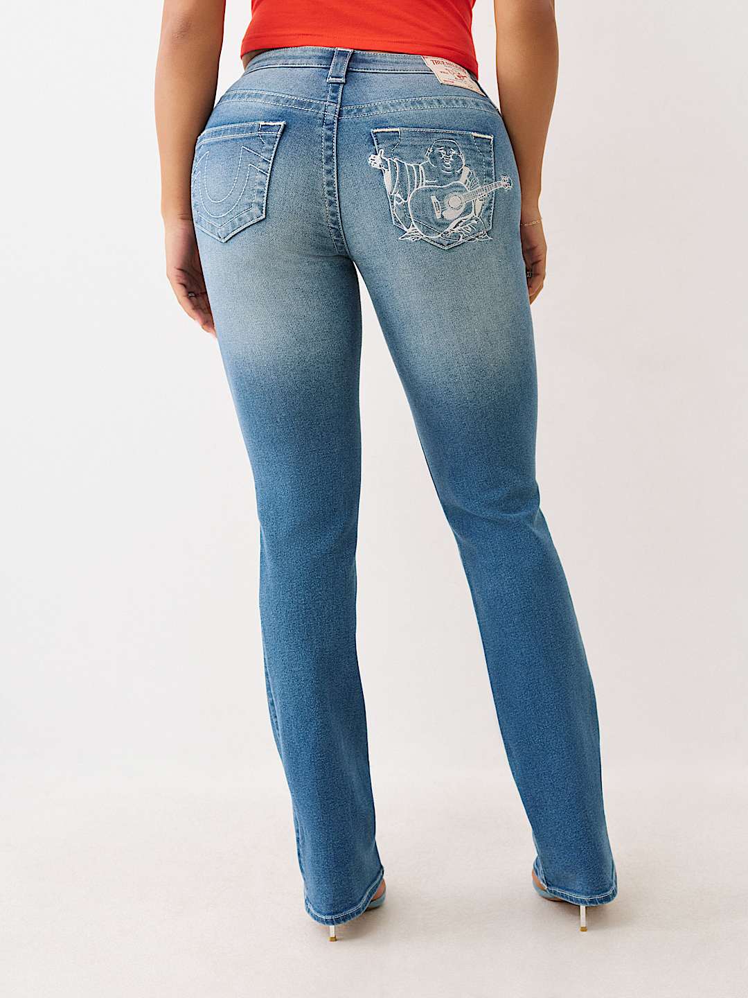 Get all eyes on you in the Billie Mid Rise Buddha Pocket Straight Jean. Crafted in a medium wash, these jeans feature a mid-rise waist, whiskering, and single needle stitching. Complete with horseshoe detailing on one back pocket and an embroidered Buddha logo over the other.