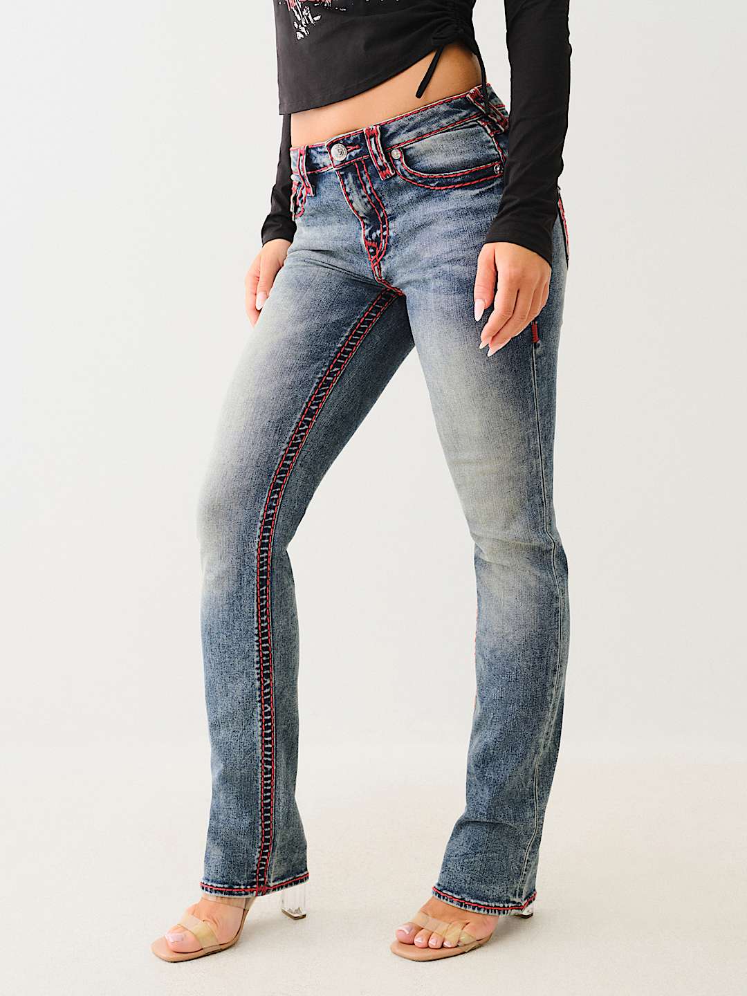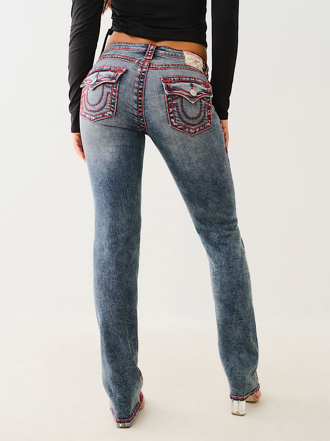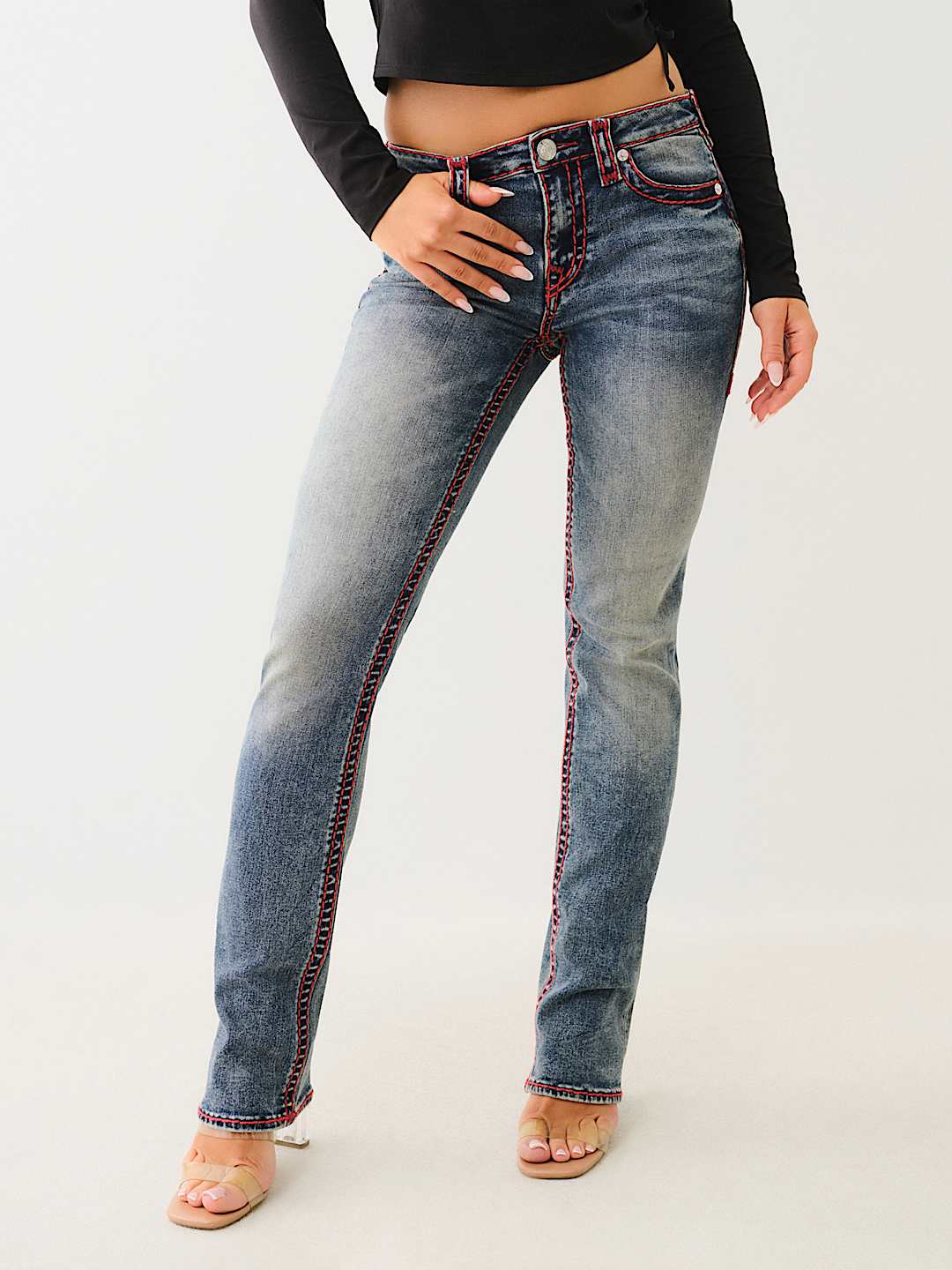 Complete any fit with the Billie Super T Mid Rise Straight Jean. Crafted in a faded medium wash, this pair of women’s jeans feature a zip fly, belt loops, whiskering, and a mid-rise waist. Finished with red Super T stitching and horseshoe detailing on the back flap pockets.