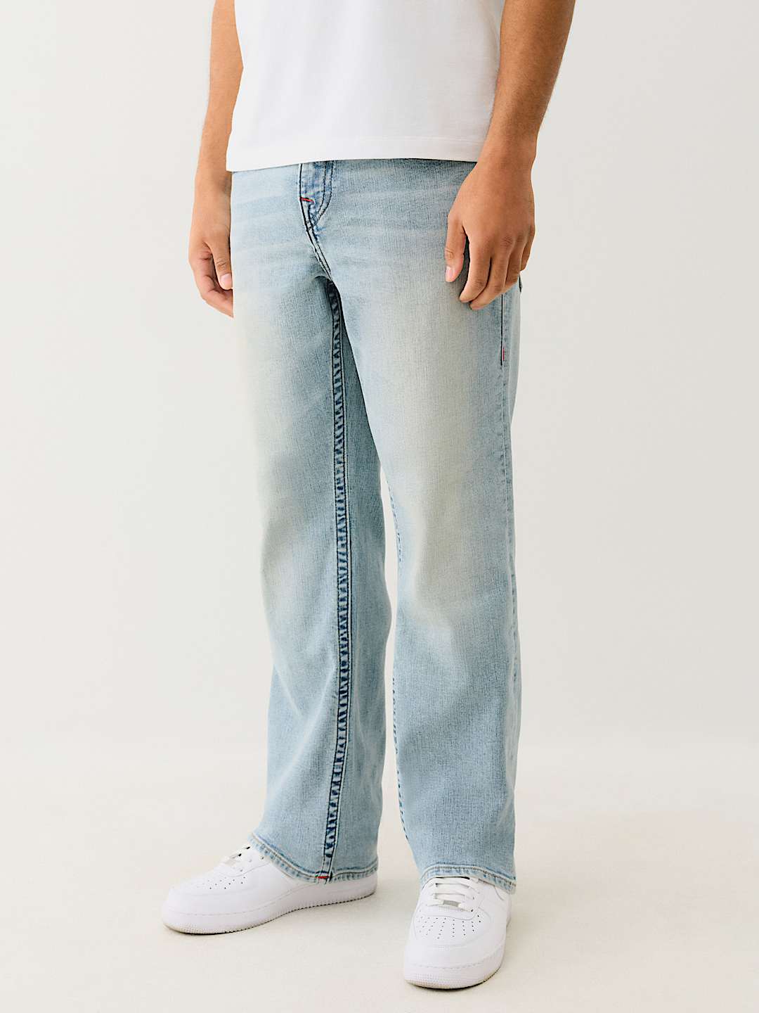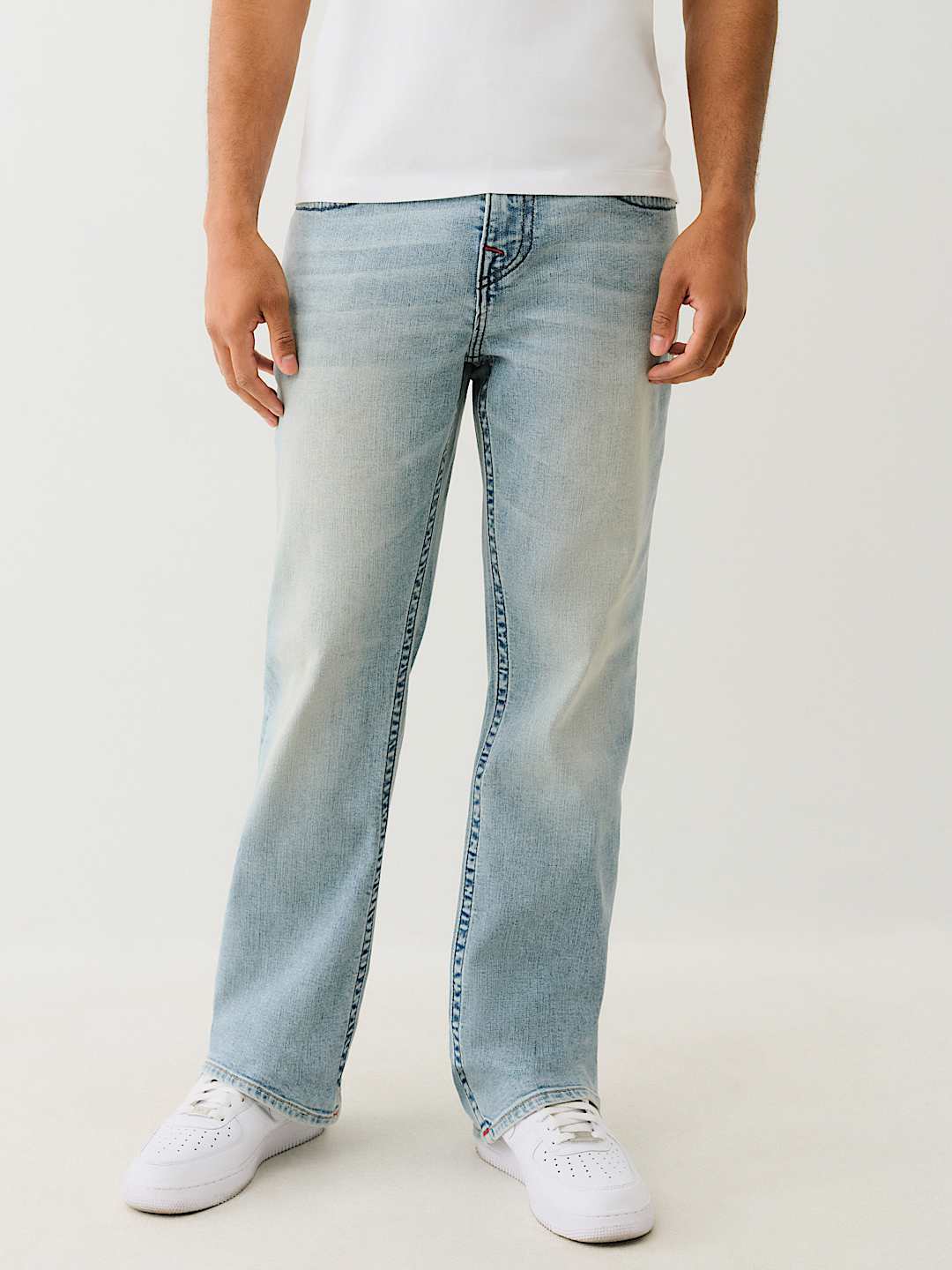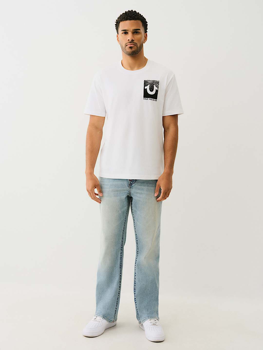 Go from day to night in the Billy Bootcut Jean. Crafted in a classic light wash, this pair of jeans features a zip fly, belt loops, whiskering, and a 34” inseam. Complete with single needle stitching and red horseshoe detailing on the back flap pockets.