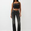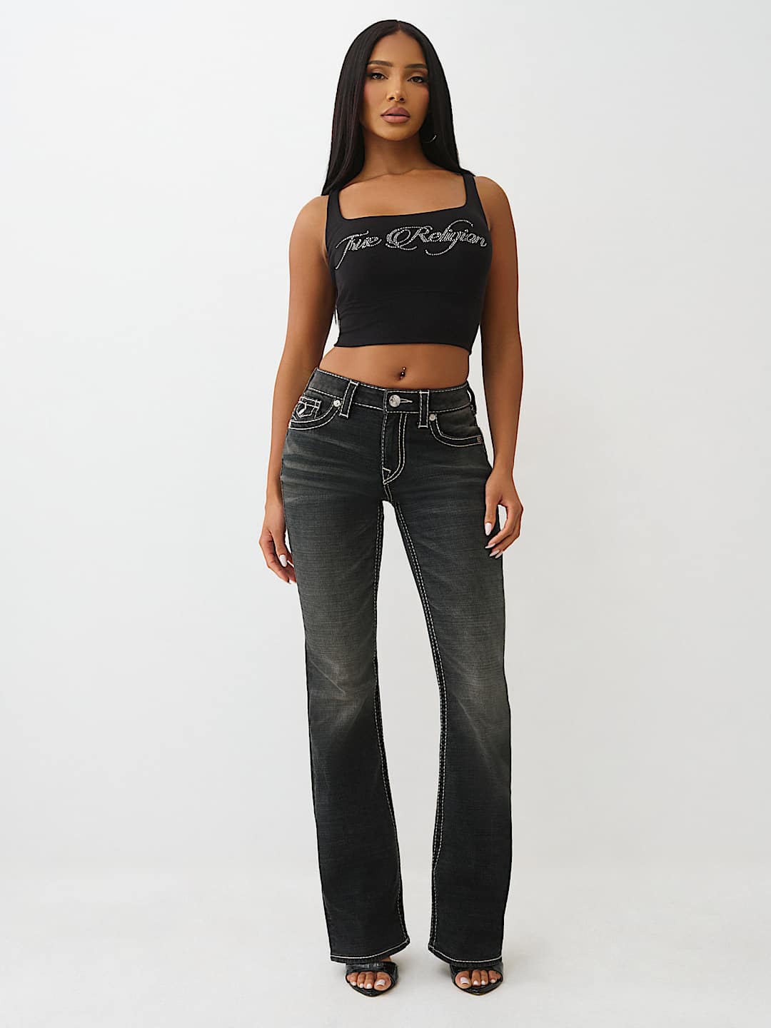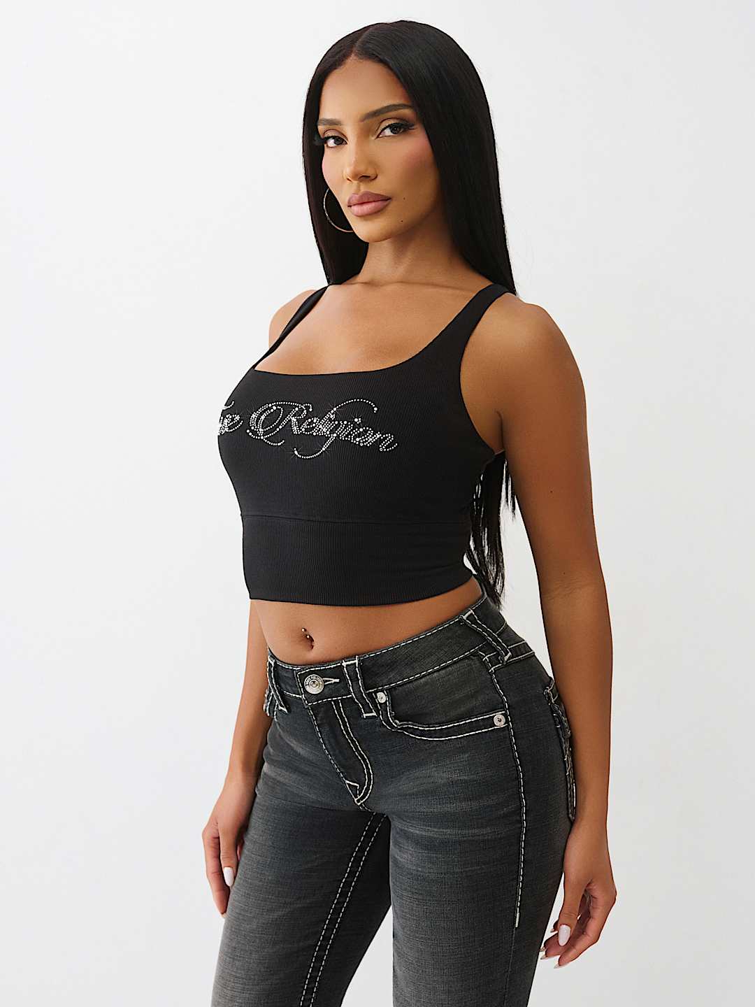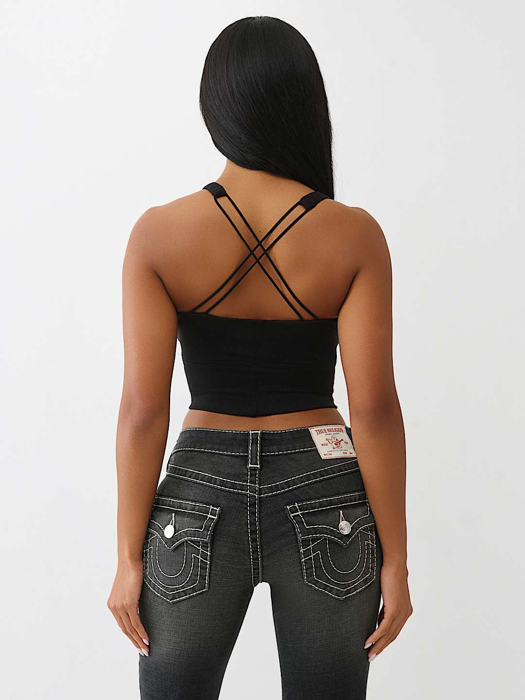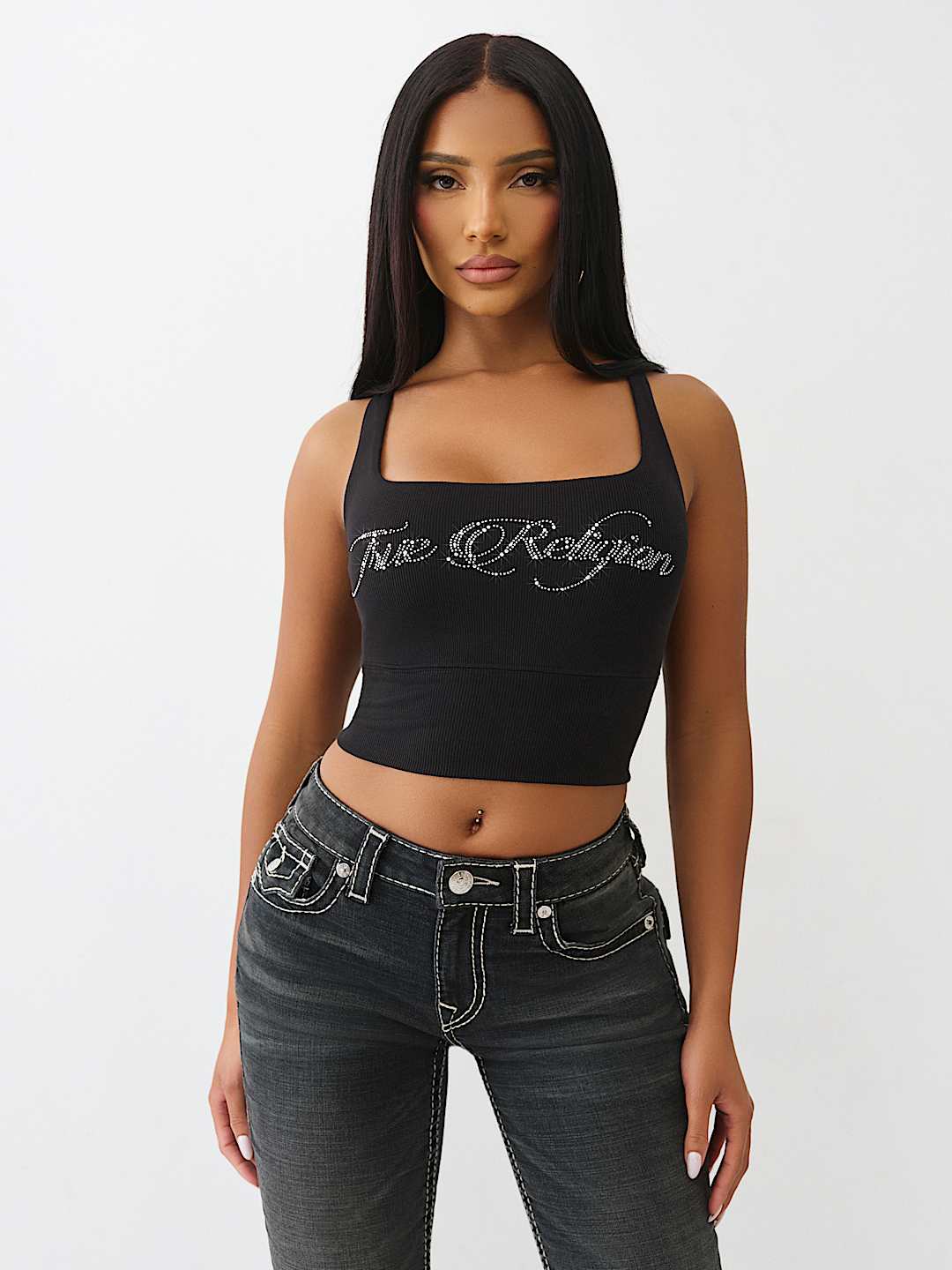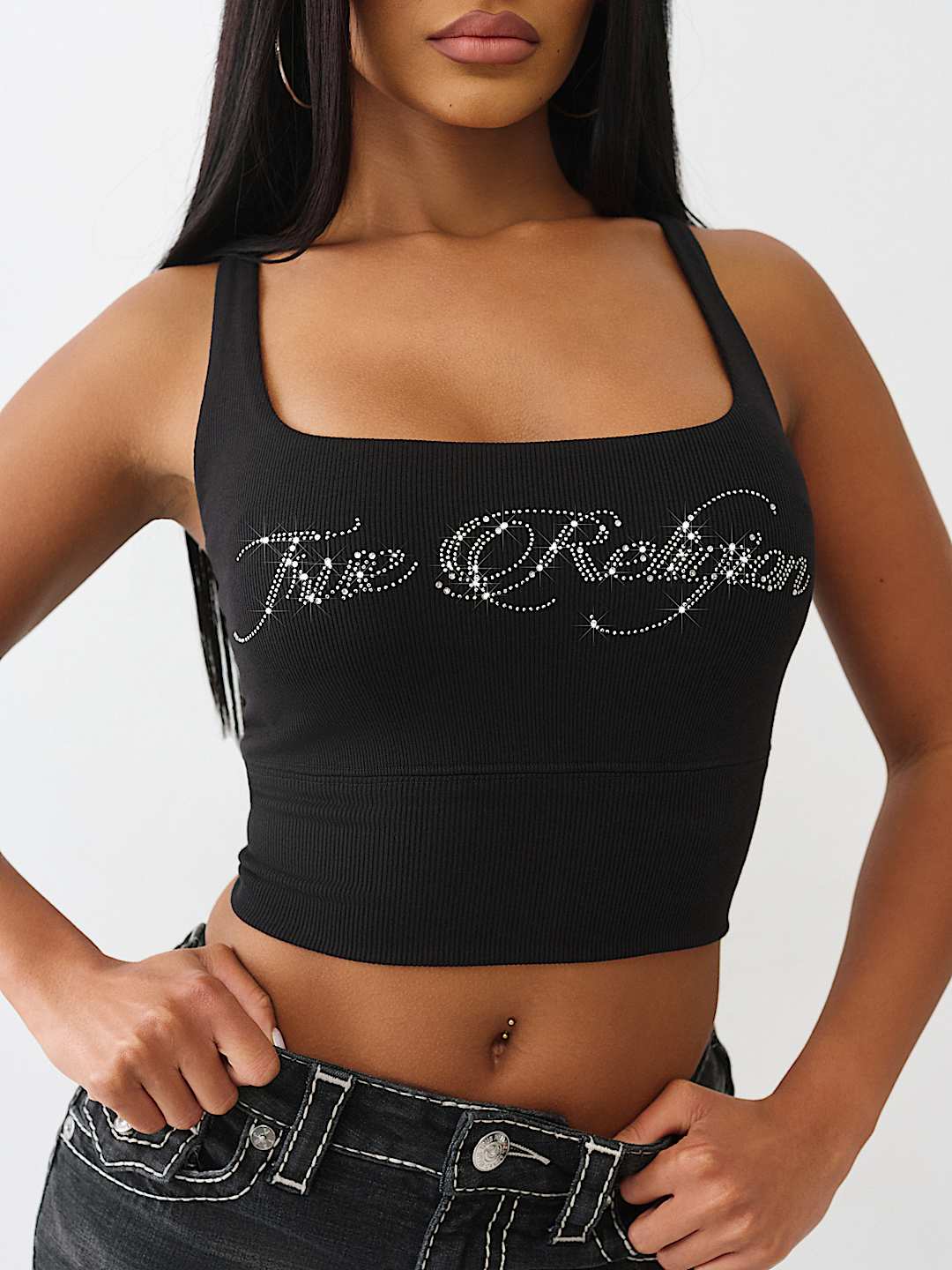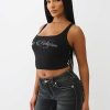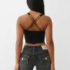 Own the room in the Cropped Strappy Ribbed Tank. This sexy, square-neck top is finished with a layered, strappy crossback and a bedazzled crystal logo on the front.