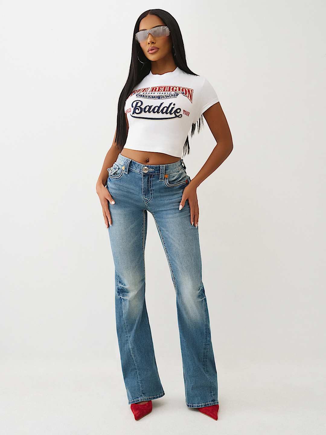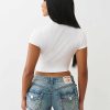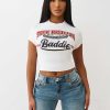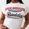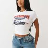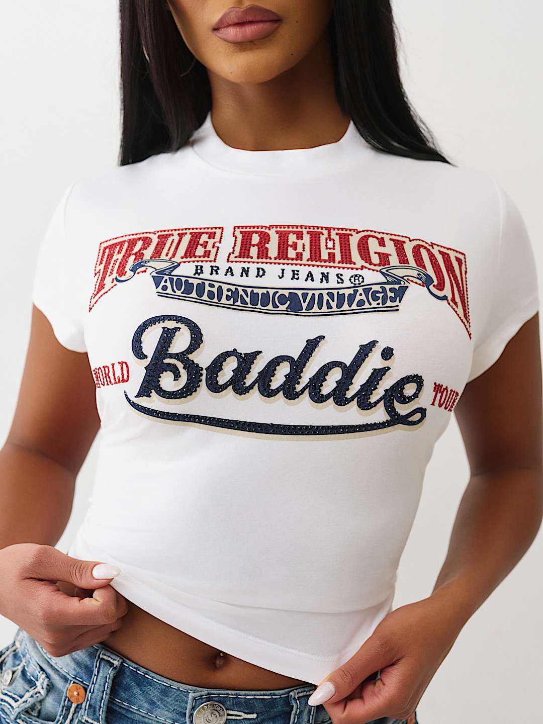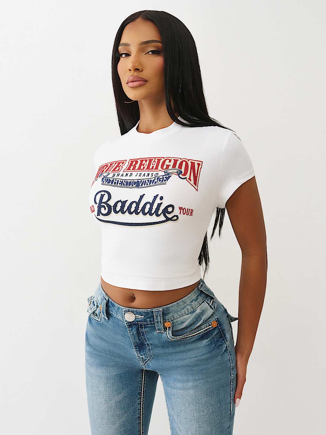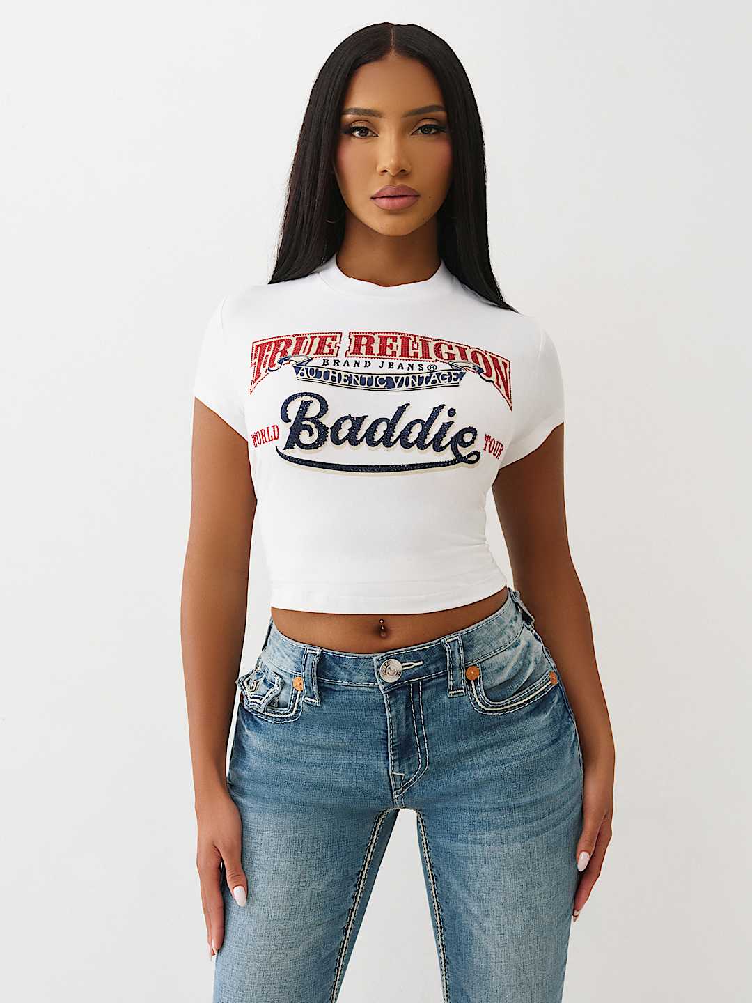 Let your tee say it all in the Crystal Baddie Baby Tee. Featuring a cropped fit, this crewneck baby tee is finished with cap sleeves and a crystal-detailed True Baddie logo.