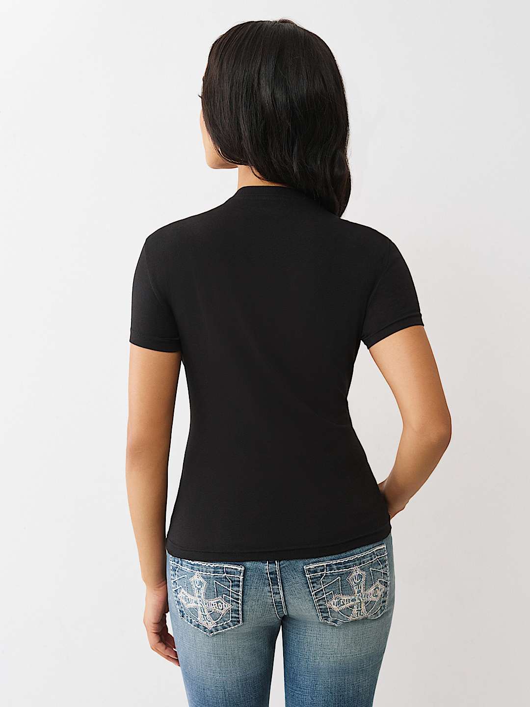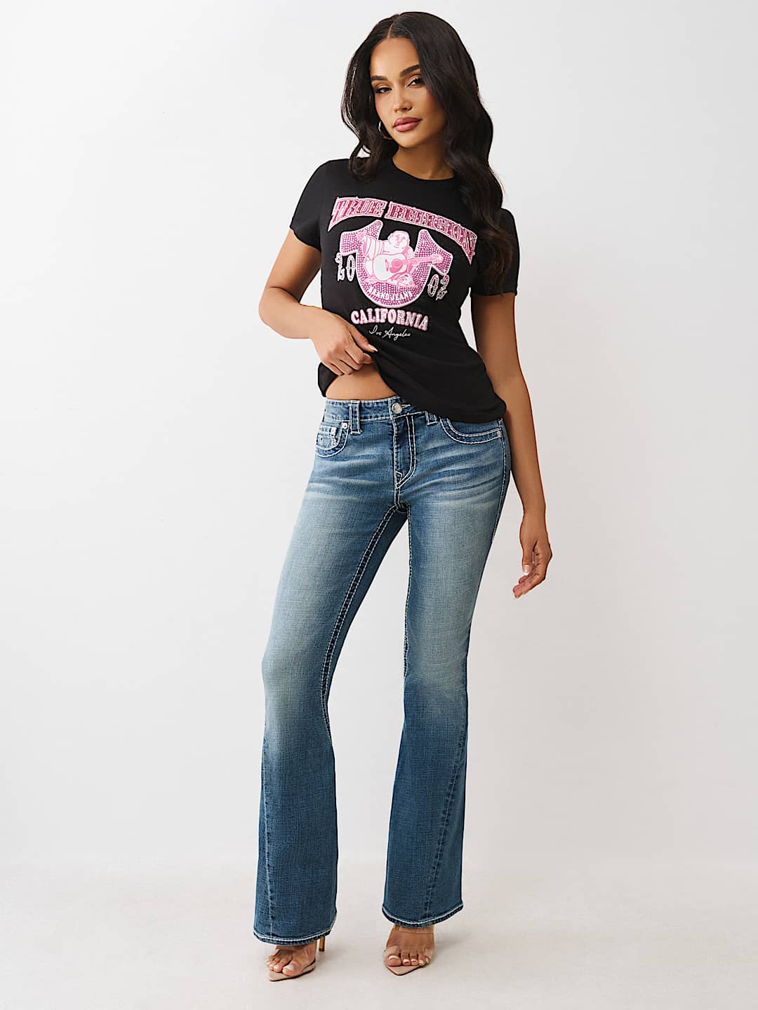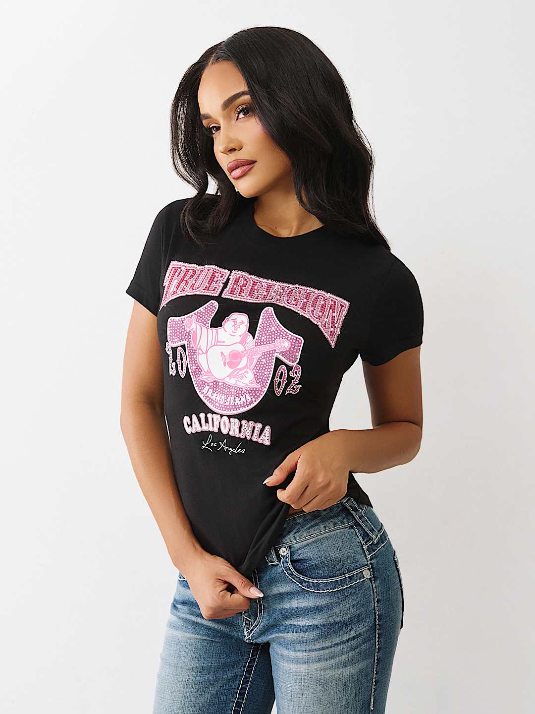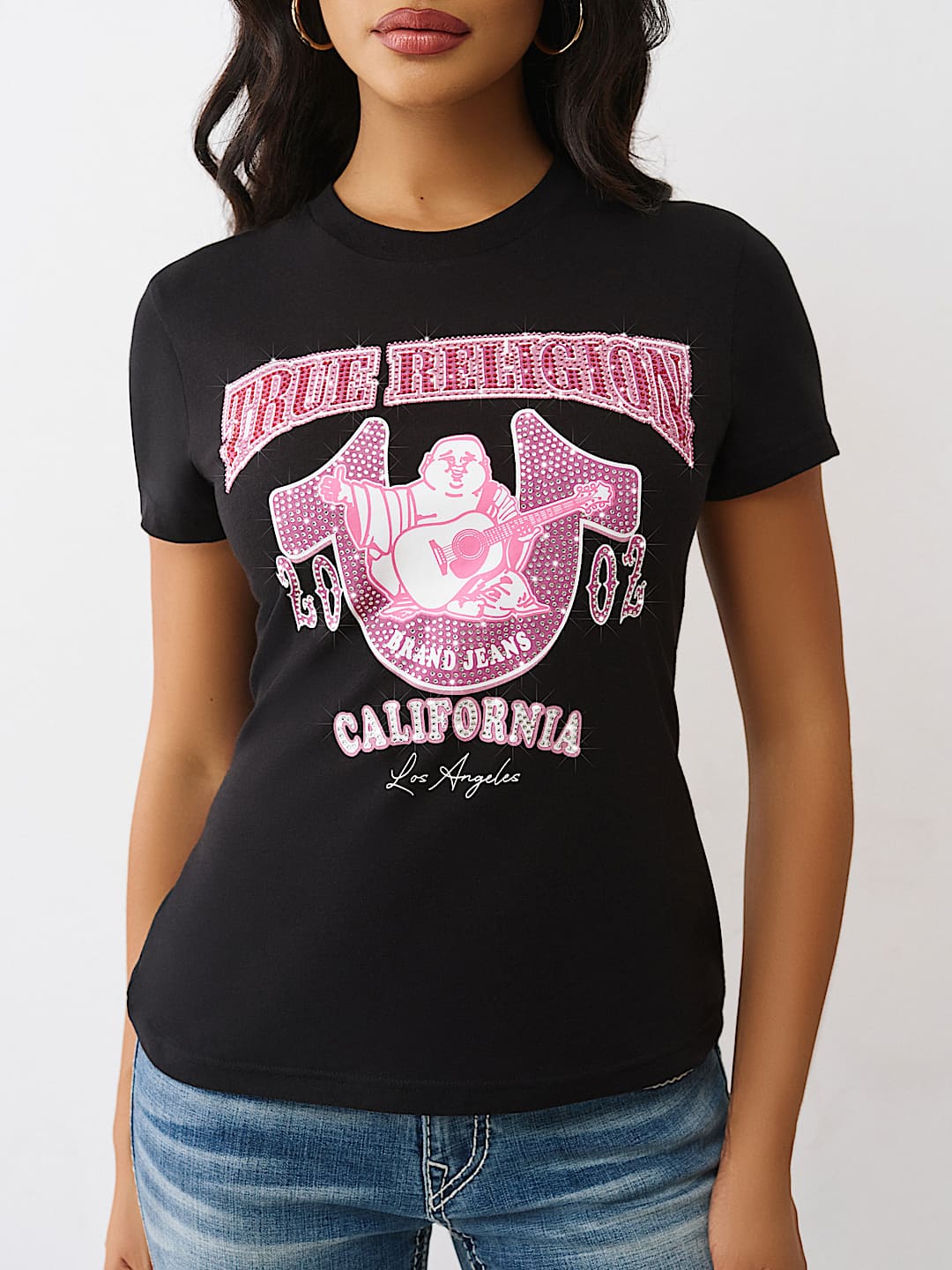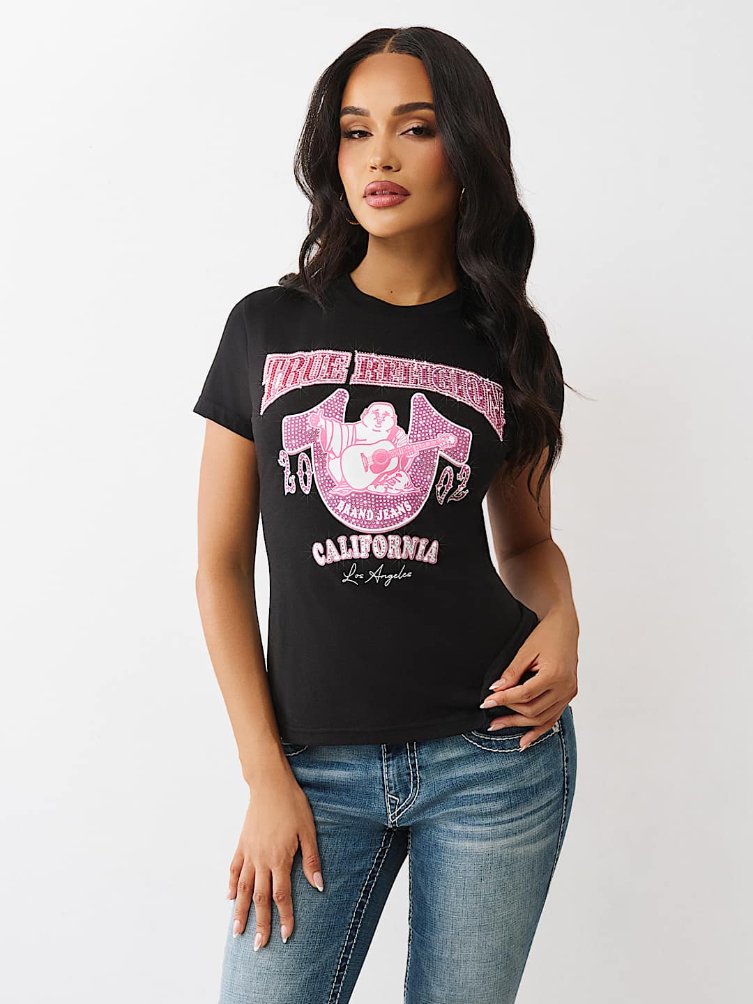 The Crystal Buddha Crew Tee is made to make you stand out. This classic crewneck features a branded Buddha graphic on the front, with crystal details that add just the right amount of bling and glam—because basic isn’t in your vocabulary.