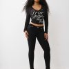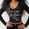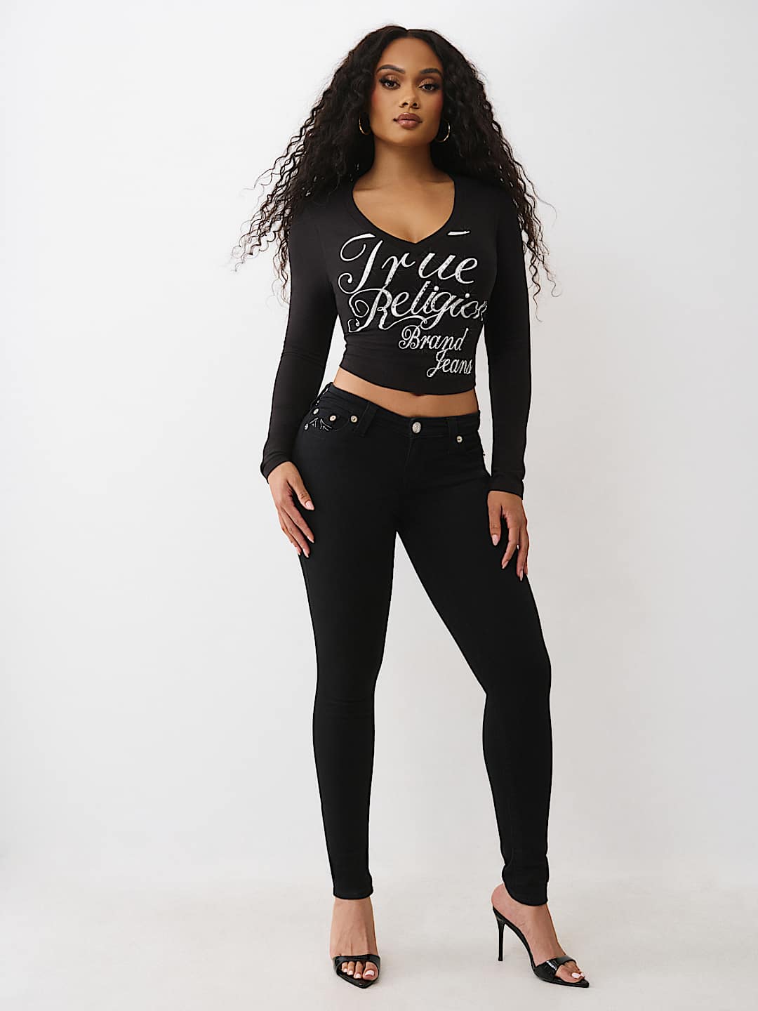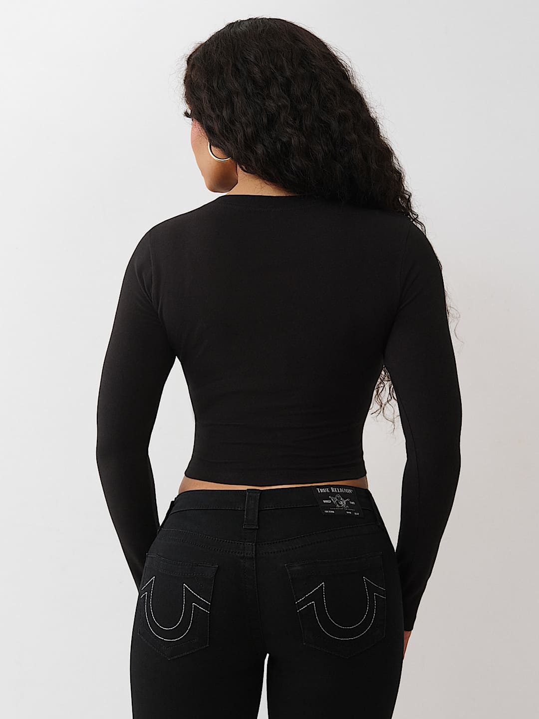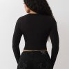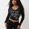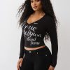 Make a statement in the Crystal Logo V Neck Long Sleeve Tee. Featuring branded cursive script on the front, this long-sleeve V-neck shirt adds a new spin to an everyday staple.