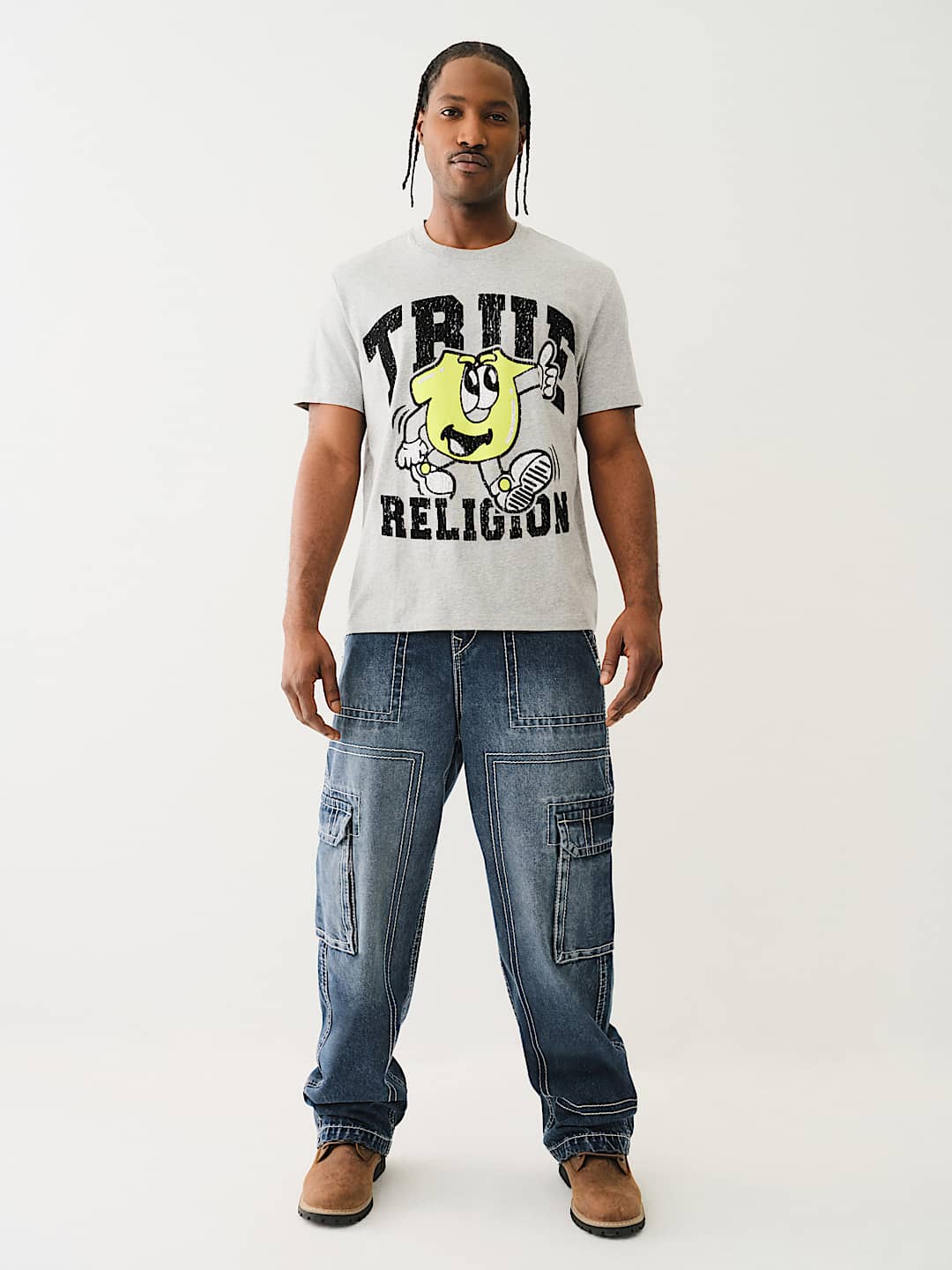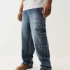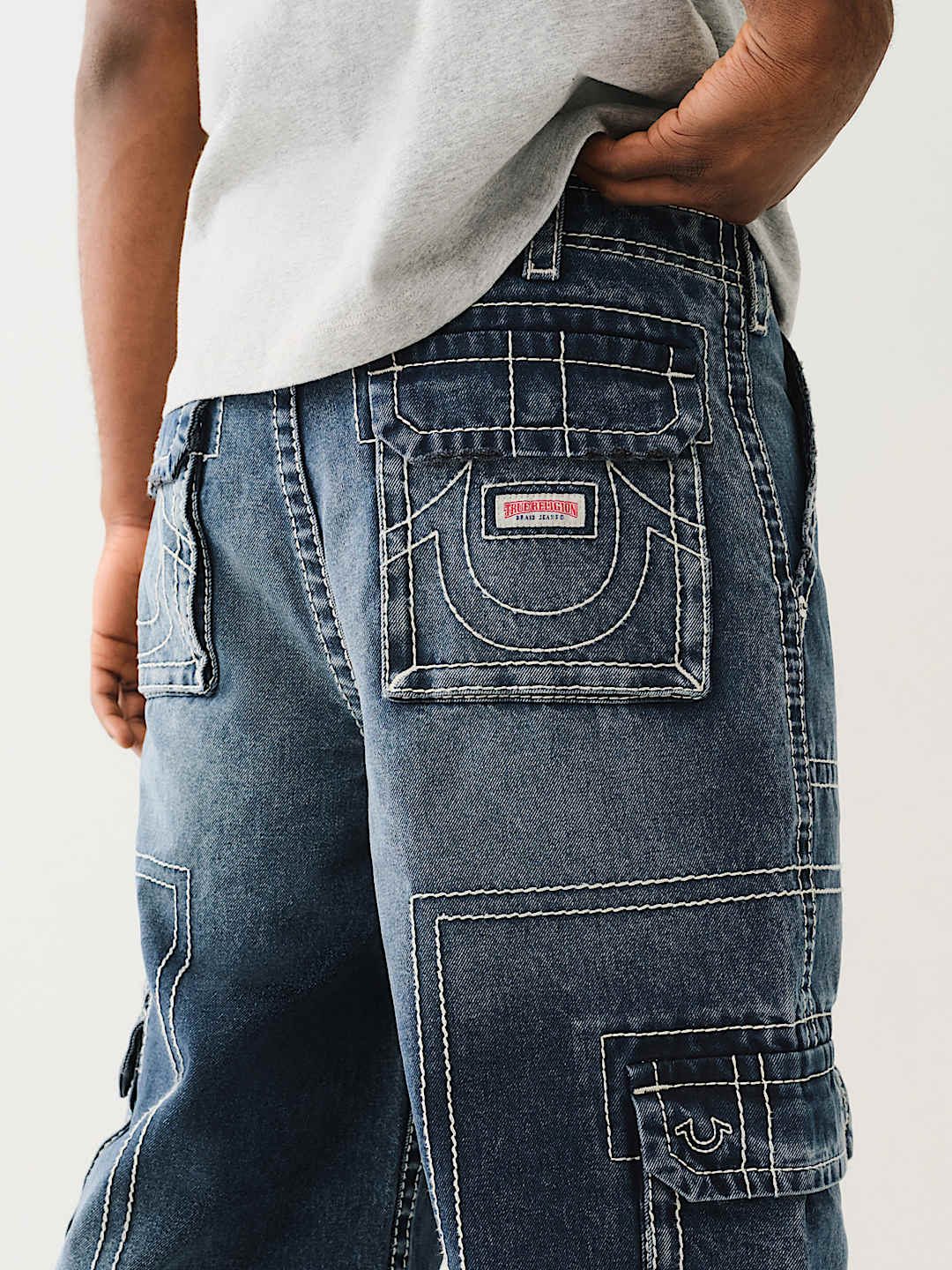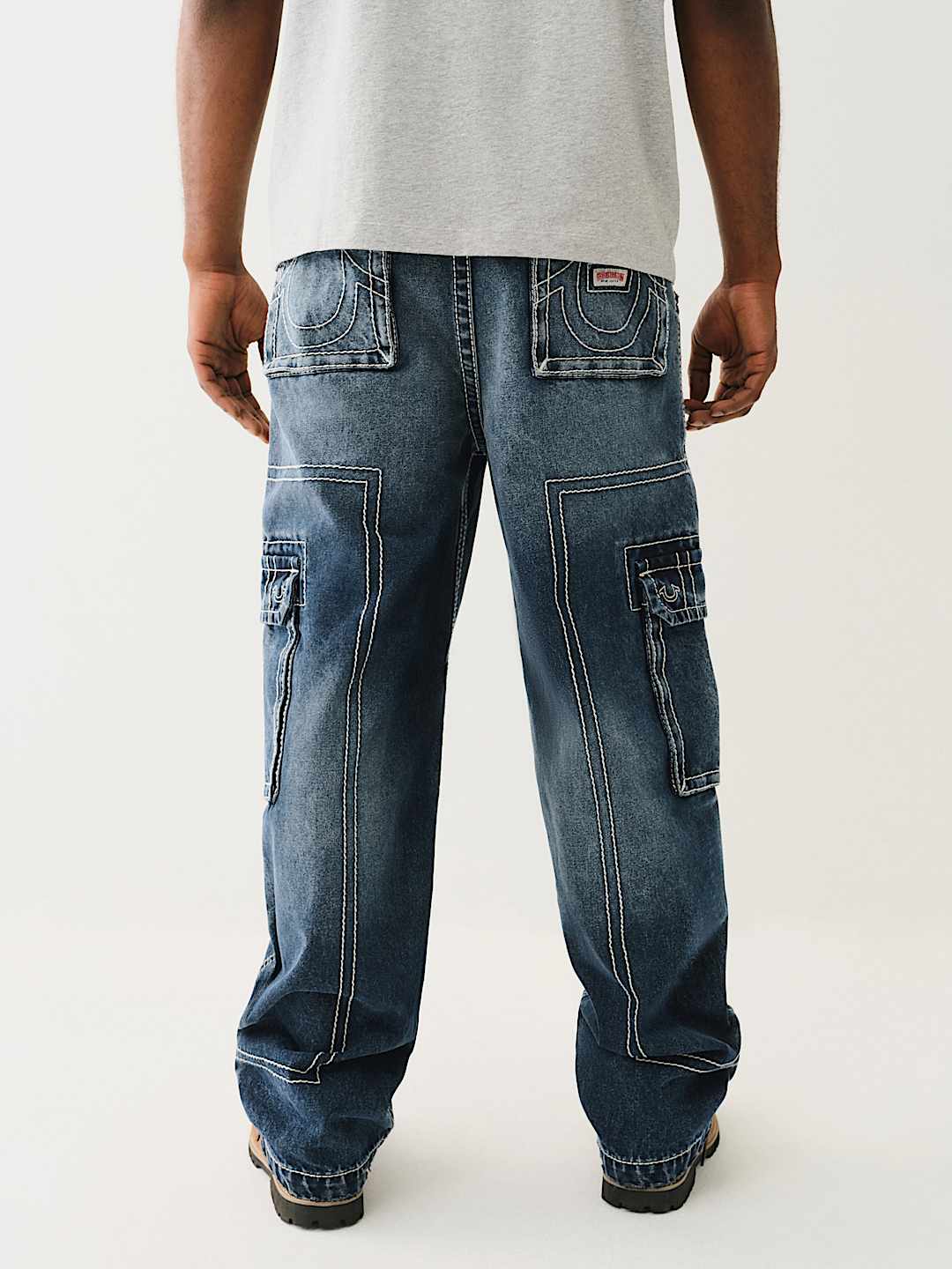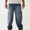Go big or go home with the Denim Big T Cargo Pant. This carpenter-inspired baggy jean is crafted in a dark wash and features a zip fly, belt loops, side cargo pockets, and a concealed drawstring waistband to keep everything up. Finished with Big T stitching and horseshoe detailing on the back cargo pockets.