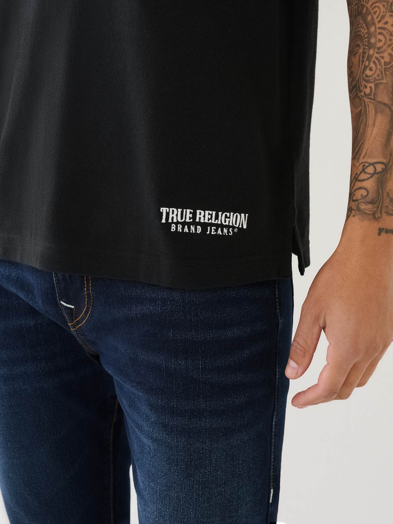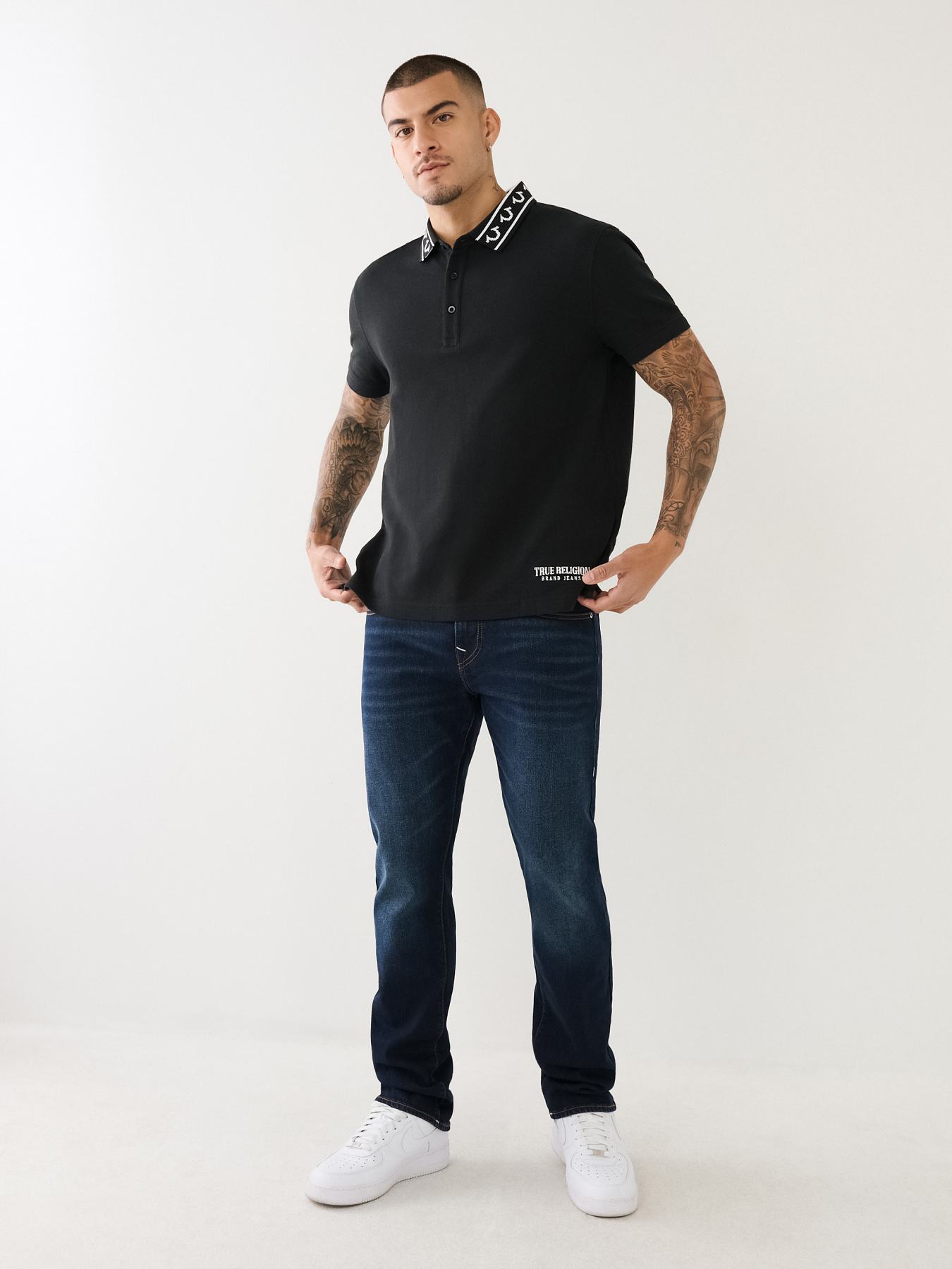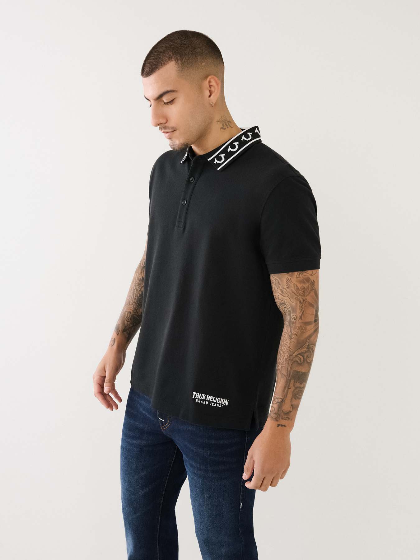 Our Embroidered Designer Brand Polo Shirt is perfect to wear from day-to-night. Featuring a basic collar with horseshoe graphics throughout, half-button placket, short sleeves, and a relaxed fit. Complete with an embroidered Designer Brand text graphic at the front.