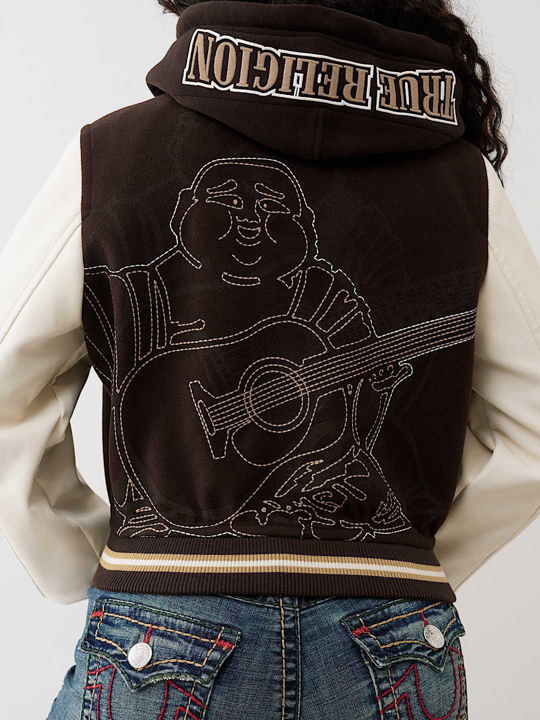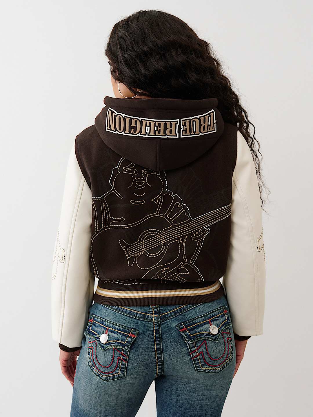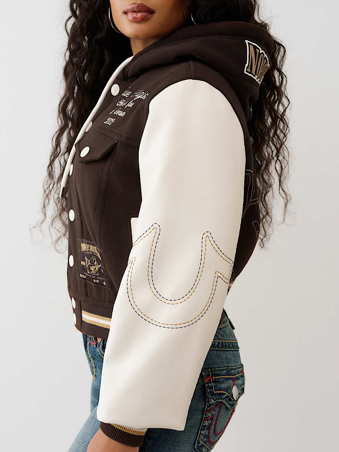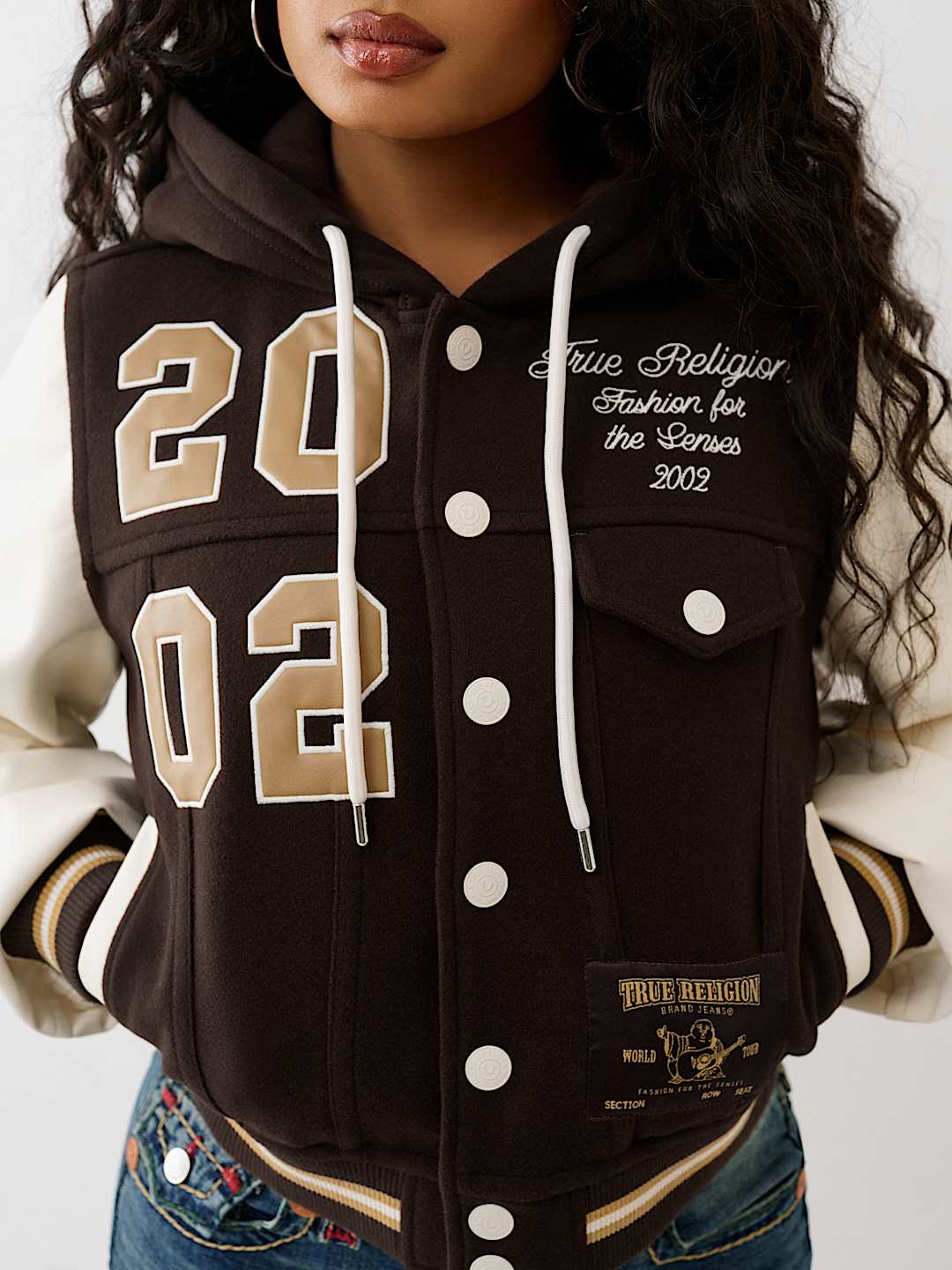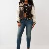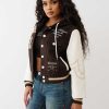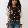 The Embroidered Varsity Jacket is a wardrobe winner, year after year. Featuring varsity-striped trim and a two-tone body and sleeves, this jacket is finished with embroidered heritage iconography throughout for that True finish.