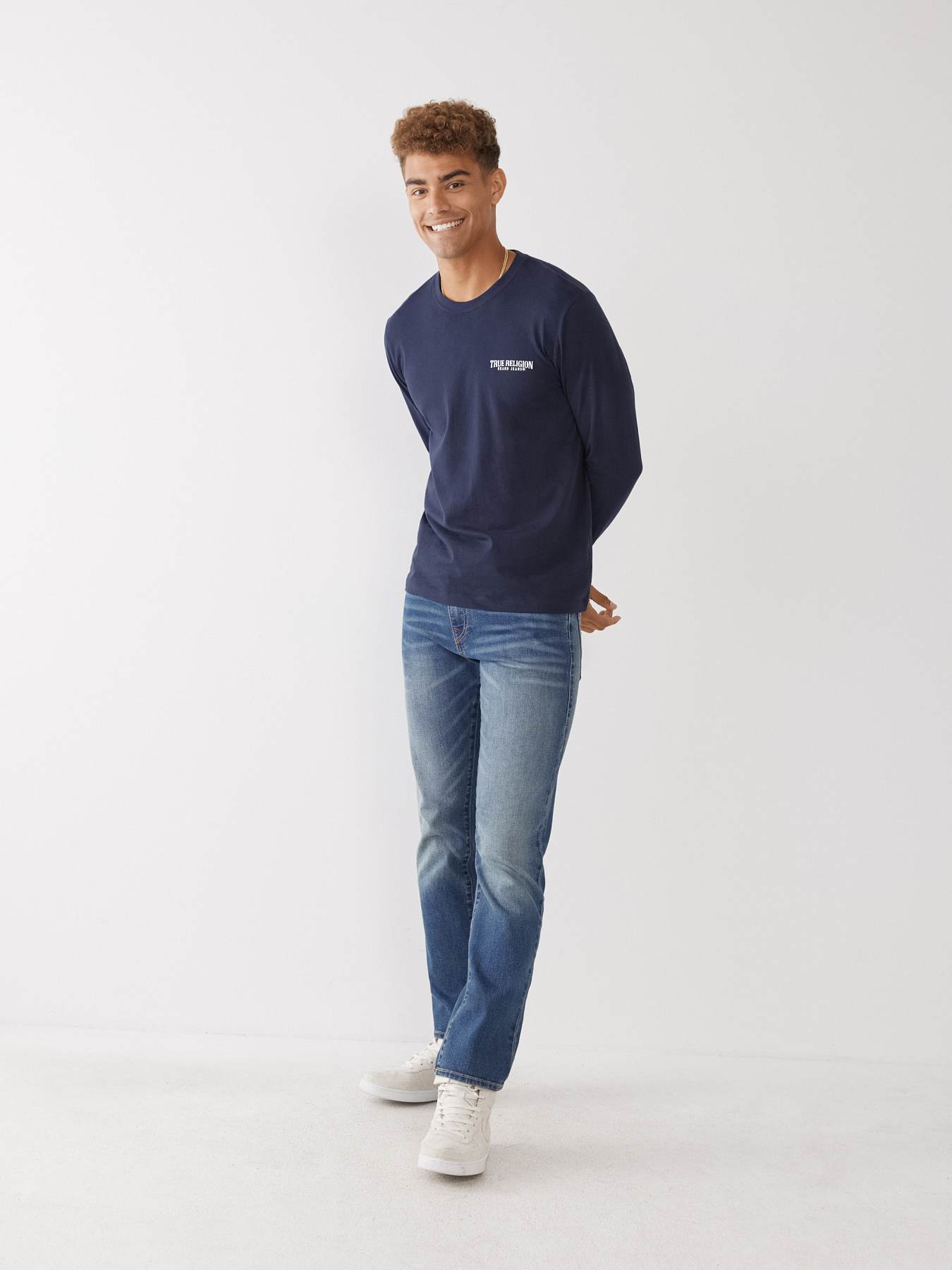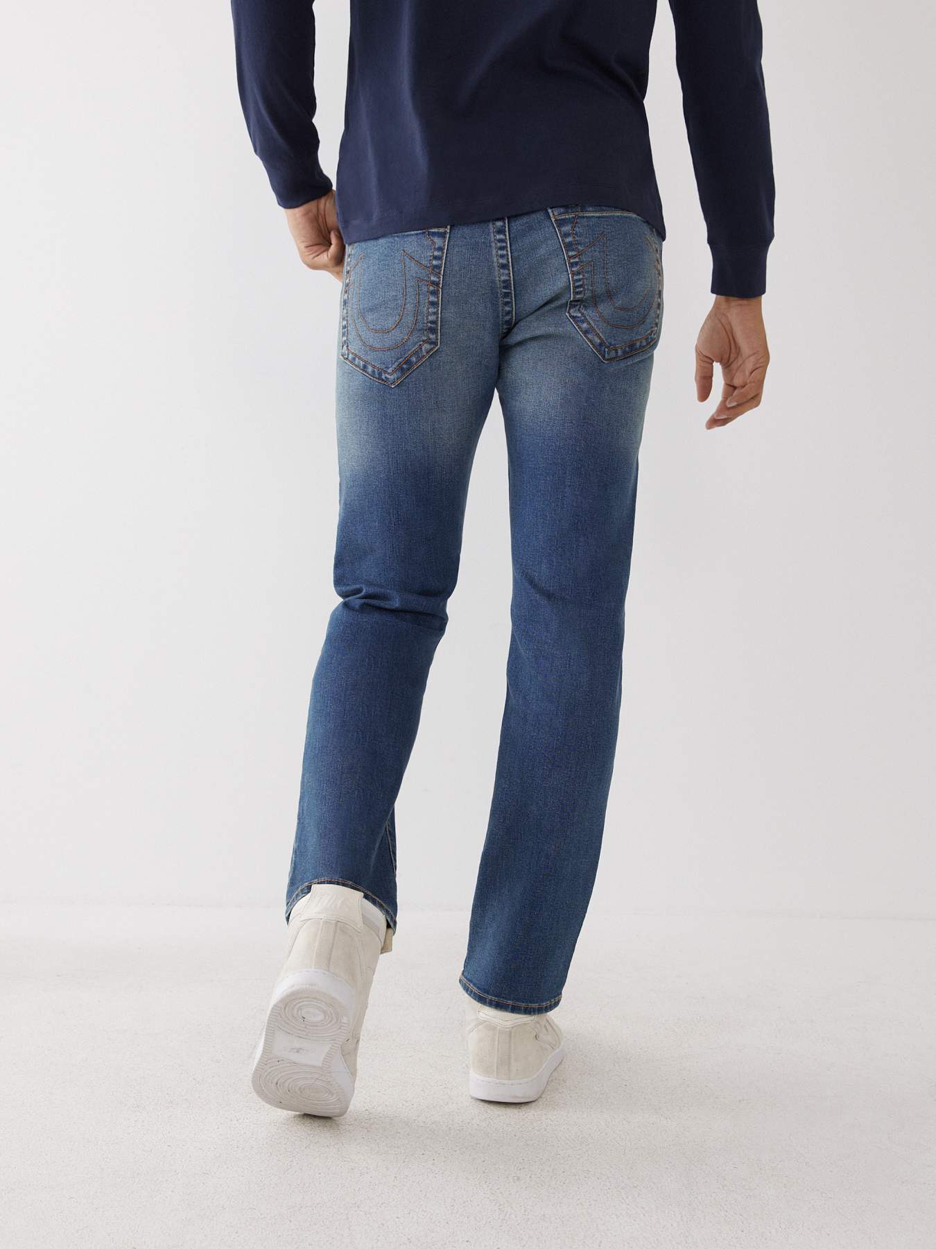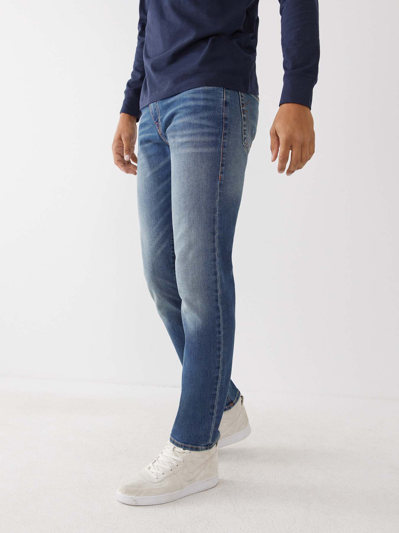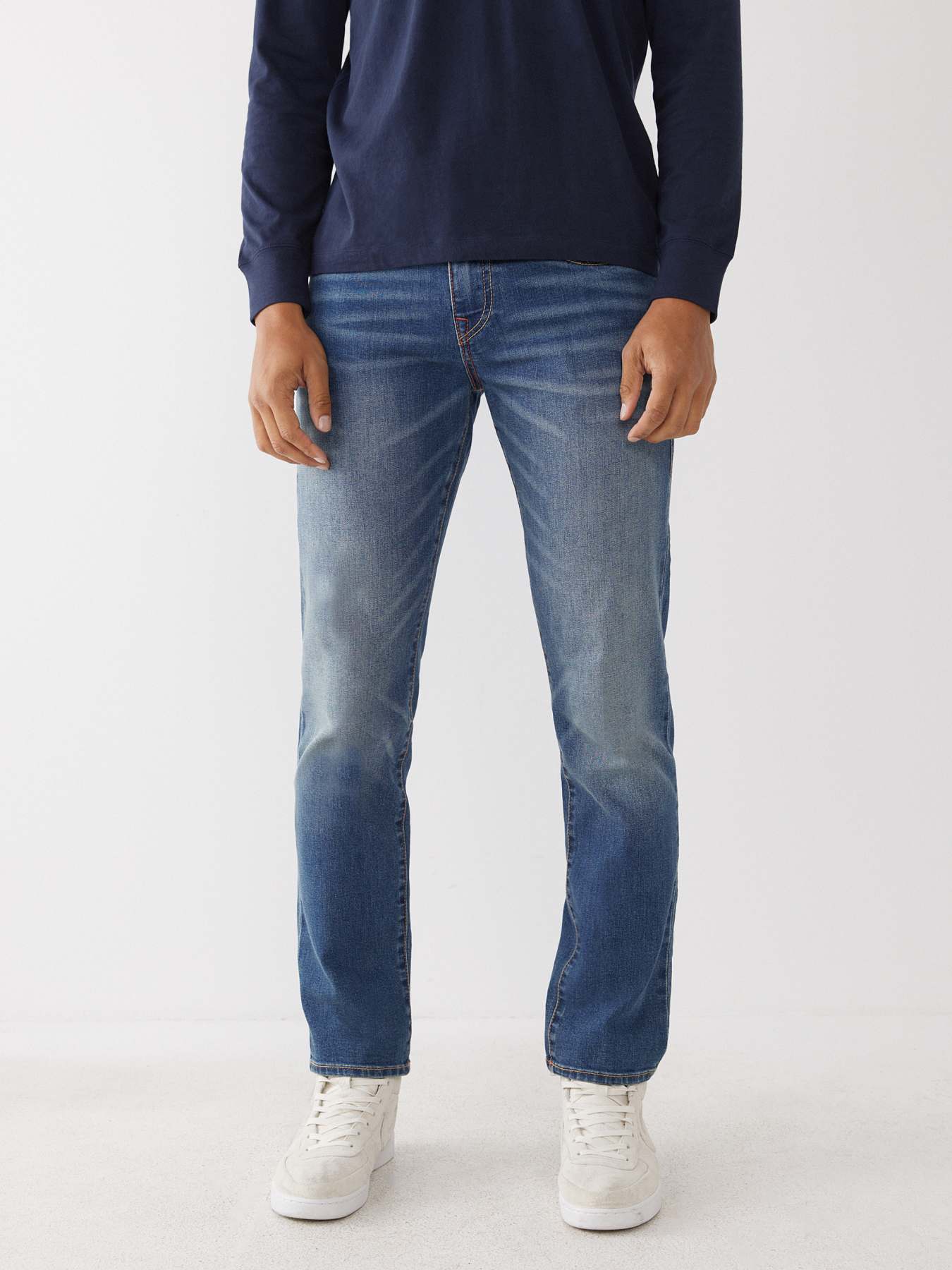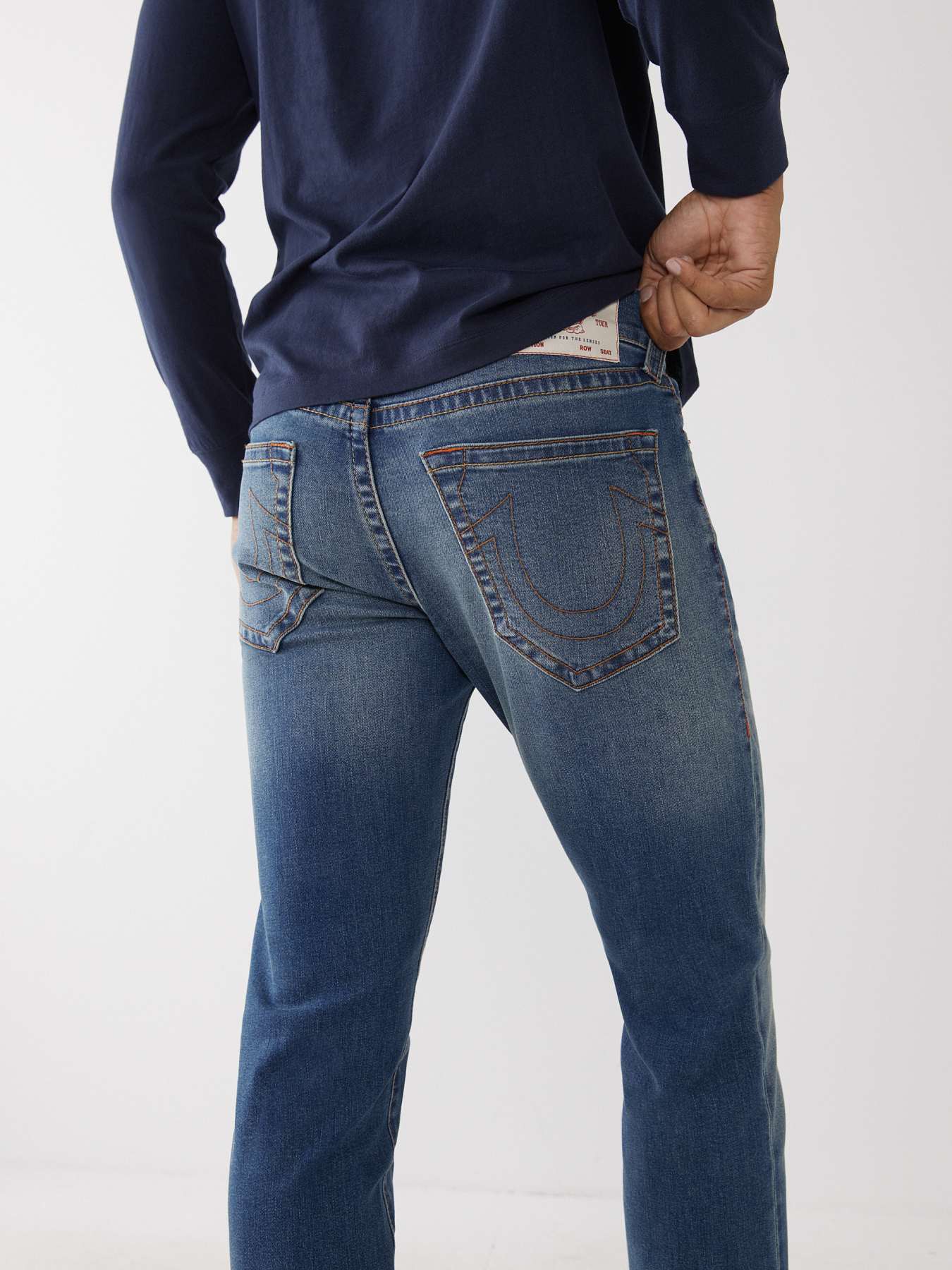 The Geno Slim Jean is not too fitted and not too roomy. This men's slim jean features fading, 3D whiskering, and two-tone gold stitching. Finished with 1/2 inch horseshoe detailing along the back pockets and a slightly shorter 32" inseam.