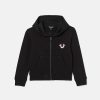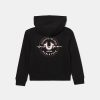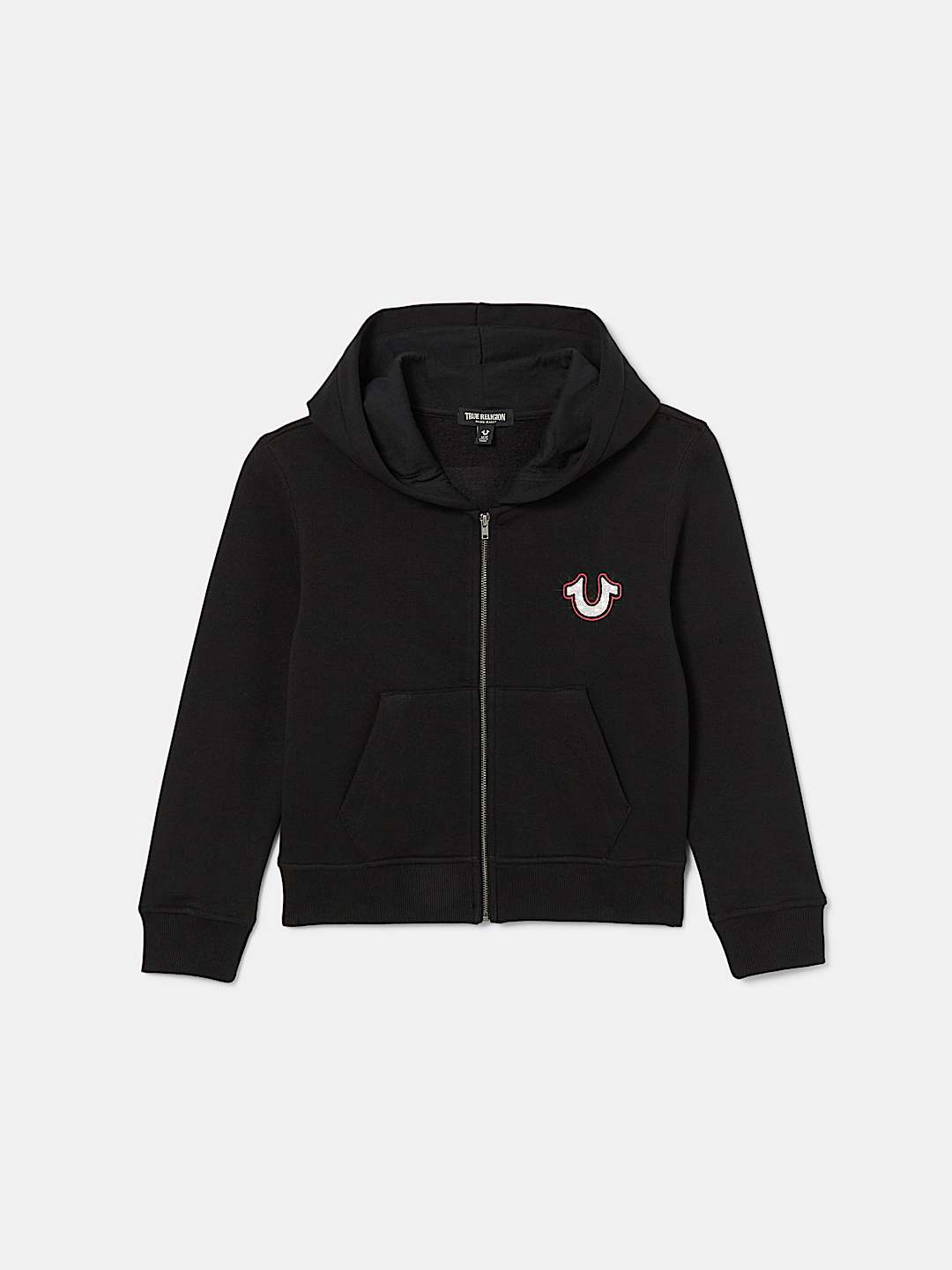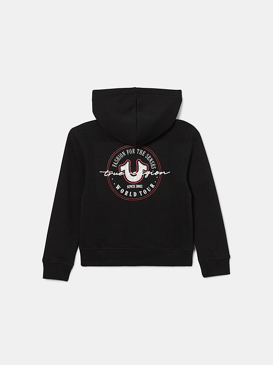 Shine bright and stay cozy in the Kids – Girls Glitter Logo Zip Hoodie. This fleece-lined hoodie features a zip-up front and split kangaroo pocket. Finished with a metallic horseshoe and Designer Brand World Tour logo.