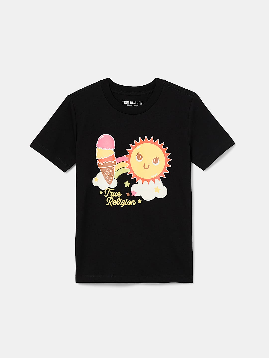 Spread good vibes in the Kids – Happy Sunshine Tee. Crafted from 100% cotton, this T-shirt features a crew neck, short sleeves, and an ice cream and sun graphic to brighten their mood.