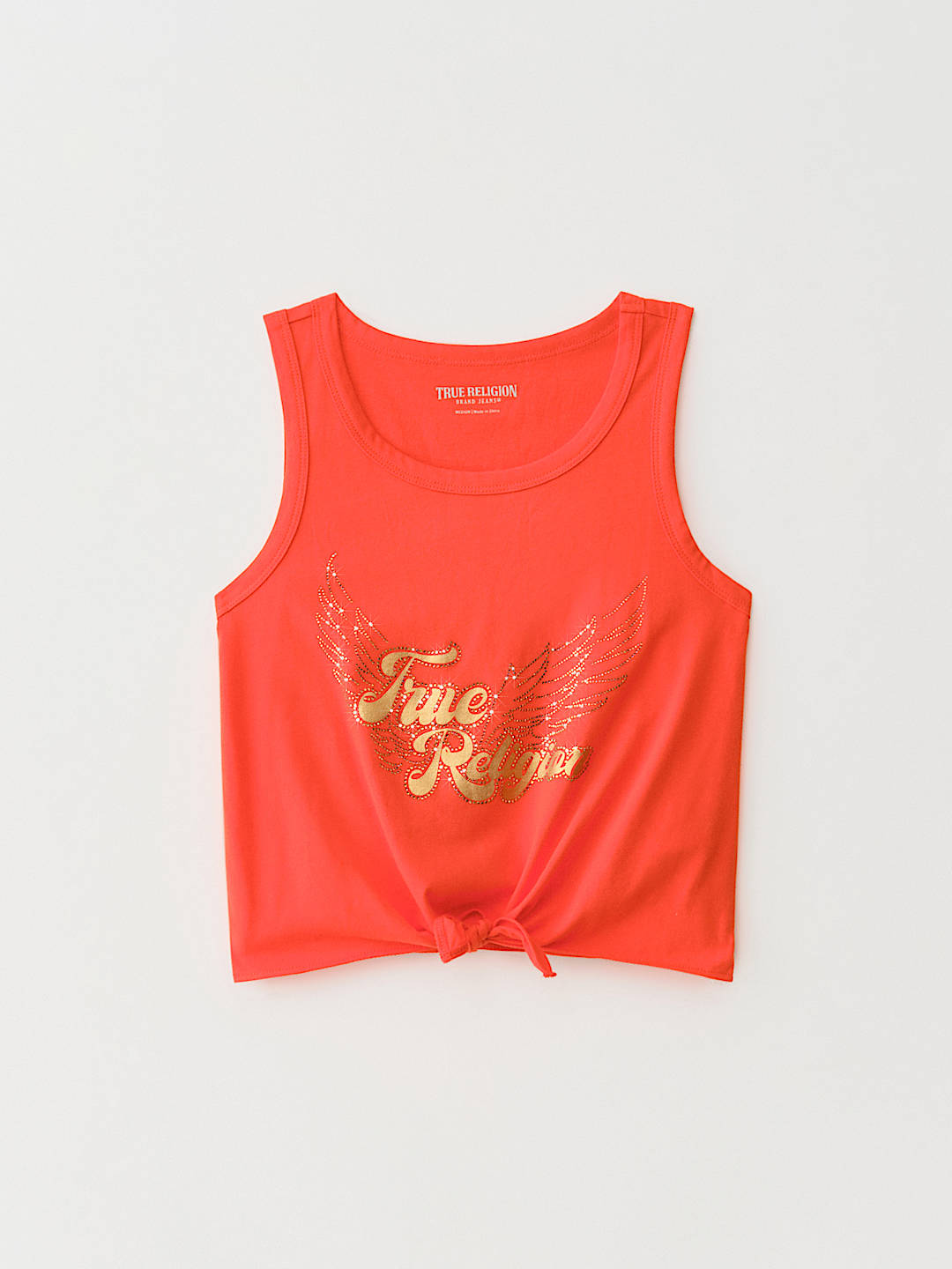 The Kids – Girls Iridescent Winged Logo Tie Tank Top is perfect for warmer days. Crafted in a soft cotton blend, this tank top features a scoop neck and a stylish self-tie knotted hem. Finished with an iridescent Designer Brand logo and crystal-detailed wings.