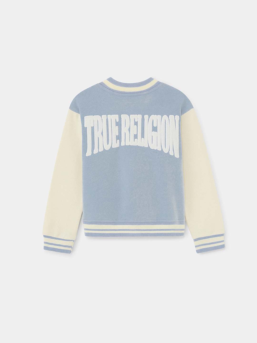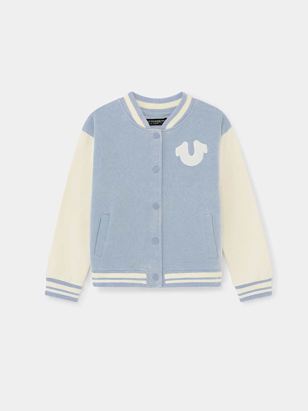 You’re the star player in The Kids – Girls Logo Varsity Jacket. Featuring varsity-striped trim, slanted side pockets, and a two-tone body and sleeves, this jacket is finished with a signature horseshoe on the chest and branded logo on the back.