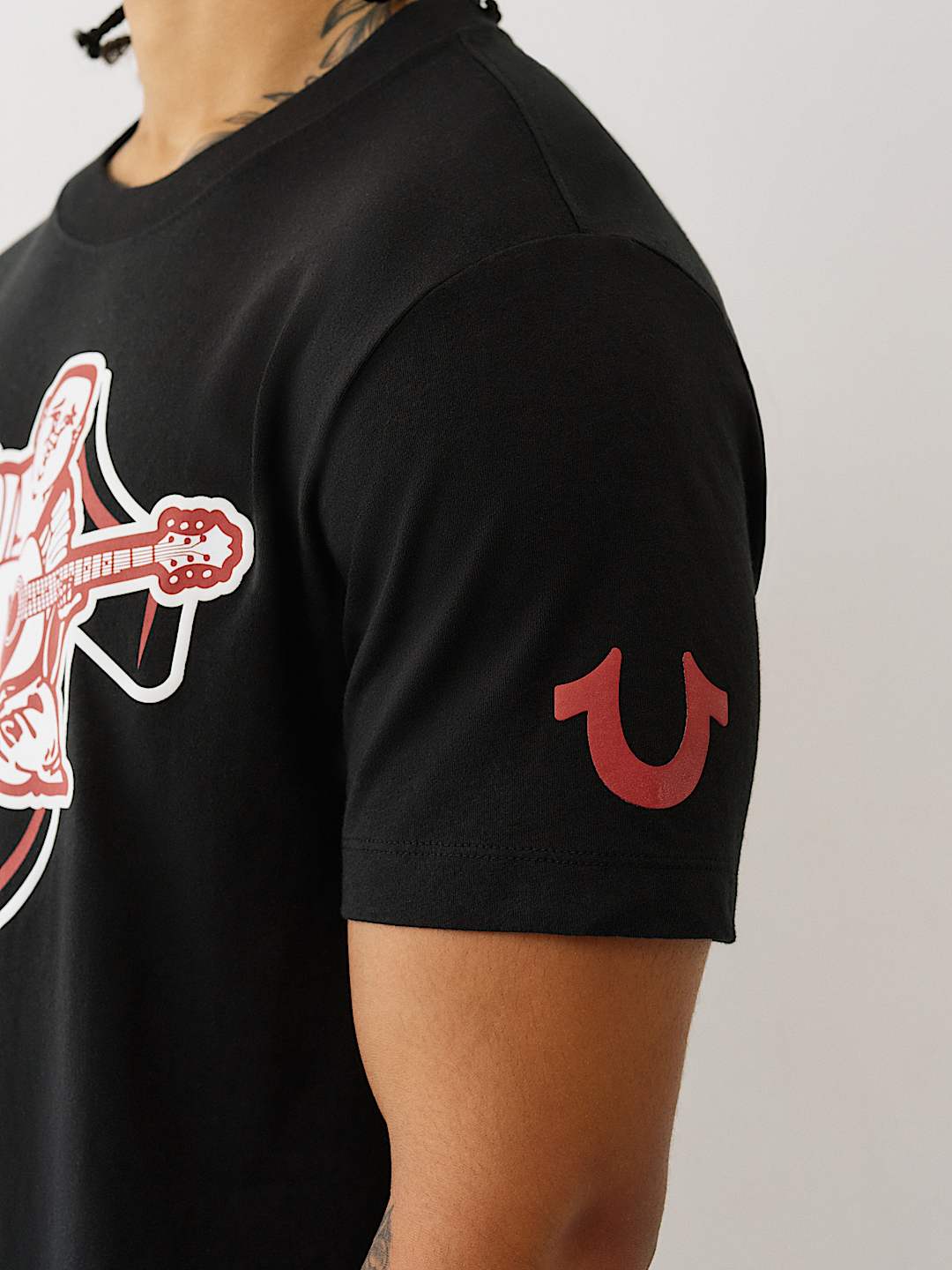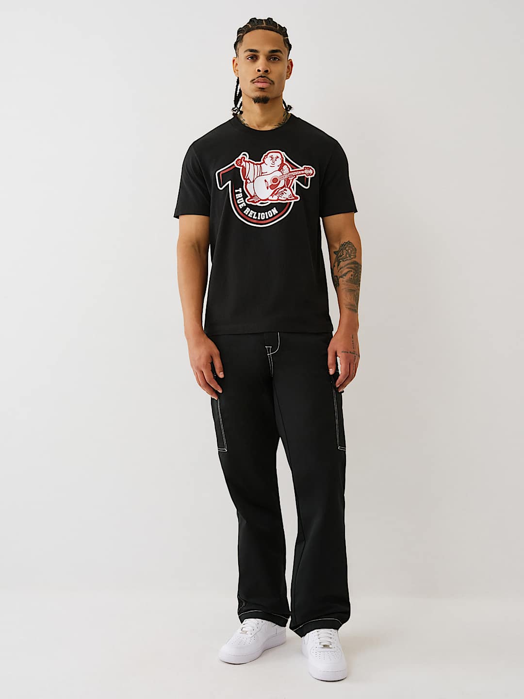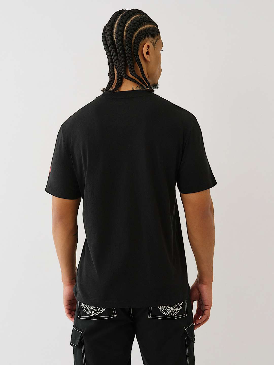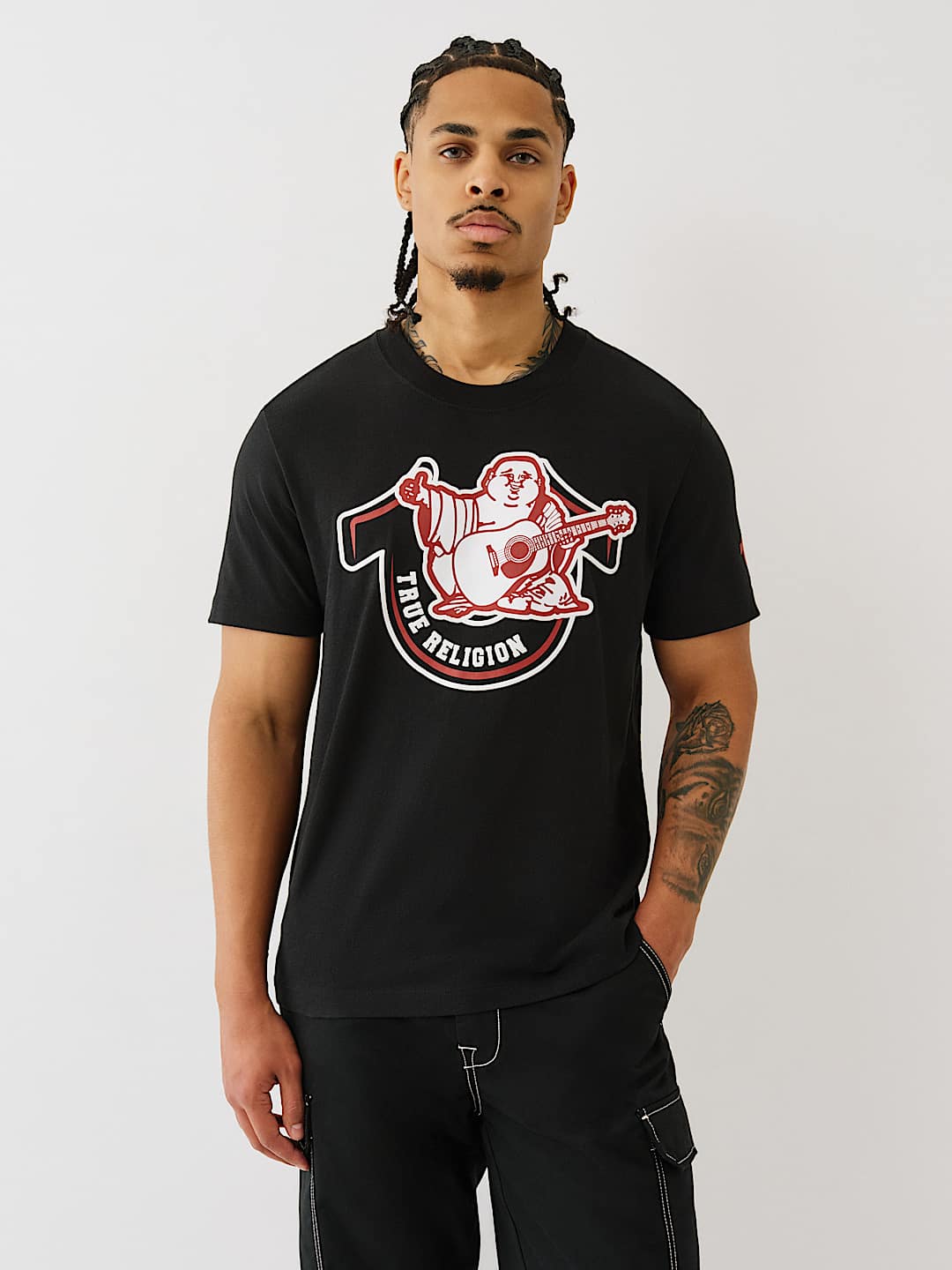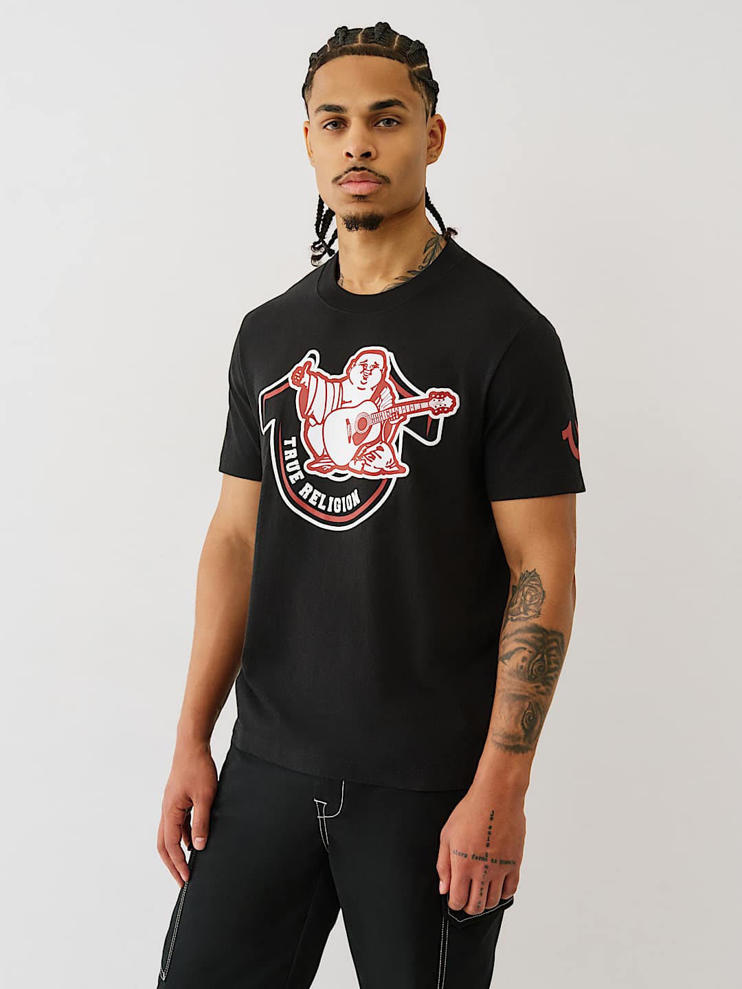 The Horseshoe Buddha Tee is an everyday staple built to bless. Made from 100% cotton, this comfortable crewneck T-shirt features a unique asymmetrical Buddha graphic print on the chest and a signature horseshoe logo on the sleeve.