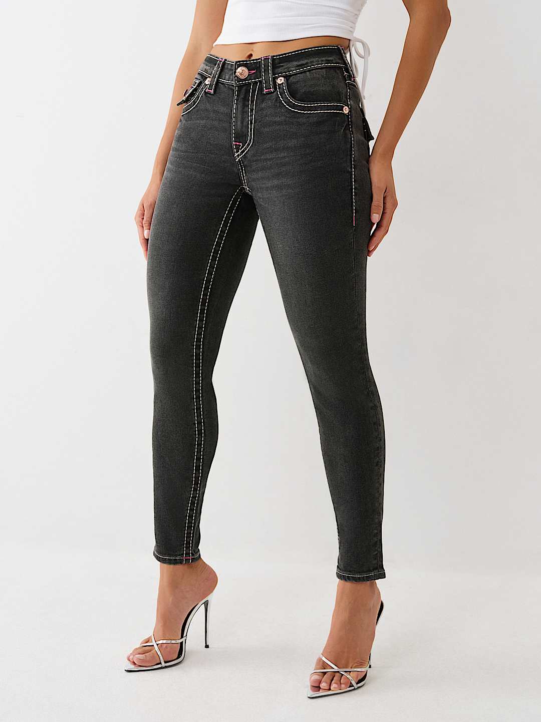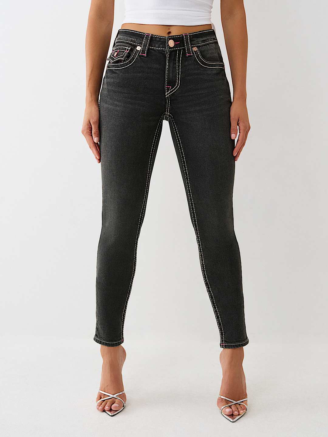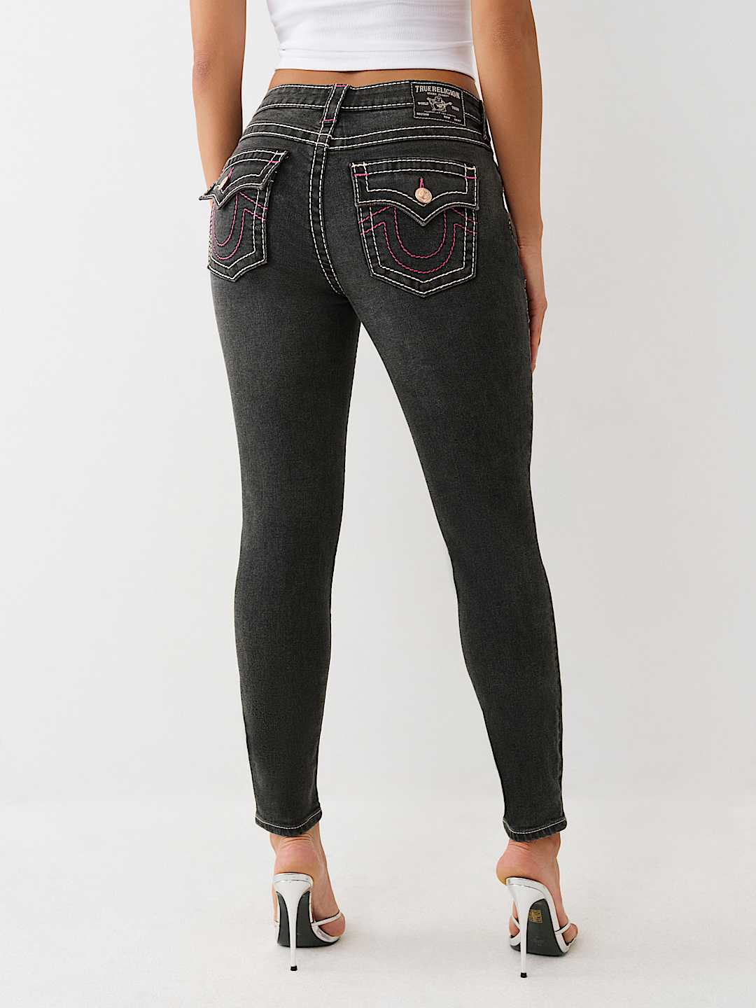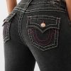 The Jennie Mid Rise Big T Curvy Skinny Jean is flirty, flattering, and cool. Crafted in black wash, this pair of skinny jeans features a zip fly, belt loops, gold hardware, and a mid-rise waist. Complete with Big T stitch and horseshoe detailing on the back flap pockets to make sure all eyes stay on you.