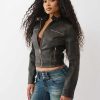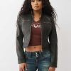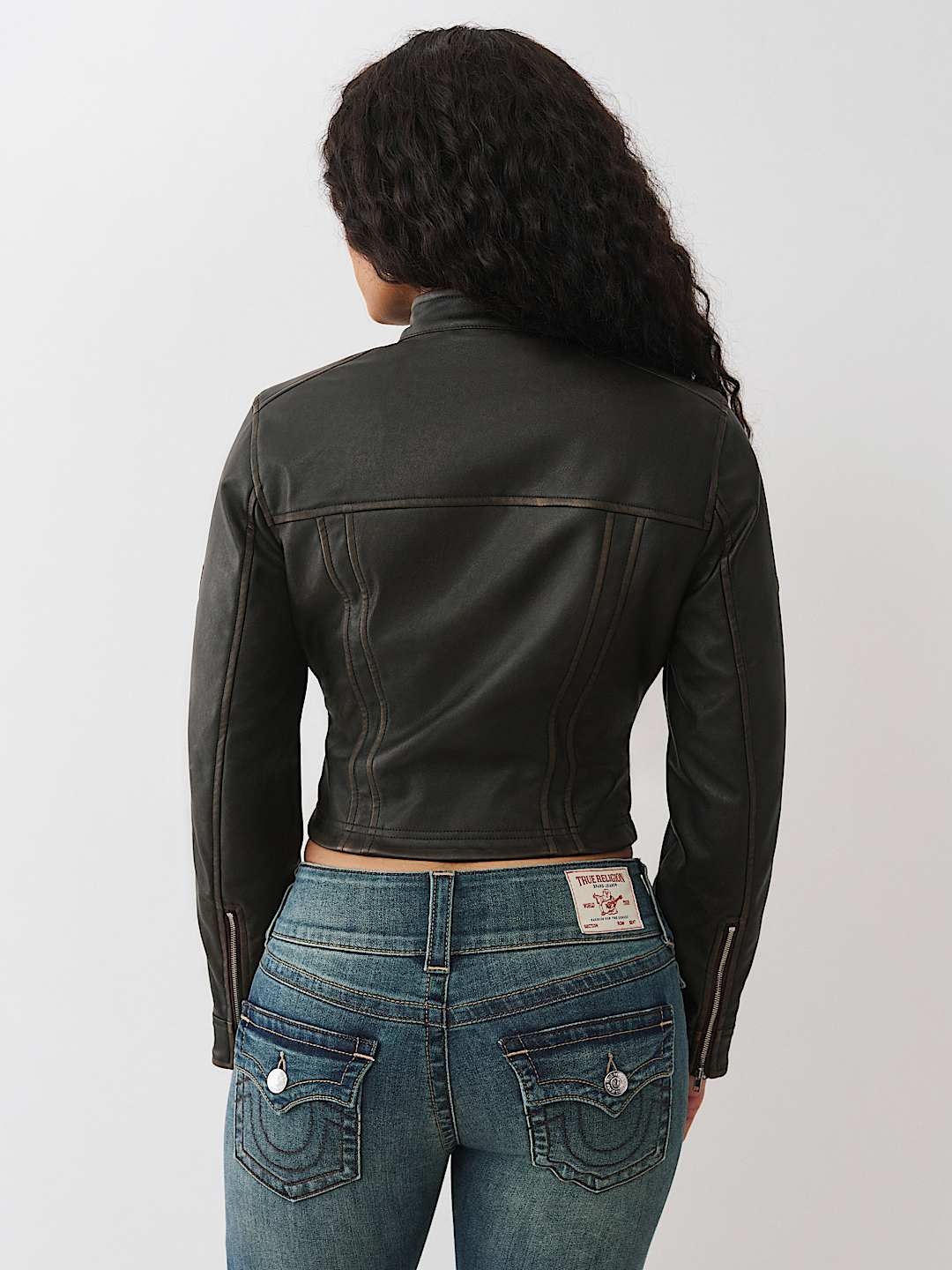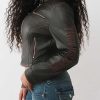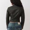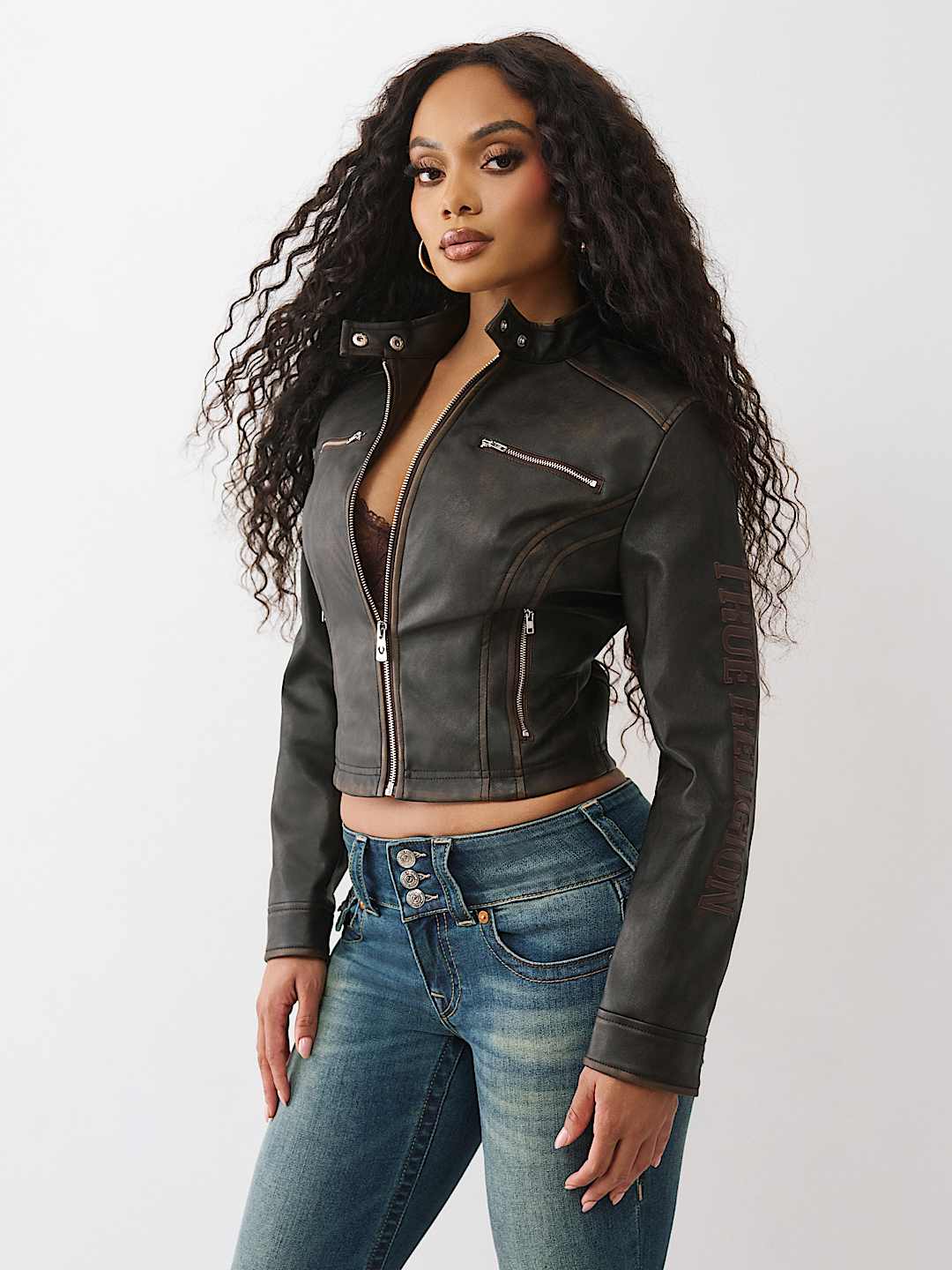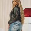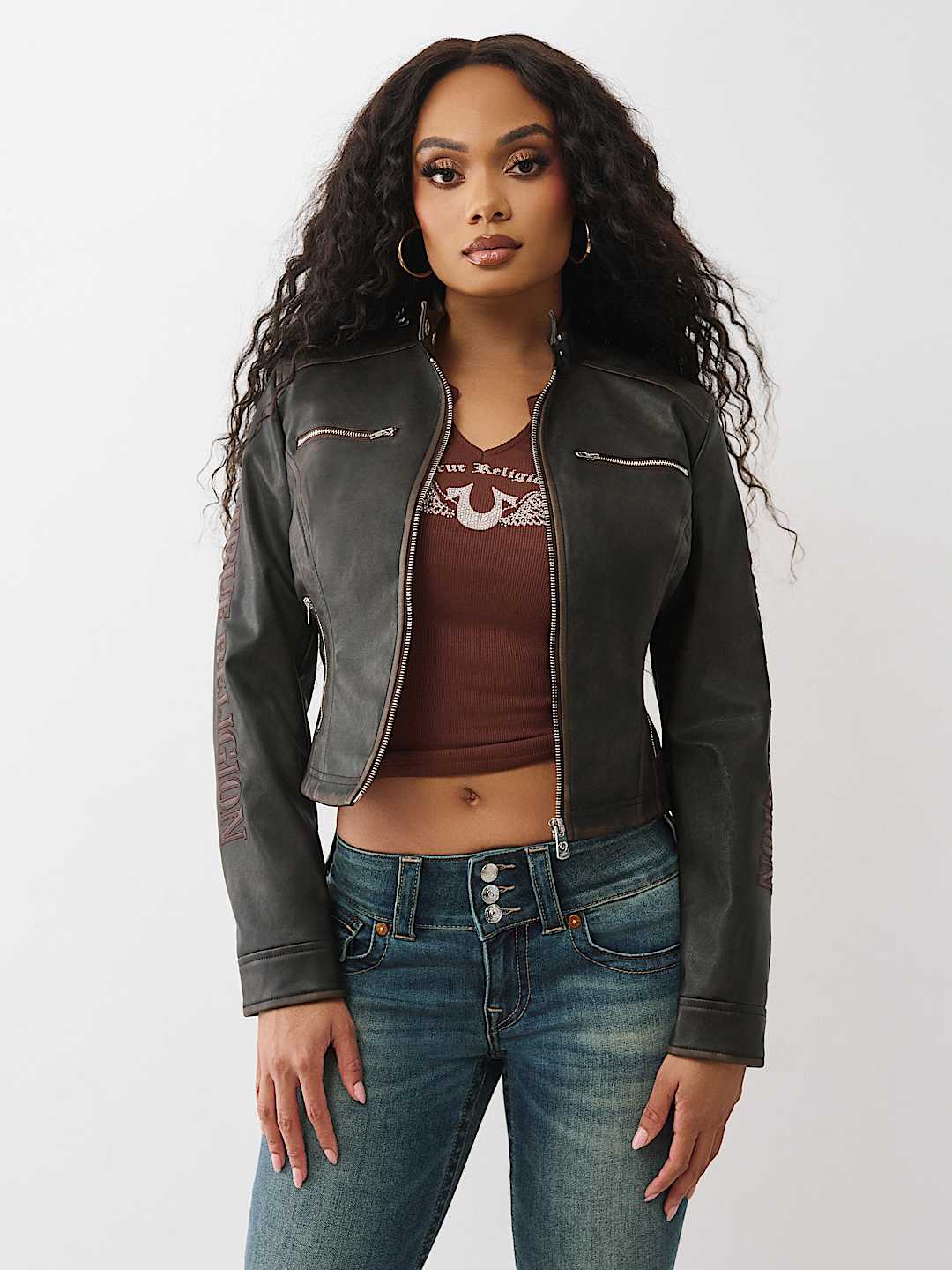 Ride like a real baddie in the Logo Zip Moto Jacket. This faux leather jacket features snap fastenings at the collar, zippered chest and side pockets, paneled stripe detailing, and logo accents along the sleeves.