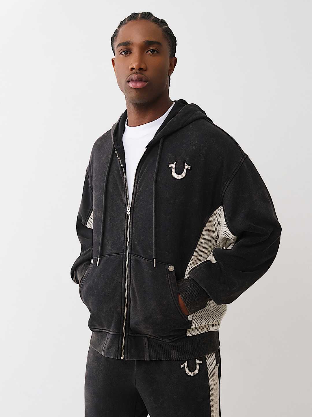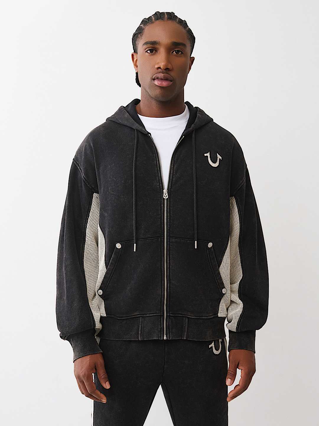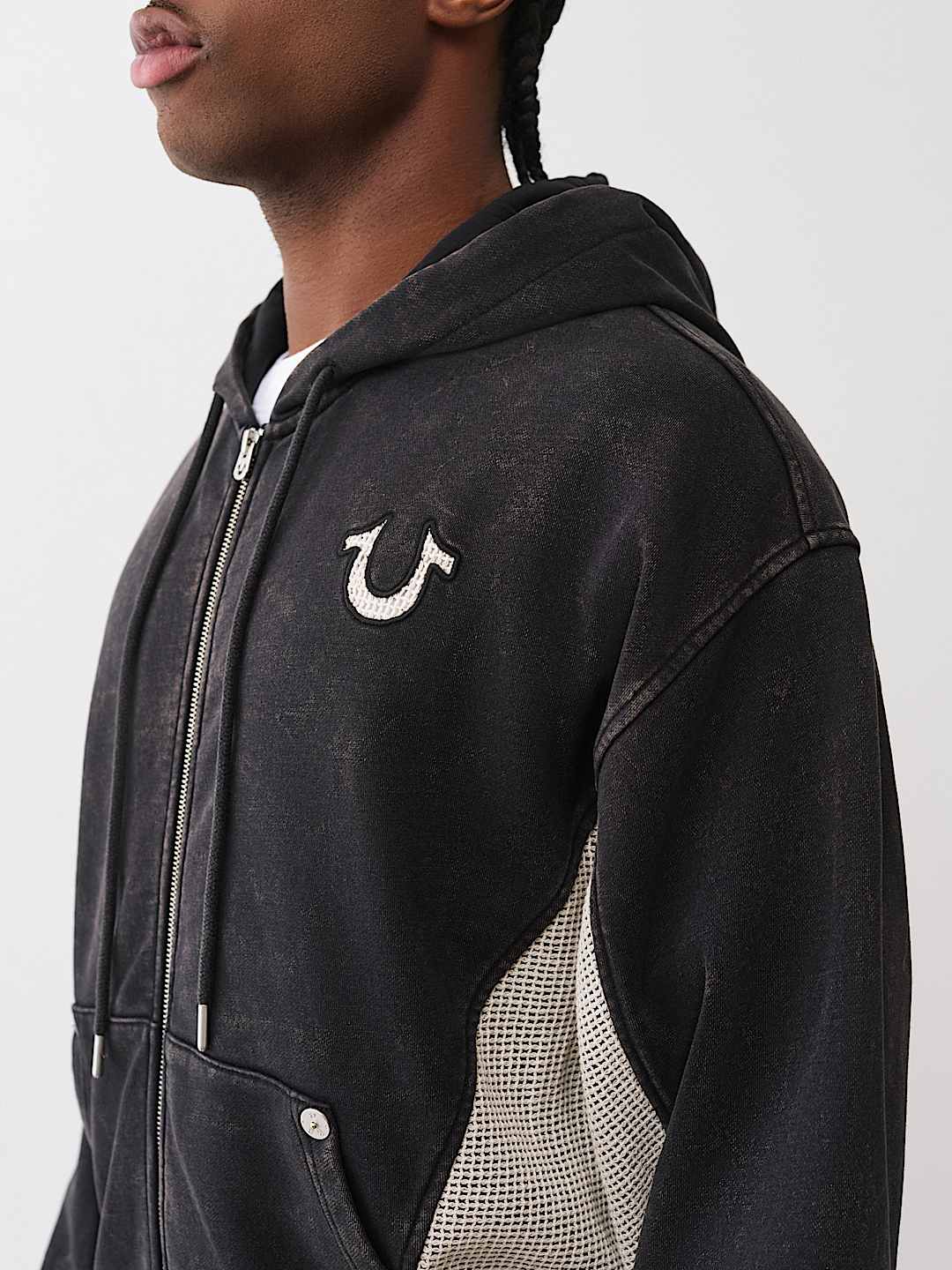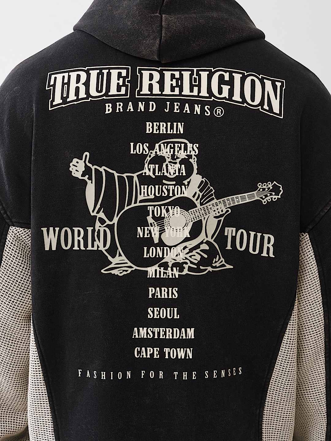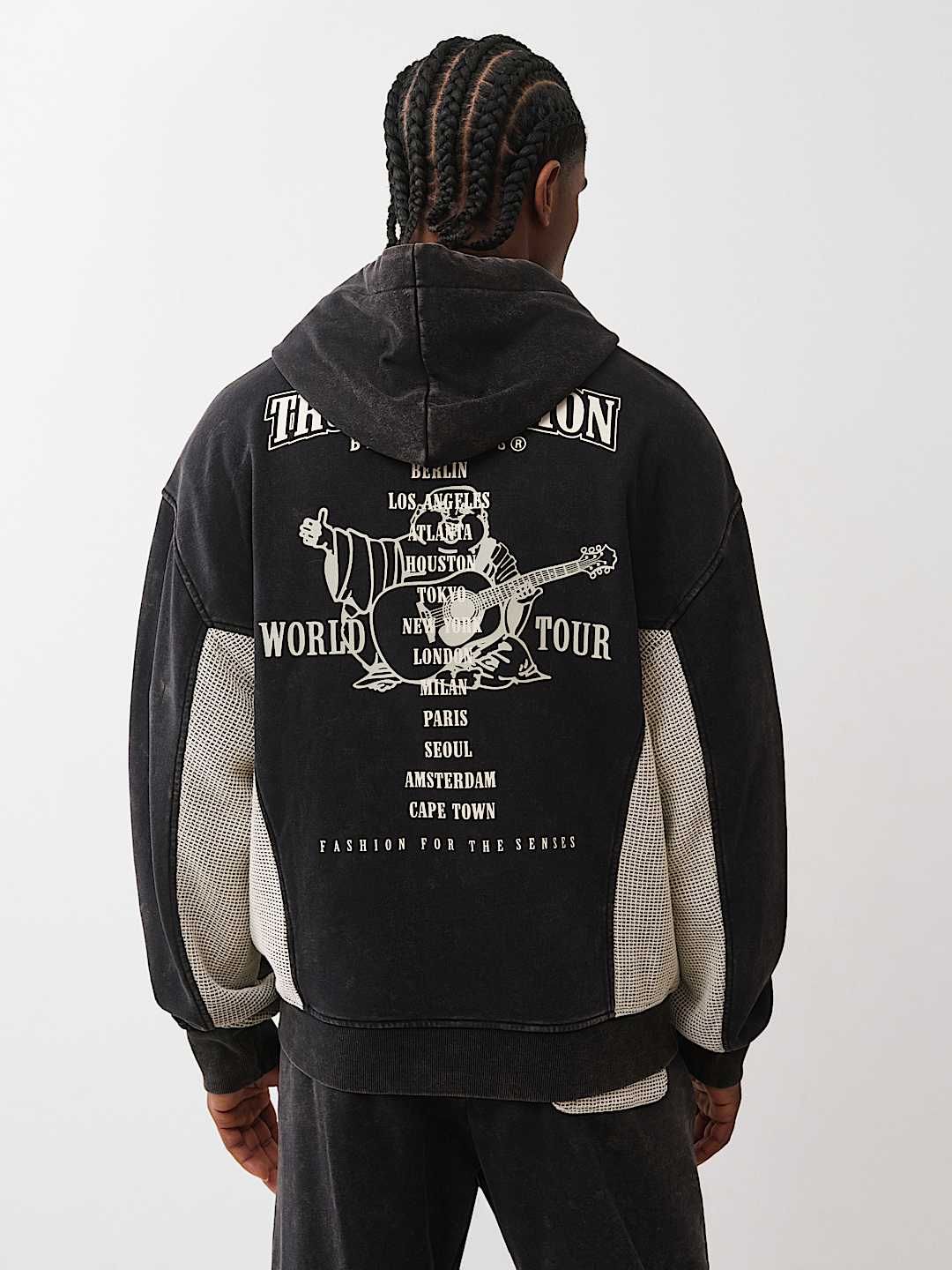 Be a True OG in the Mesh Inset Rusted Boxy Zip Hoodie. Featuring a rusted wash and side mesh panels for an easy flex, it's finished with a drawstring hood, split kangaroo pockets, and a World Tour logo on the back.