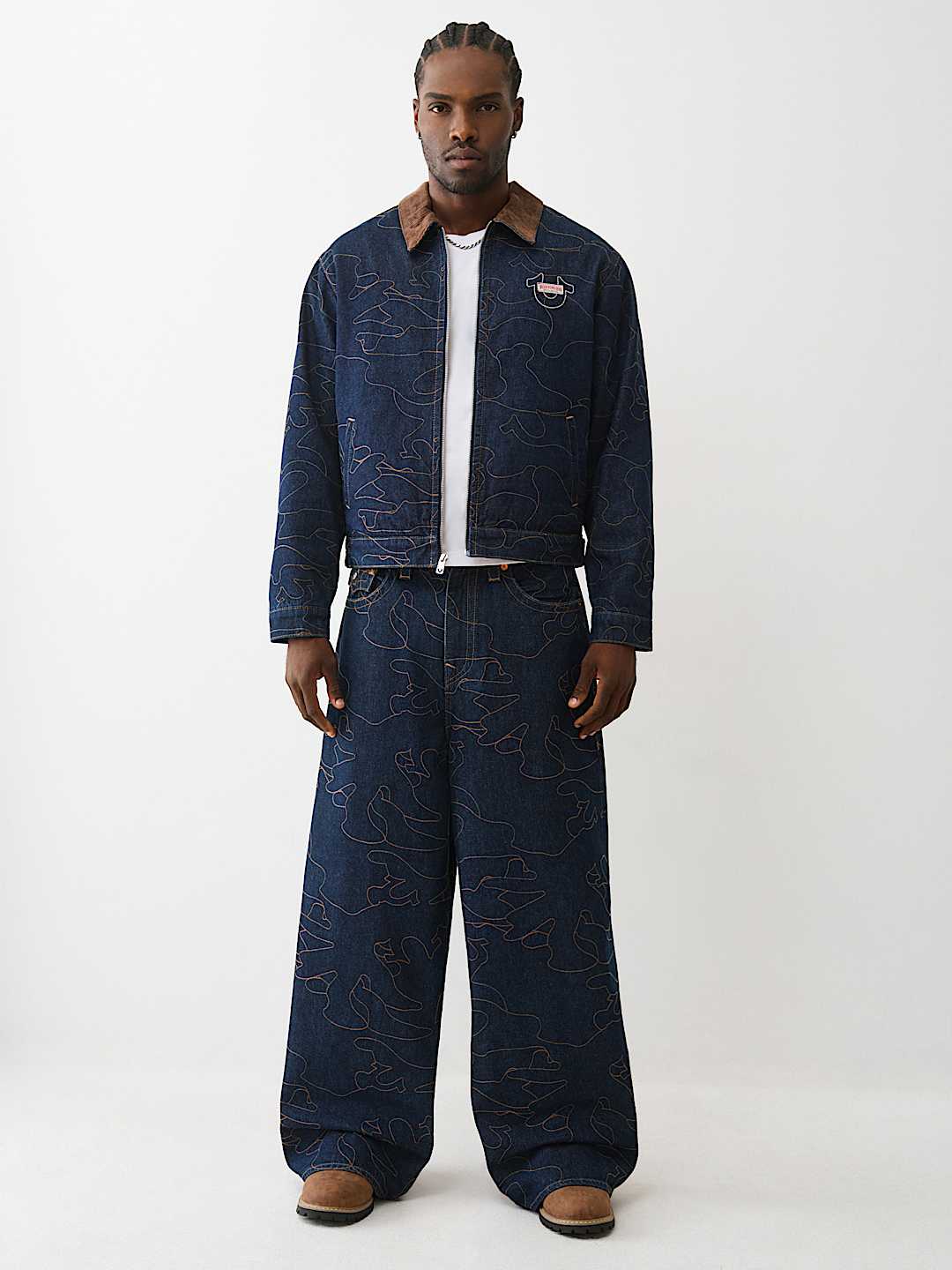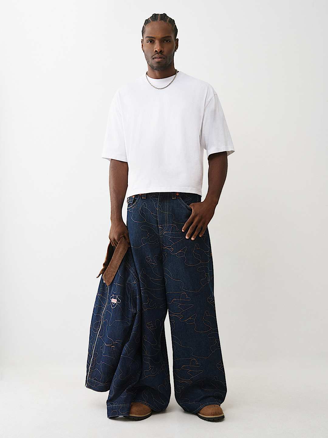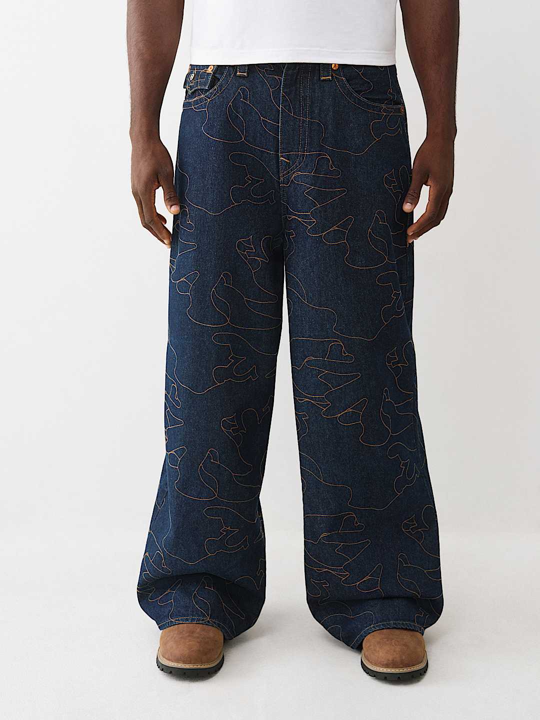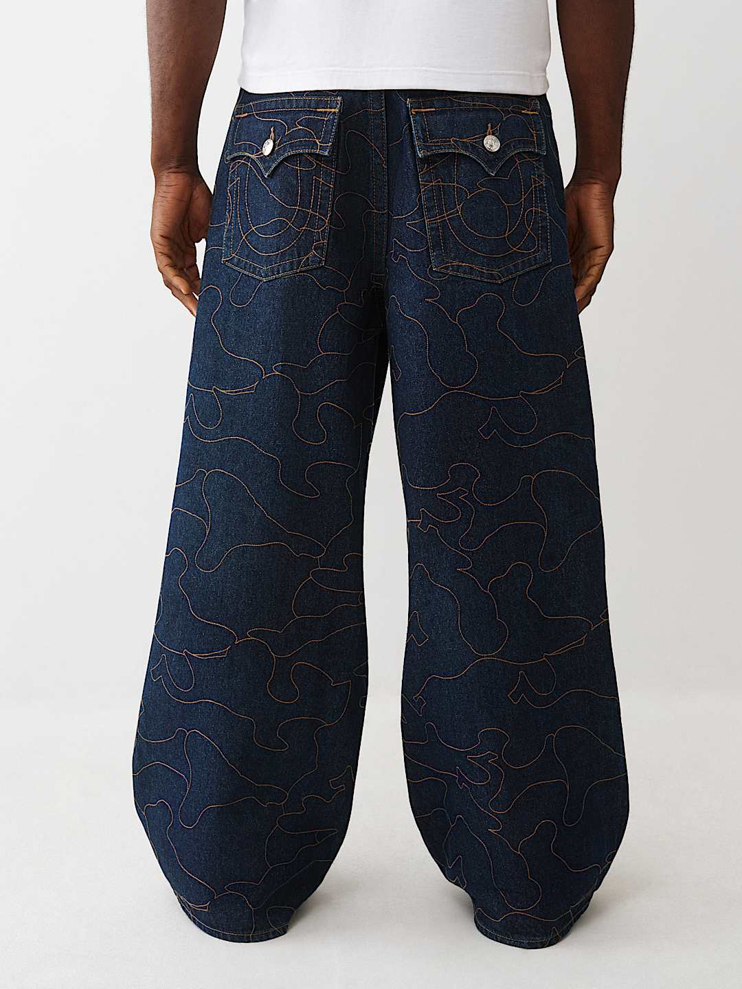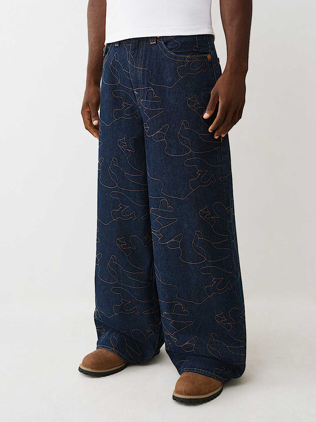 Max out on style and comfort in the Mikey Allover Embroidered Stitch Baggy AF Jean 32". Wide and relaxed through the leg, these jeans feature our baggiest fit yet, with allover single-needle stitching in abstract horseshoe and line patterns, a dark wash, and stitched horseshoes on the back flap pockets.
