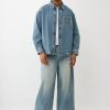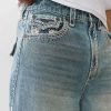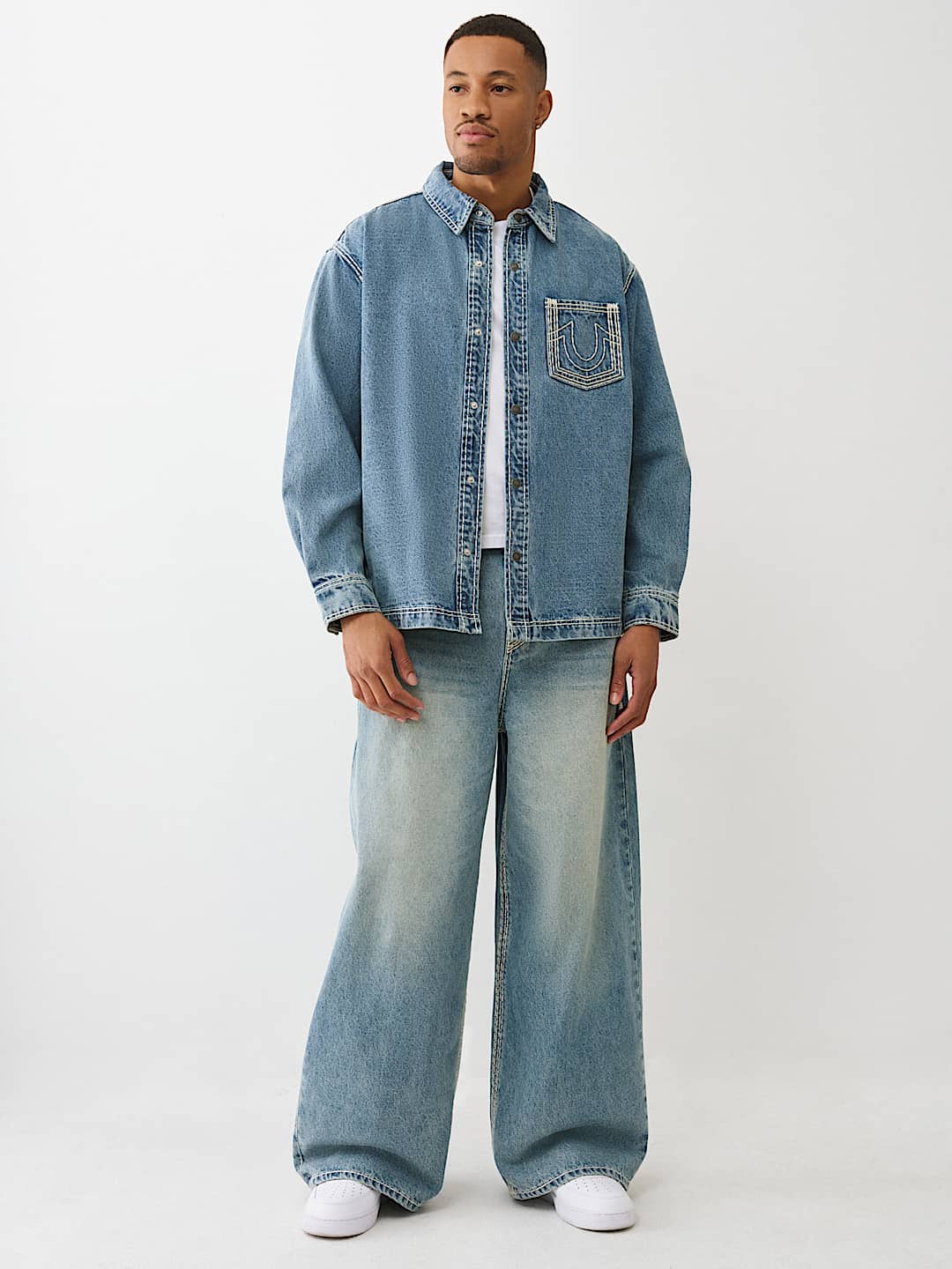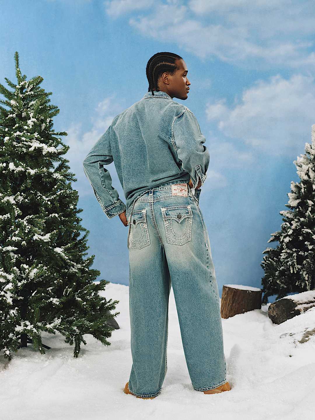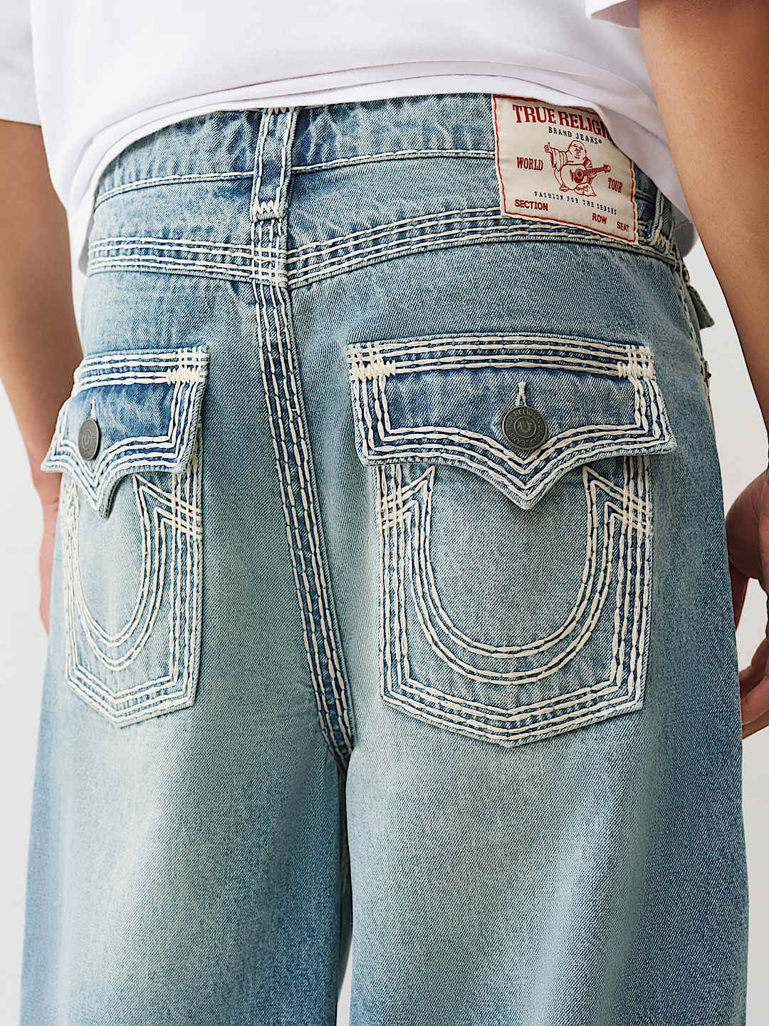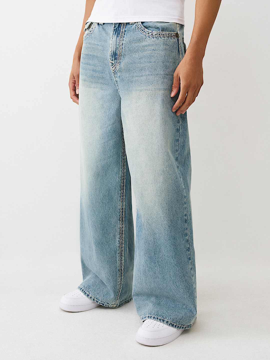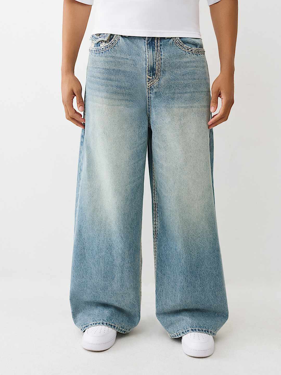Go big on style and comfort in the Mikey Super QT Baggy AF Jean 32". Our baggiest fit yet, these light-wash jeans feature bold Super QT stitching, whiskering, fading along the legs, and are finished with stitched horseshoes on the back flap pockets.