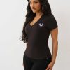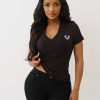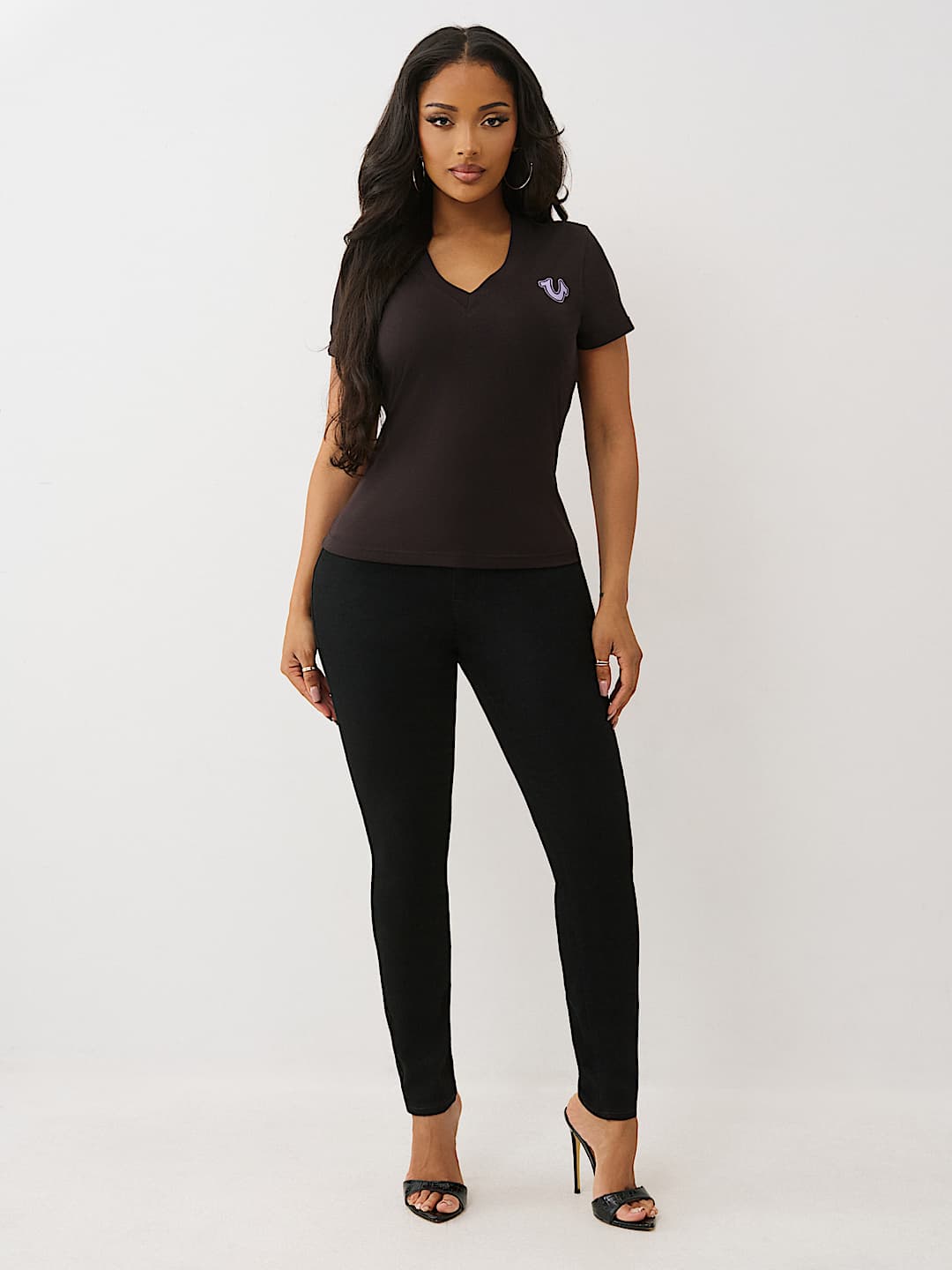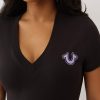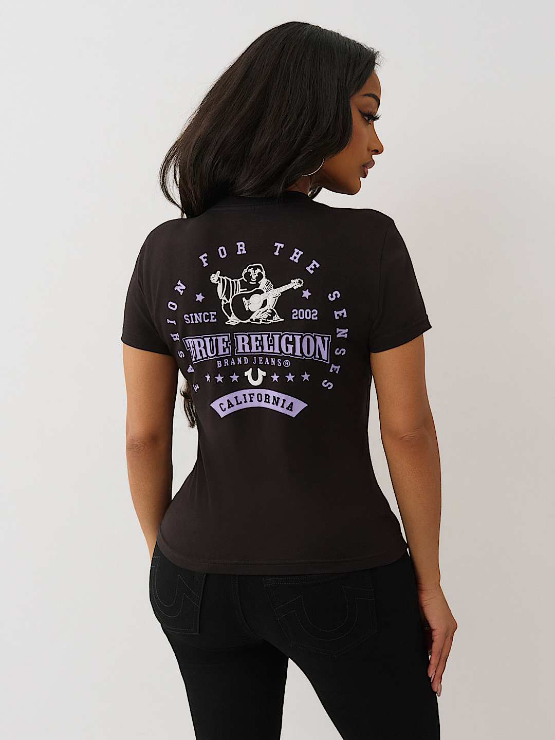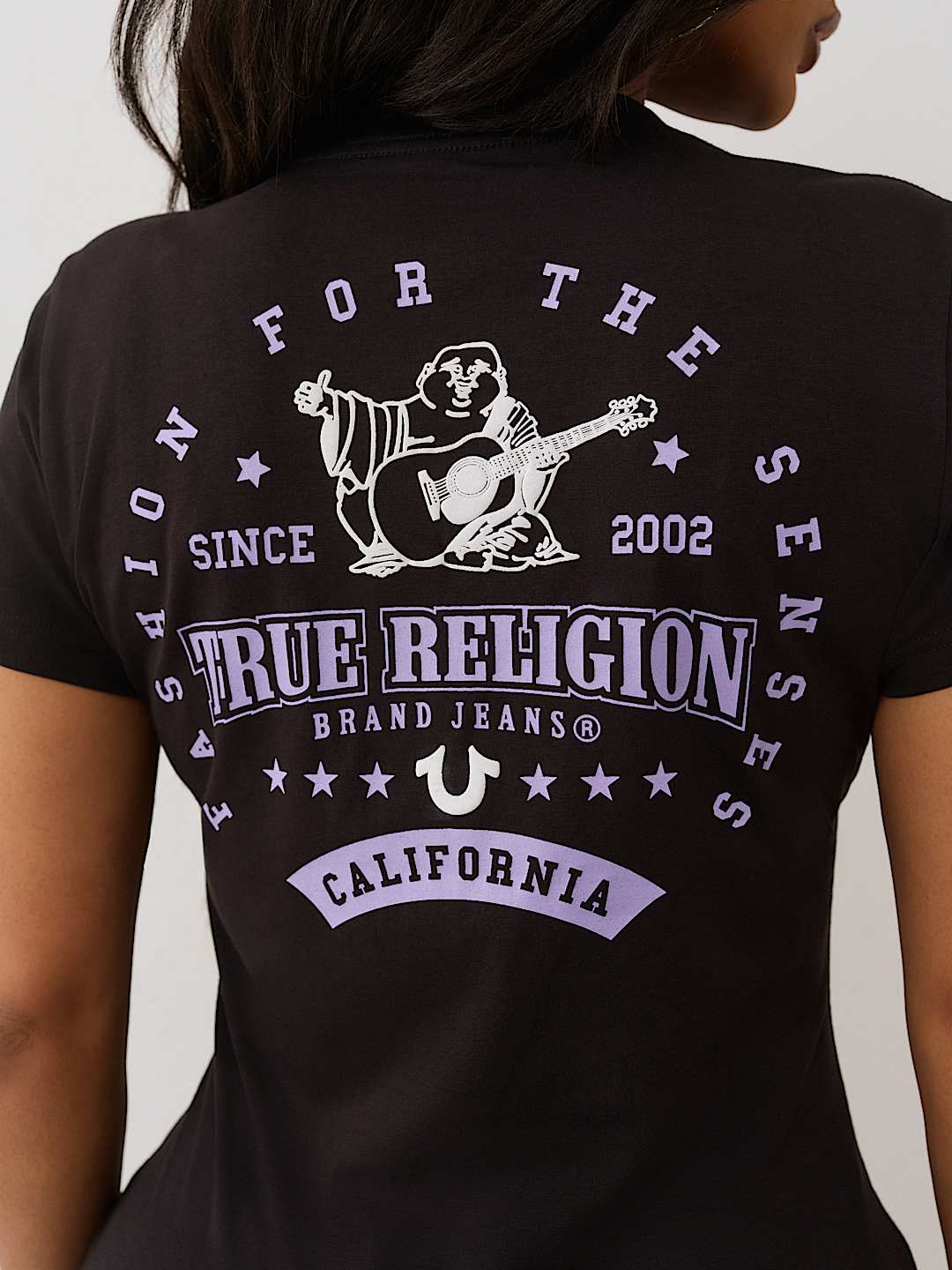 The Movie Star Buddha V-Neck Tee steals the spotlight. Designed with a waist-skimming fit and V-neckline, this tee features our signature horseshoe logo on the front and a show-stopping Buddha graphic on the back.