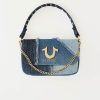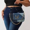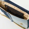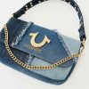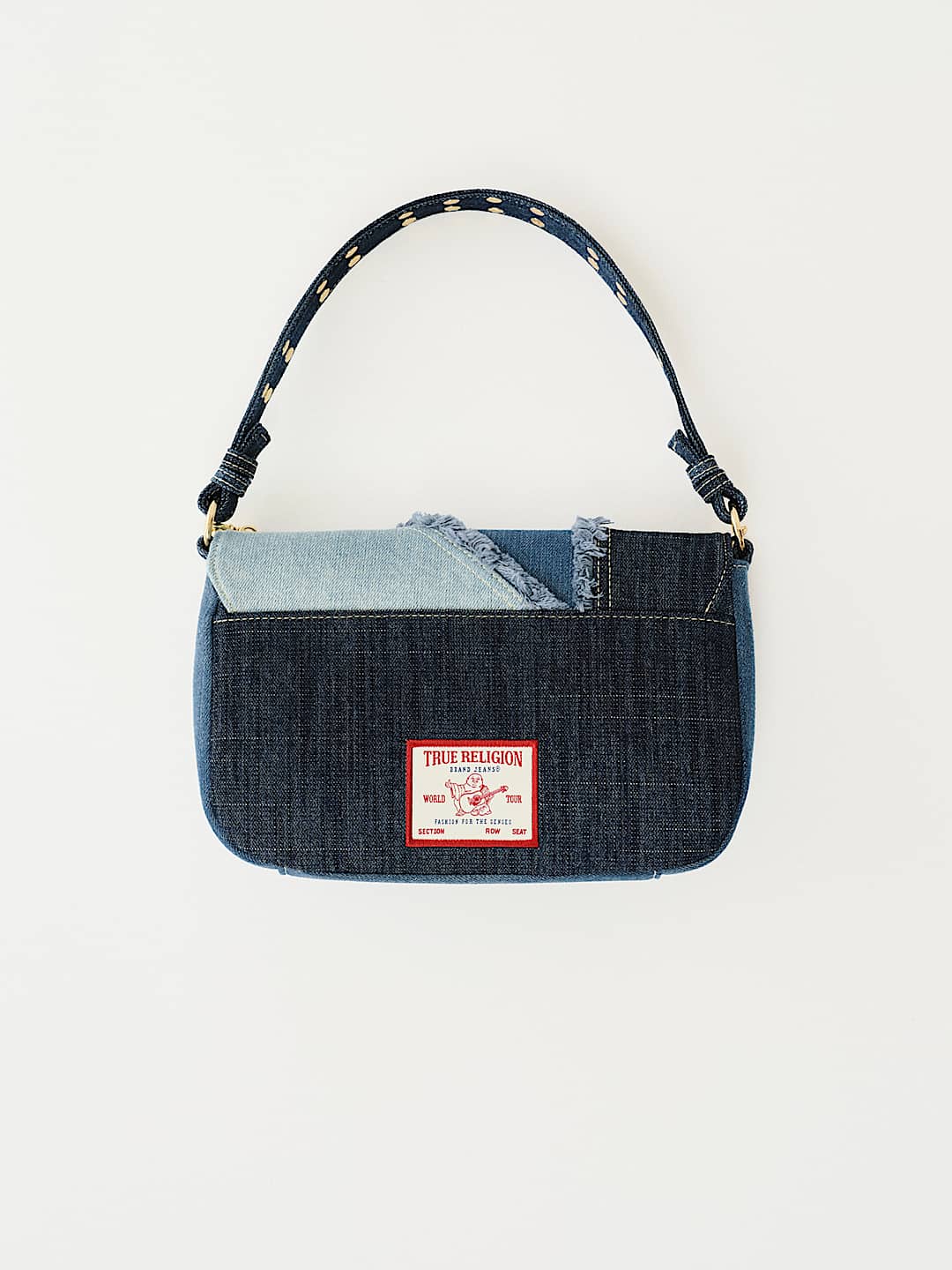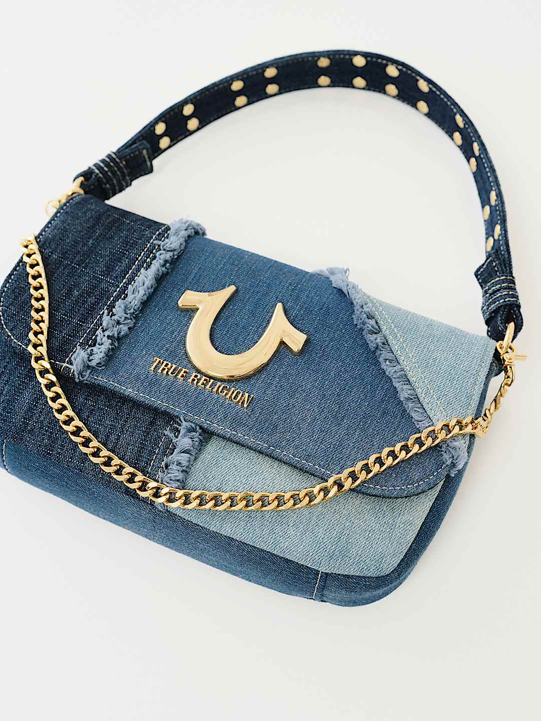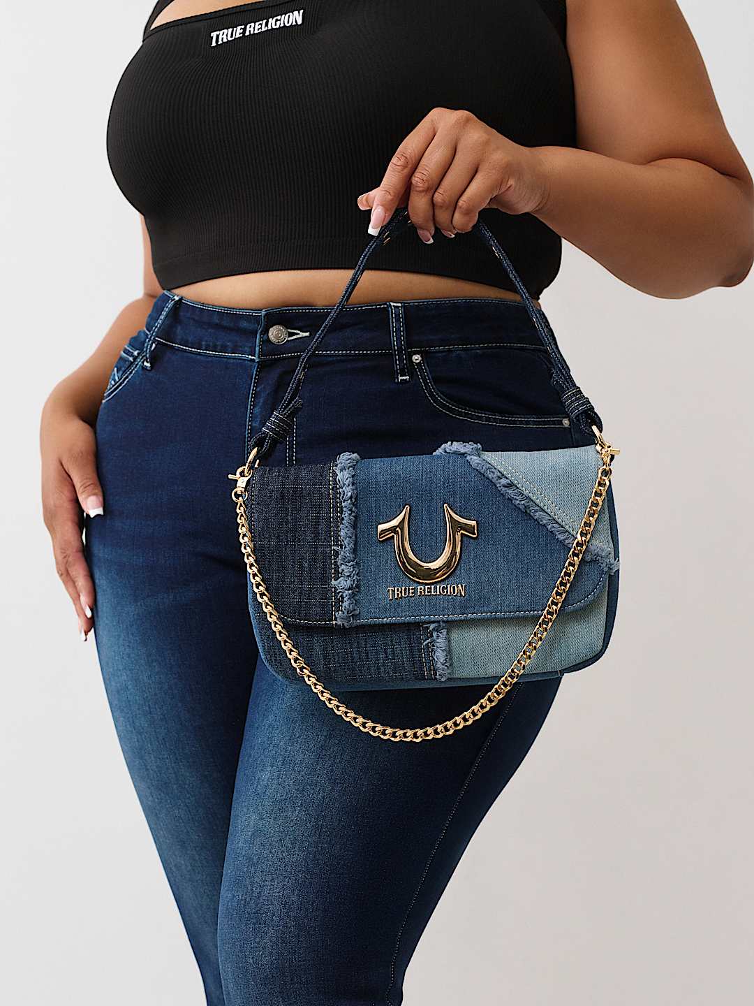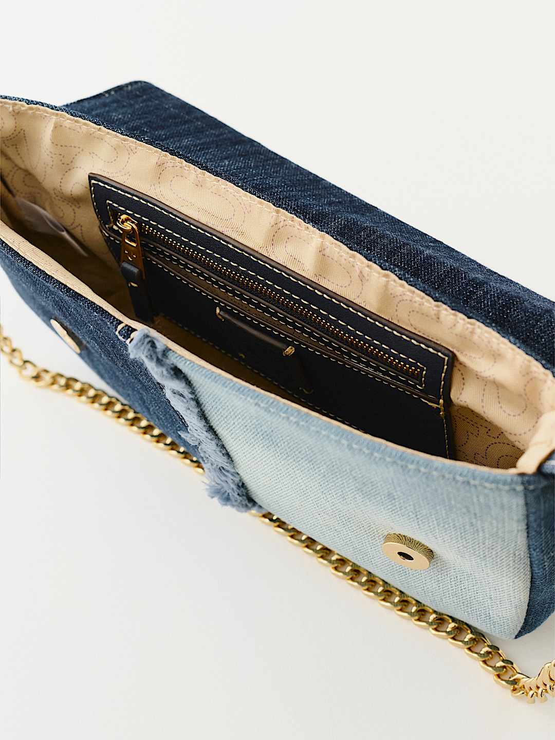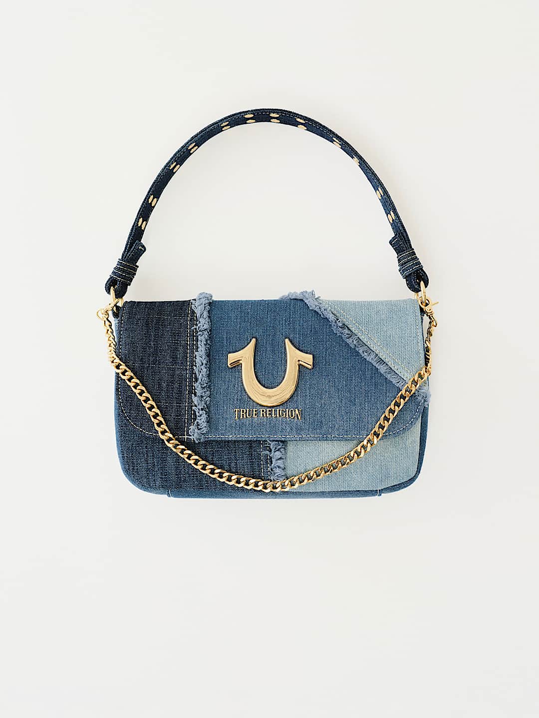 The Patched Denim Chain Handle Bag is your new go-to statement purse. Featuring a pieced-together denim design, it’s finished with a structured shoulder strap, a removable gold chain, and a front snap closure adorned with a golden horseshoe emblem.