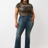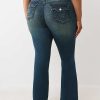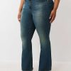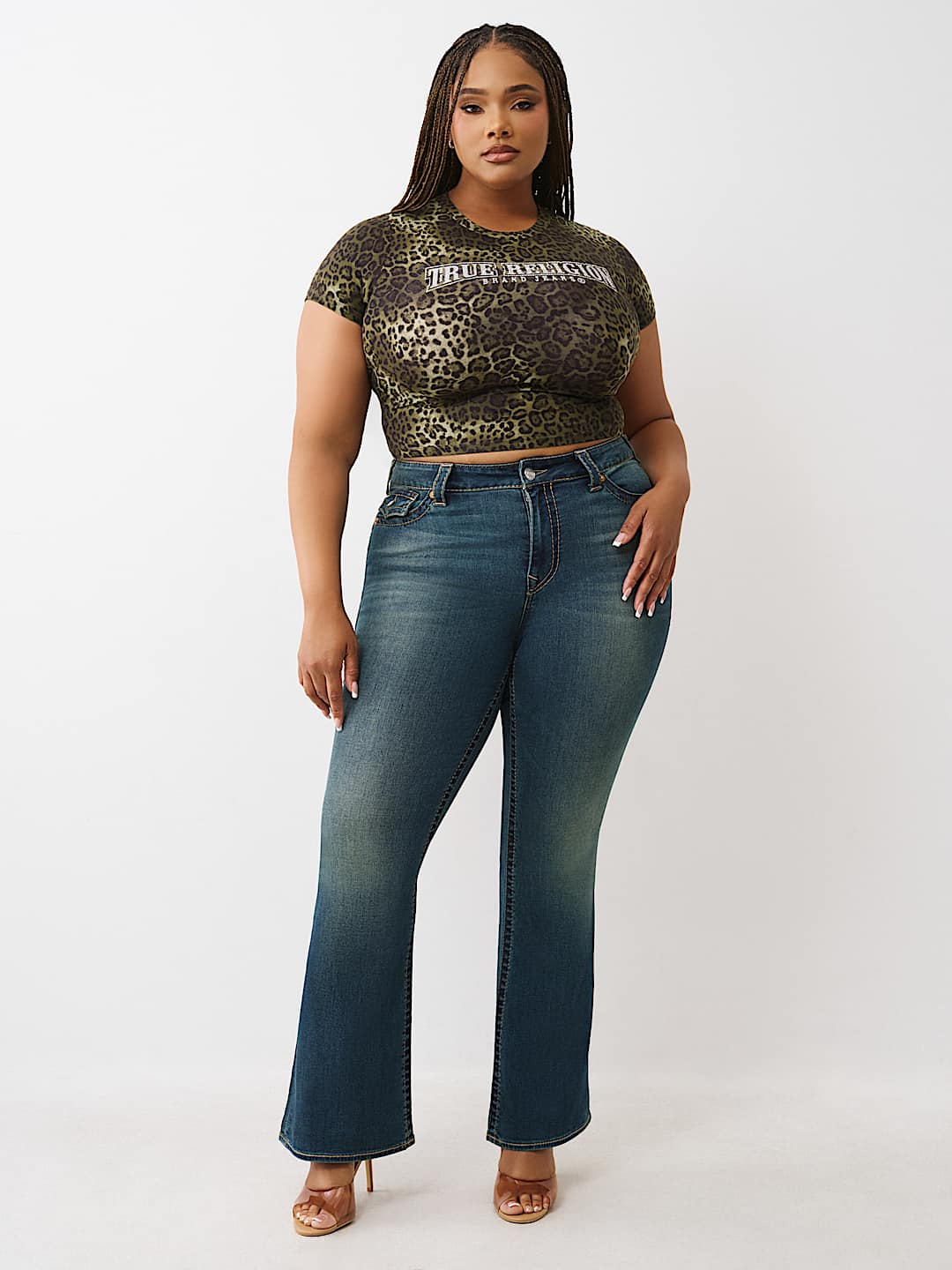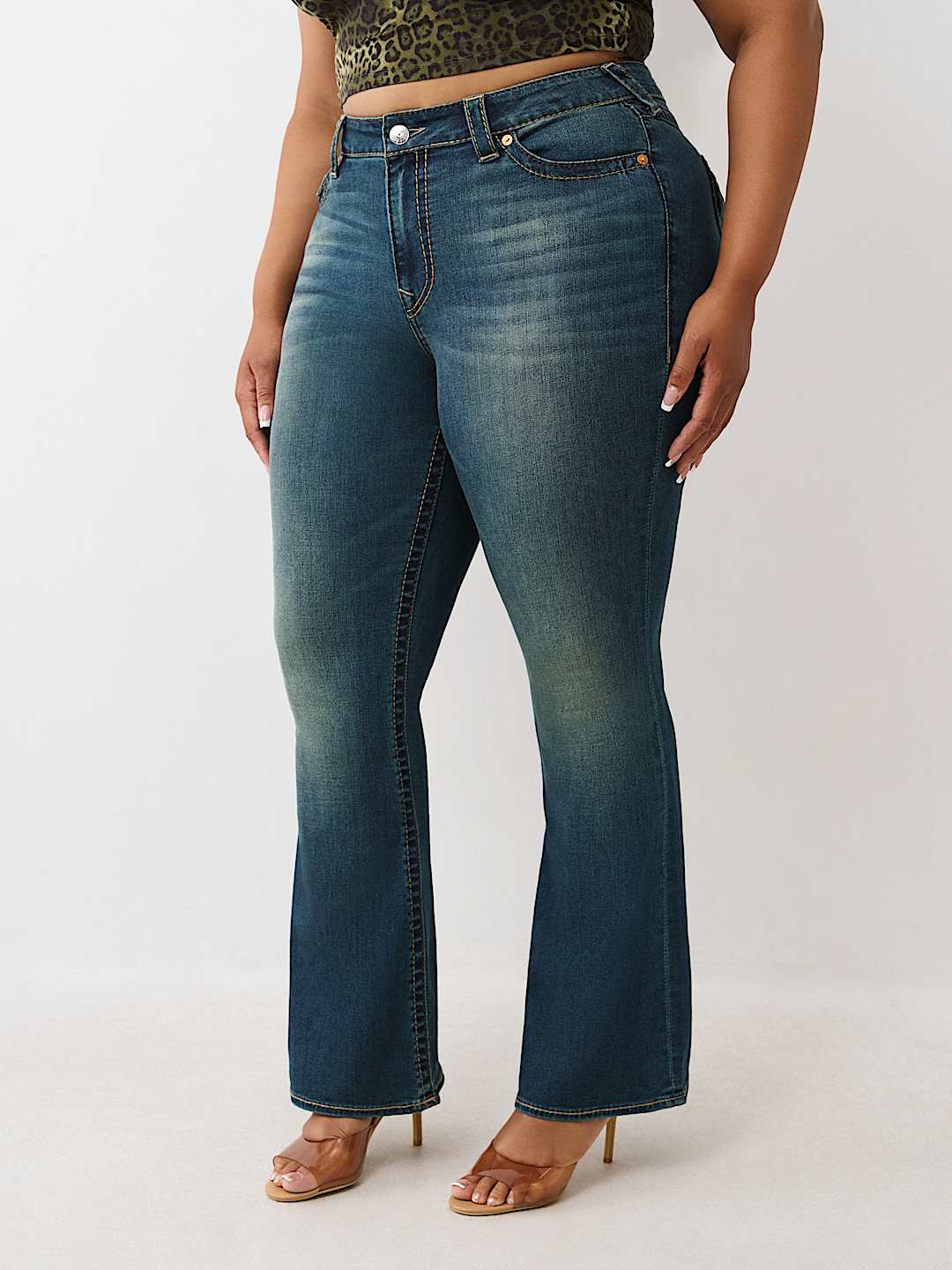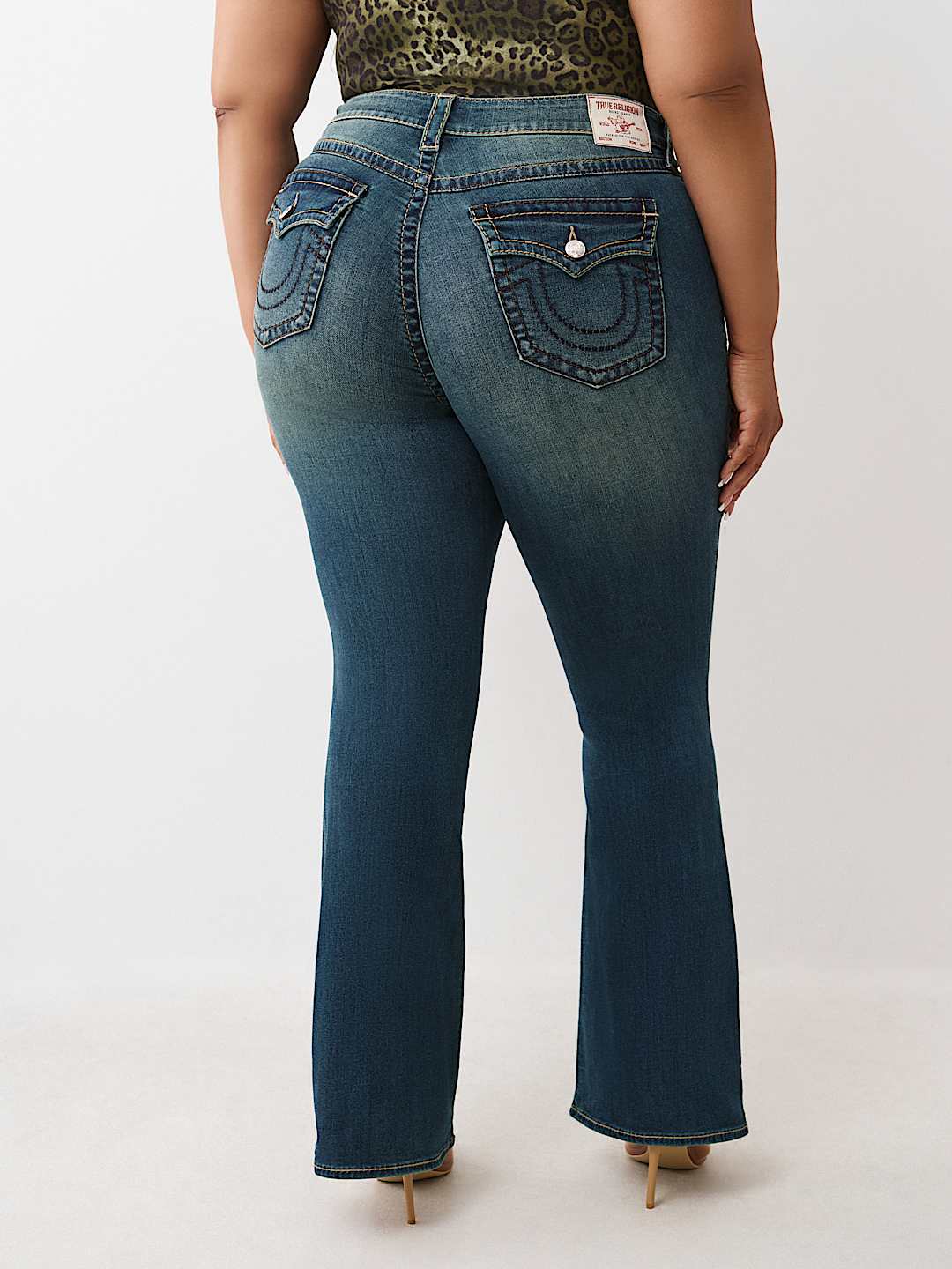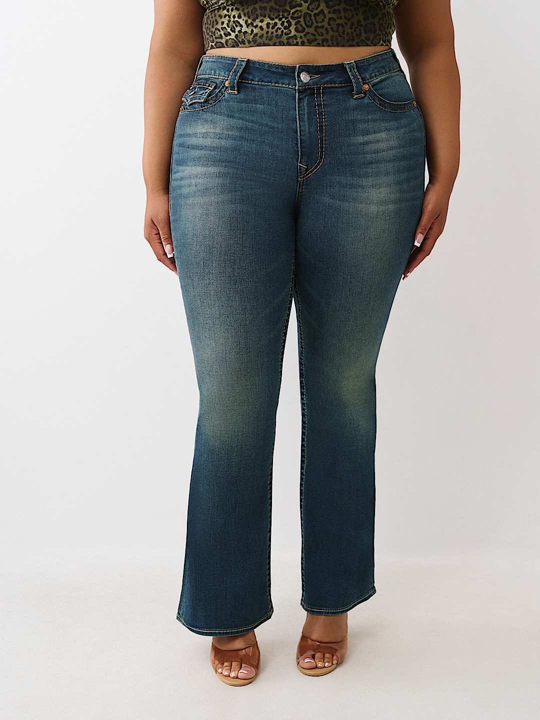 The Plus Becca Mid Rise Big T Bootcut Jean delivers timeless, flattering vibes. Crafted in a leg-lengthening bootcut fit, these dark wash jeans feature whiskering, Big T stitching, and horseshoe detailing on the back flap pockets.