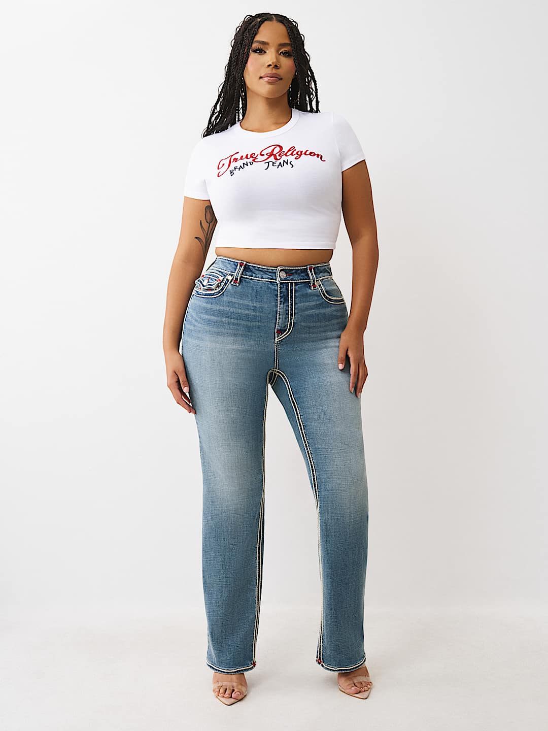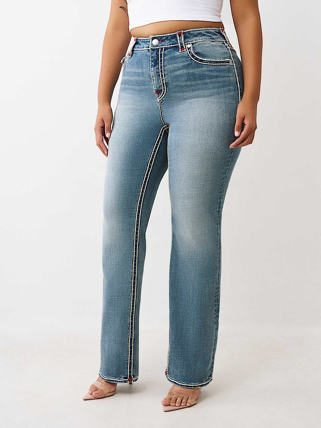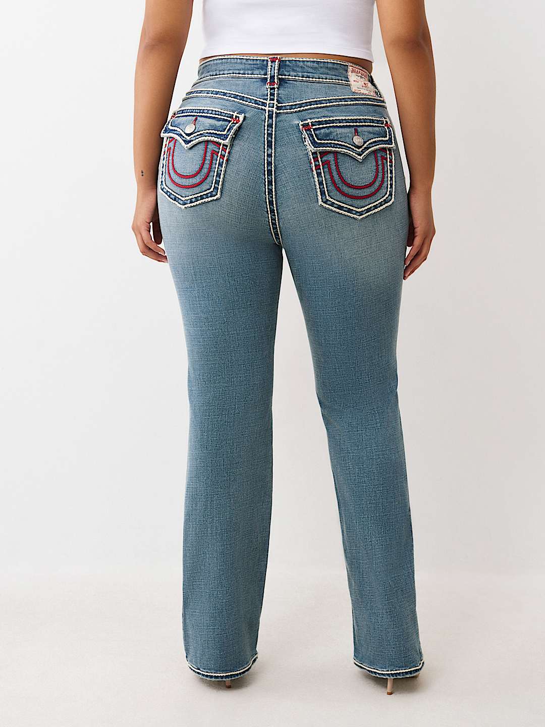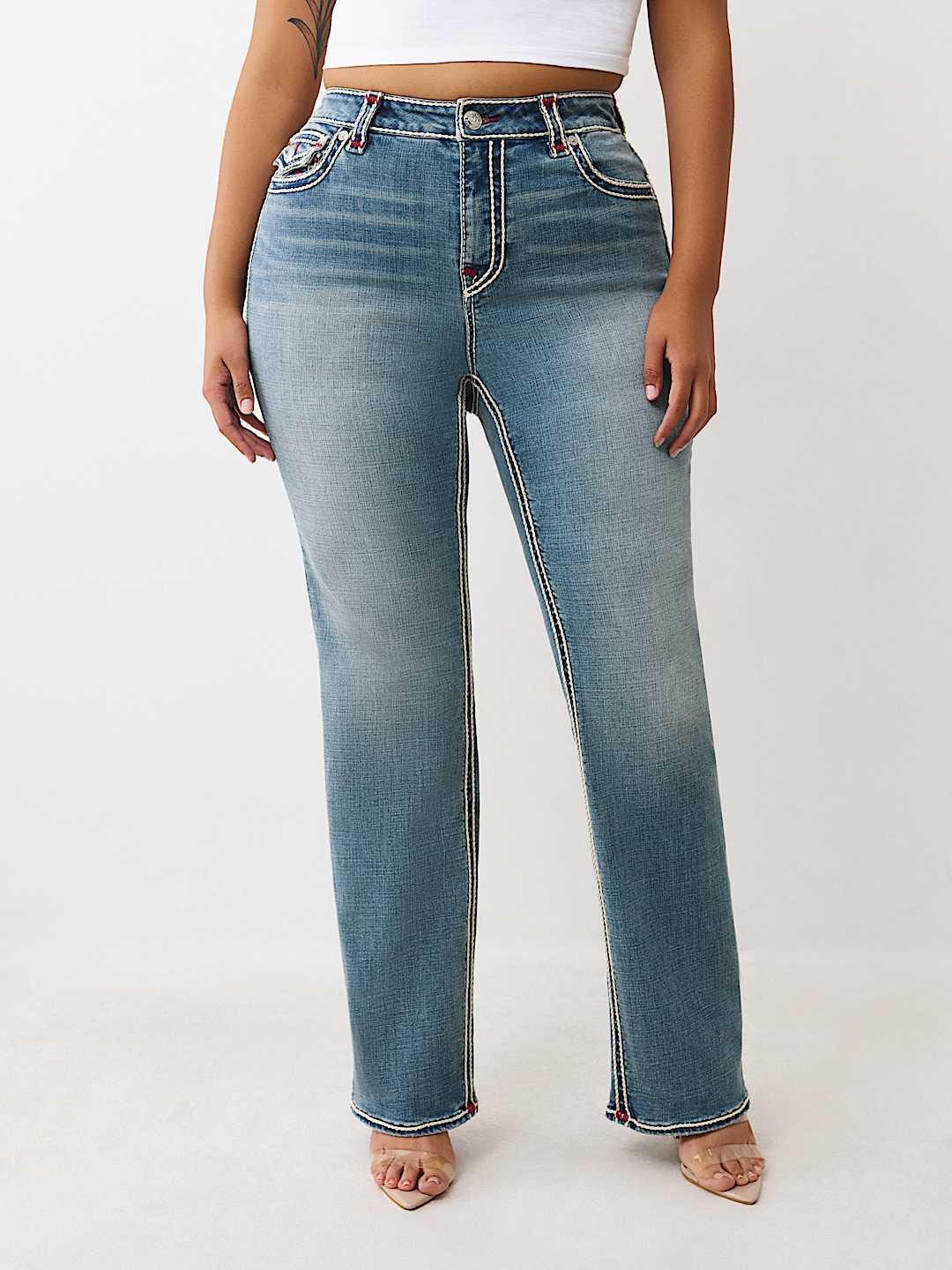 Make it pop with the Plus Billie Rope Stitch Straight Jean. Crafted in a medium wash, these high-rise jeans feature dual-colored rope stitching for a standout look and our iconic horseshoe detailing on the back flap pockets.