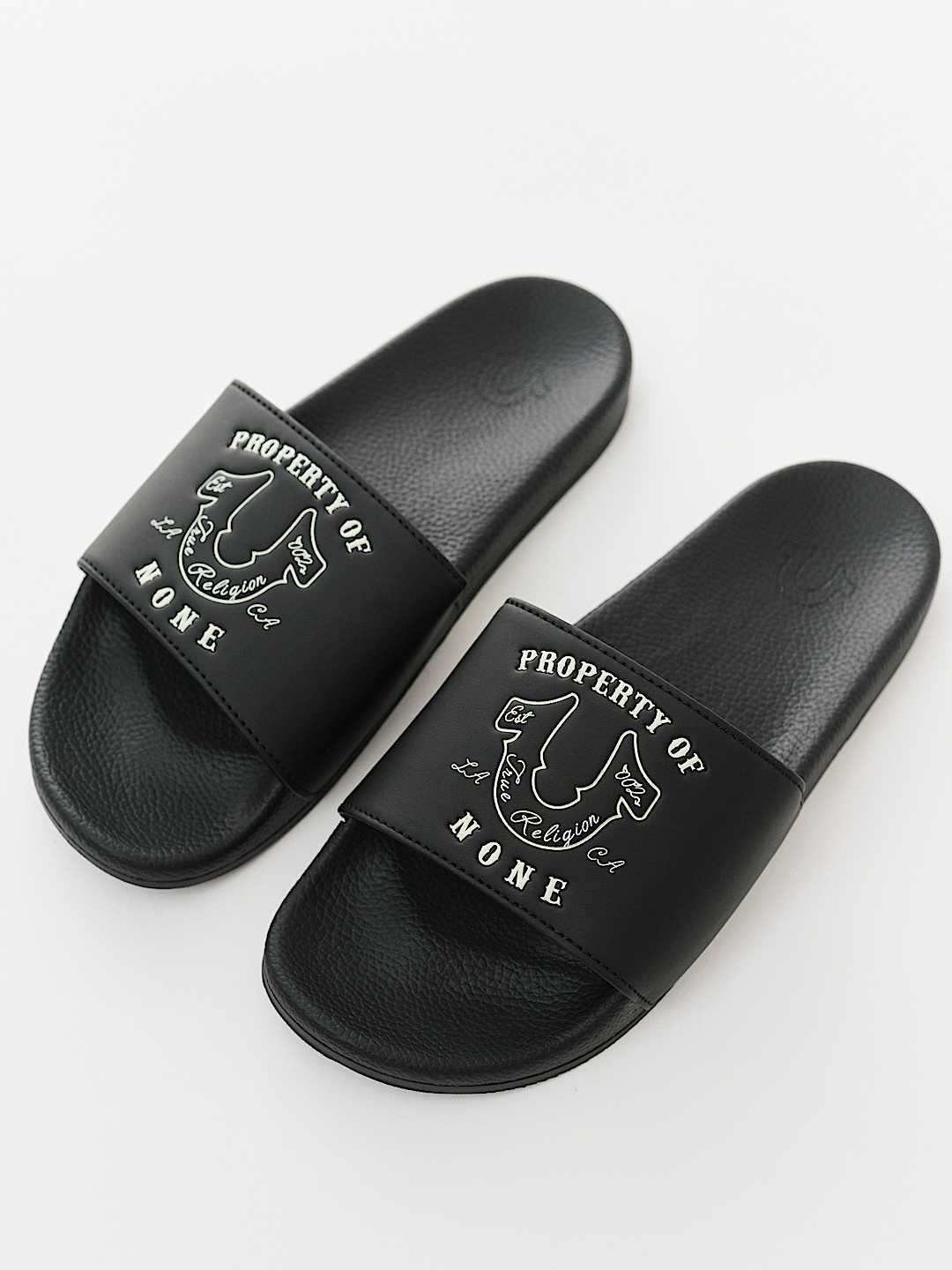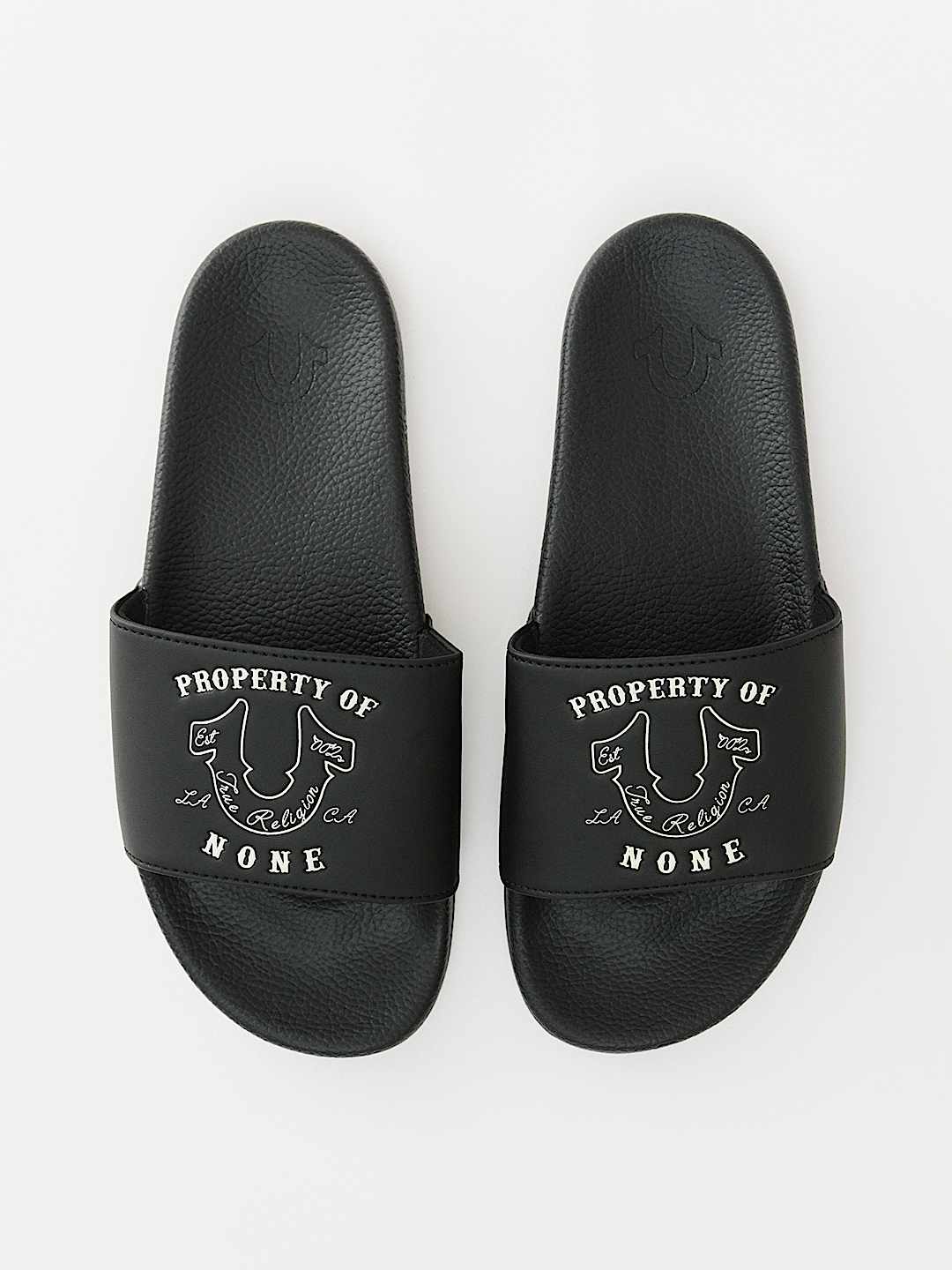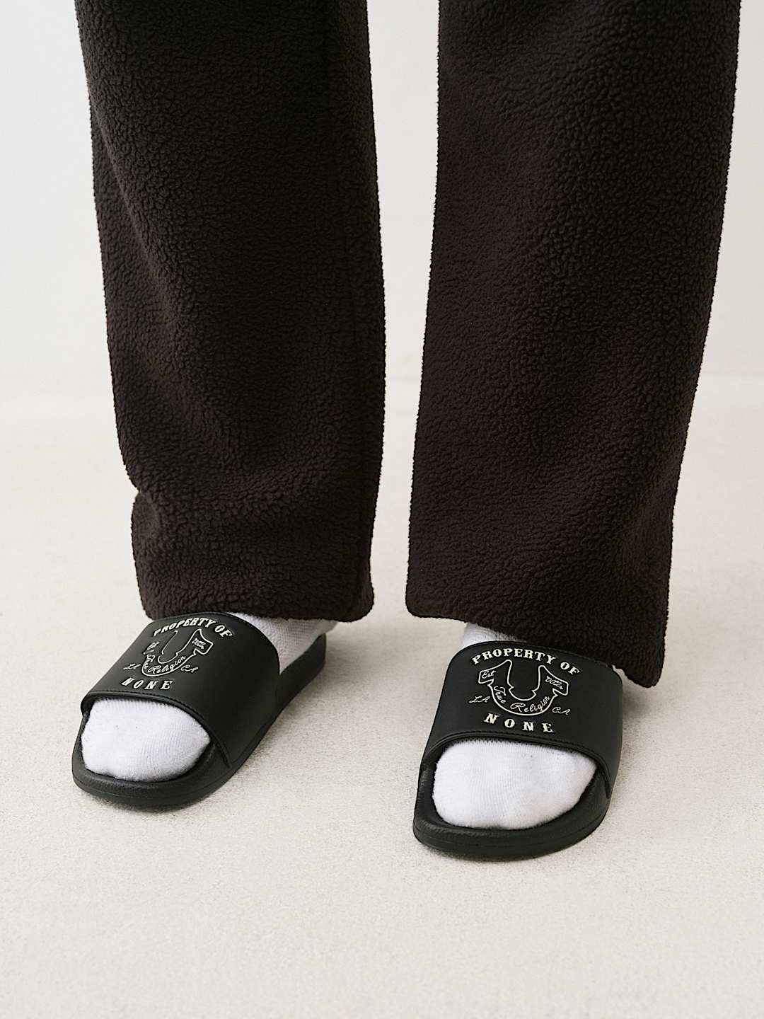 Flex from the ground up with the Property of None Horseshoe Slides. Featuring the Property of None phrase over a branded horseshoe graphic, this easy slip-on design delivers bold vibes and all-day comfort.