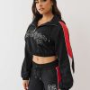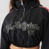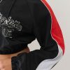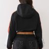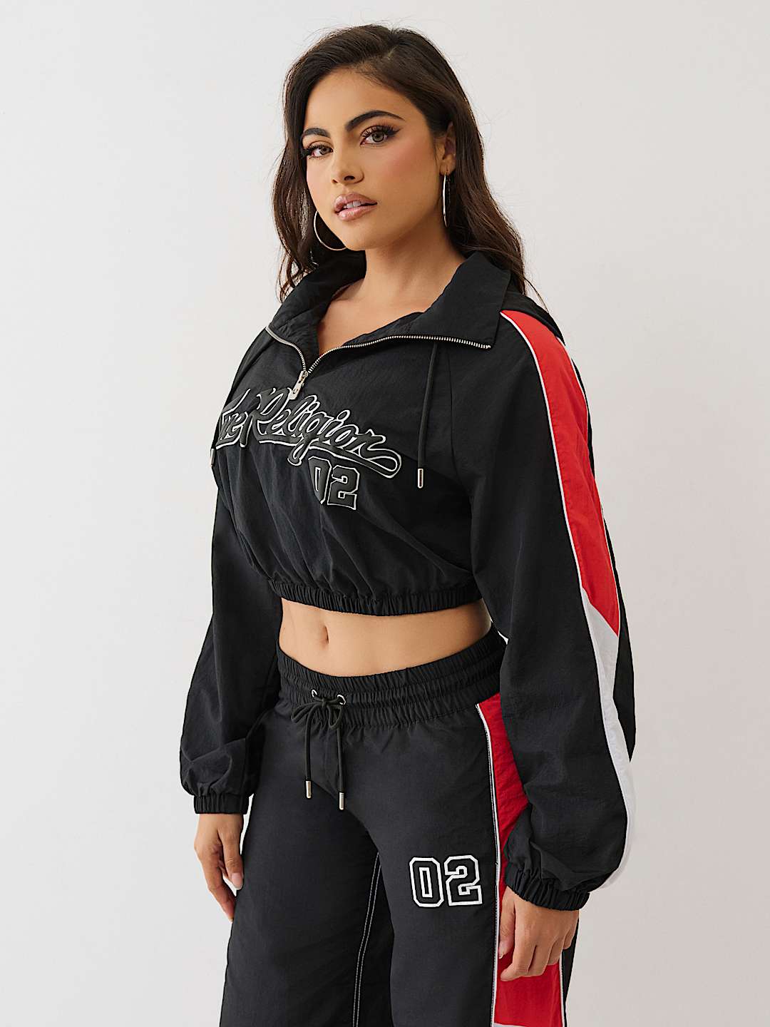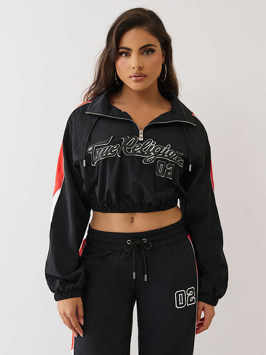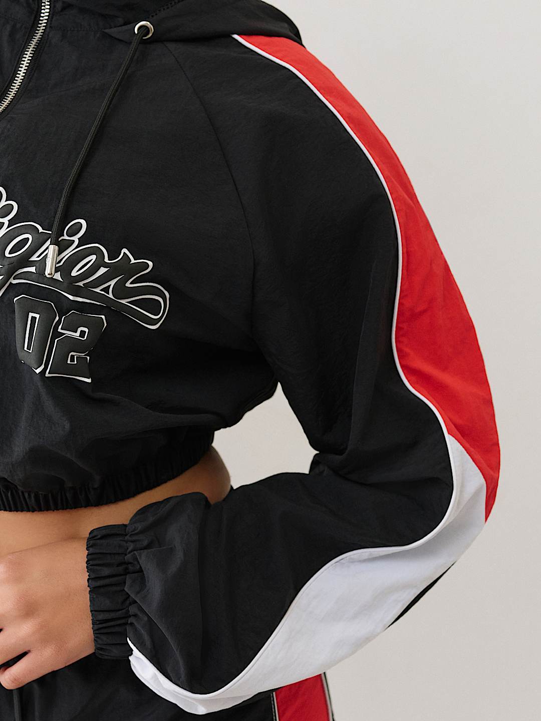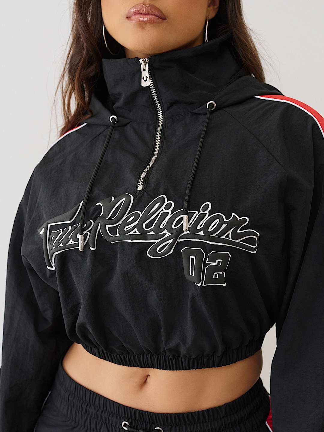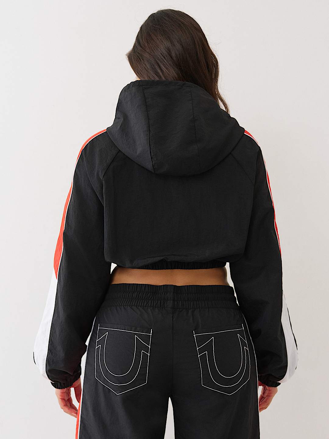 The Puff Print Nylon Half-Zip Jacket serves off-duty baddie vibes. Designed with a cropped cinched trim, this lightweight quarter-zip features a funnel neck, drawstring hood, and a puff print Designer Brand logo graphic on the front, with colorblock paneling on the sleeves for a standout look.