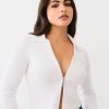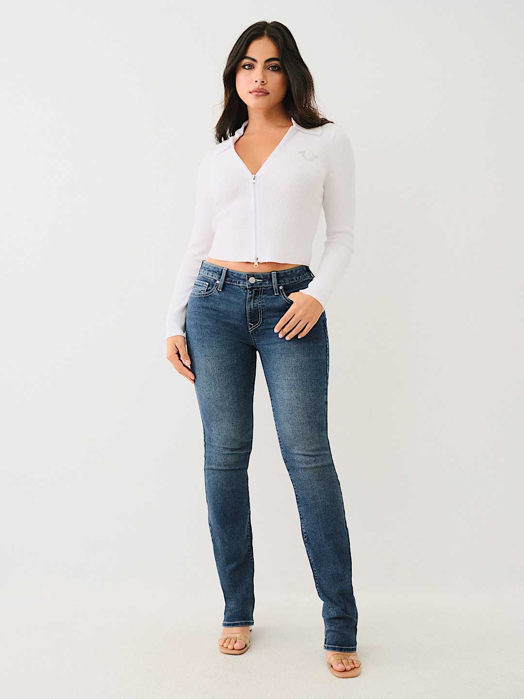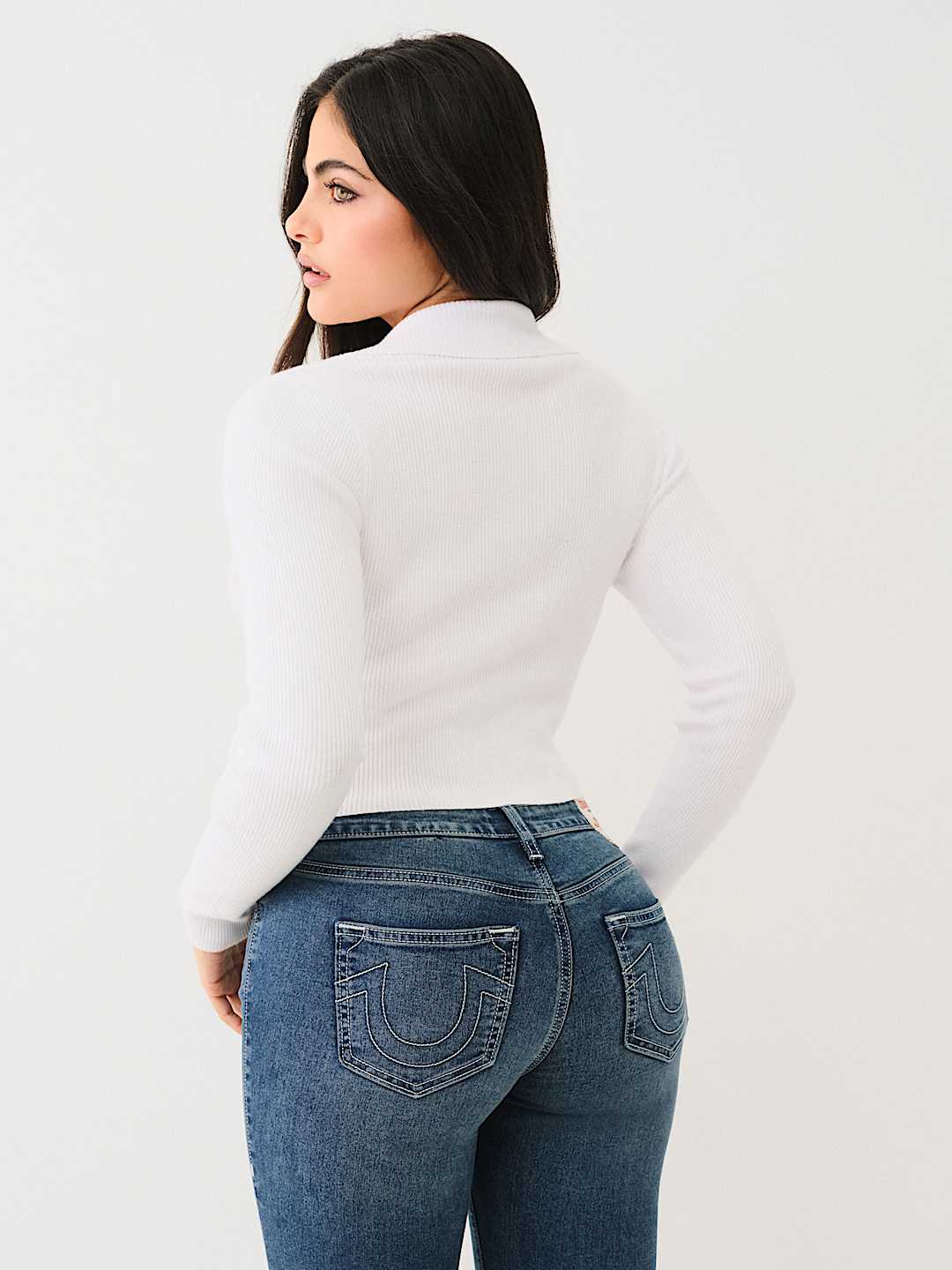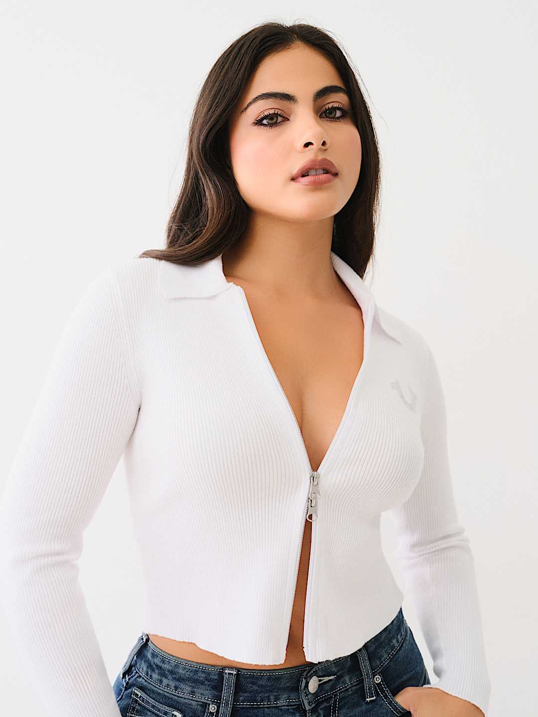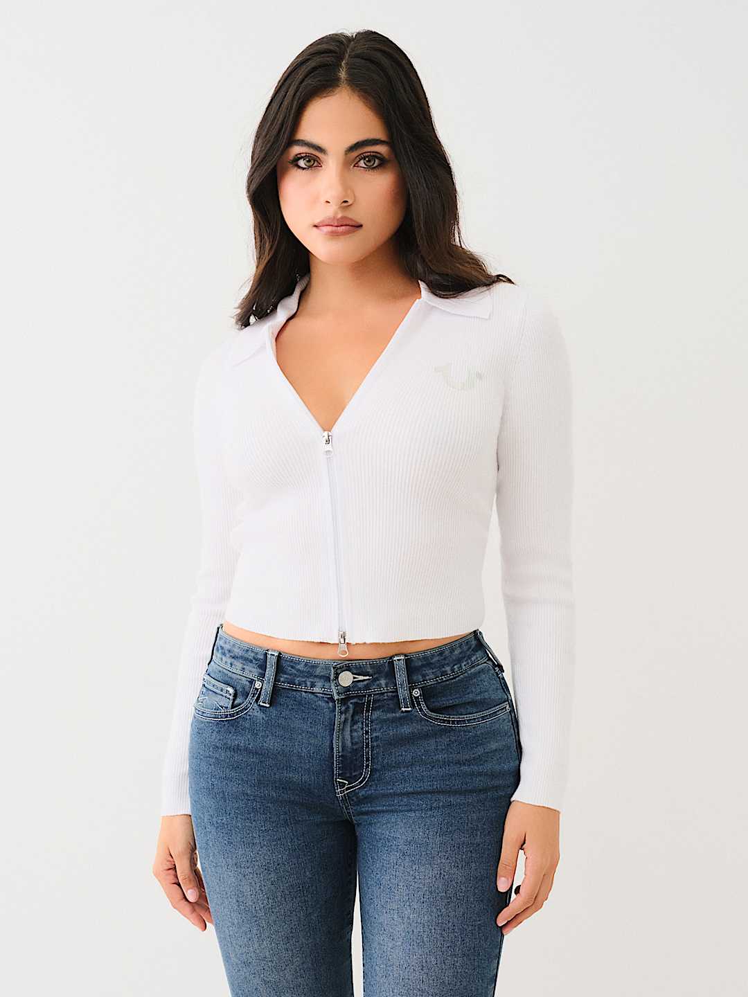 The Rib Collar Zip Sweater offers comfort and style to your wardrobe. Crafted from soft ribbed knit, this sweater features a basic collar, zip-up front, long sleeves, and a semi-cropped hem. Finished with a chest horseshoe logo.