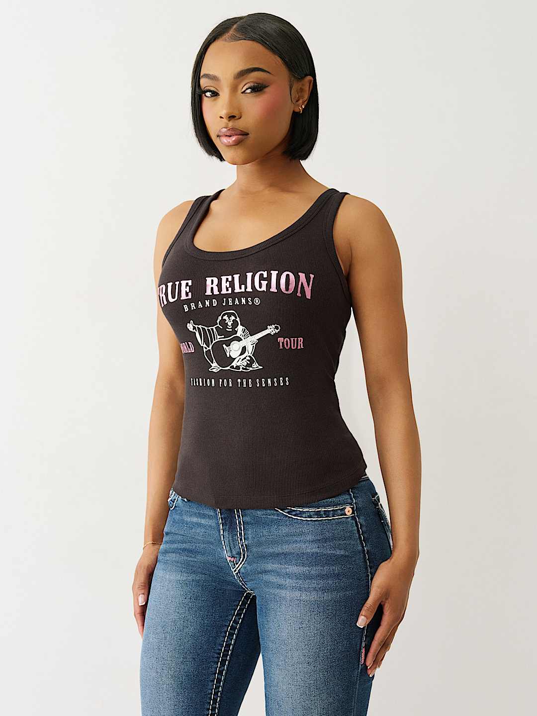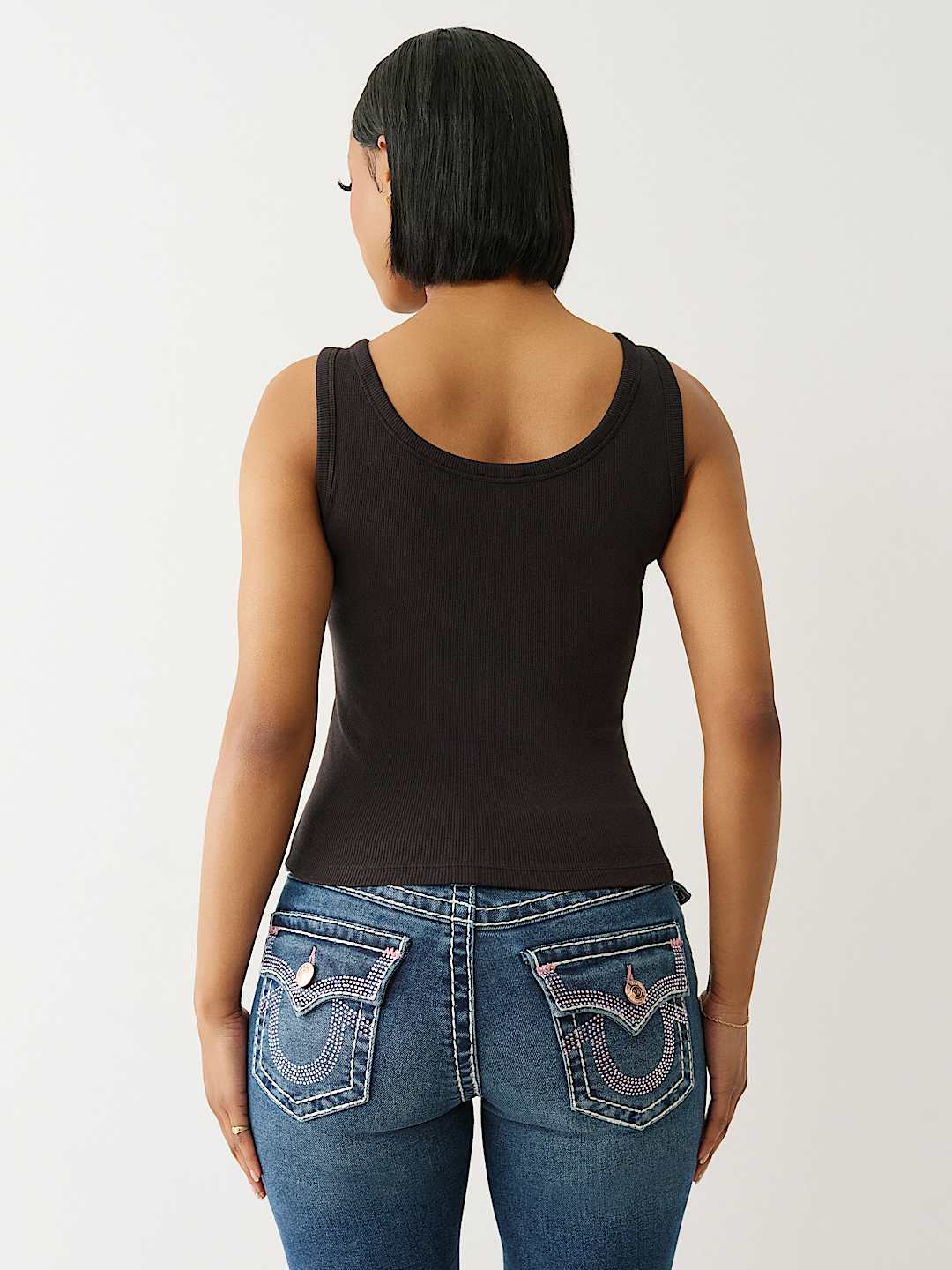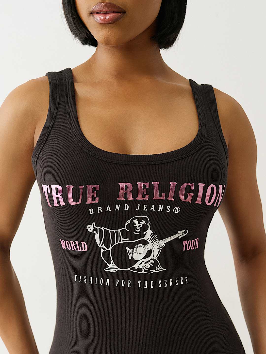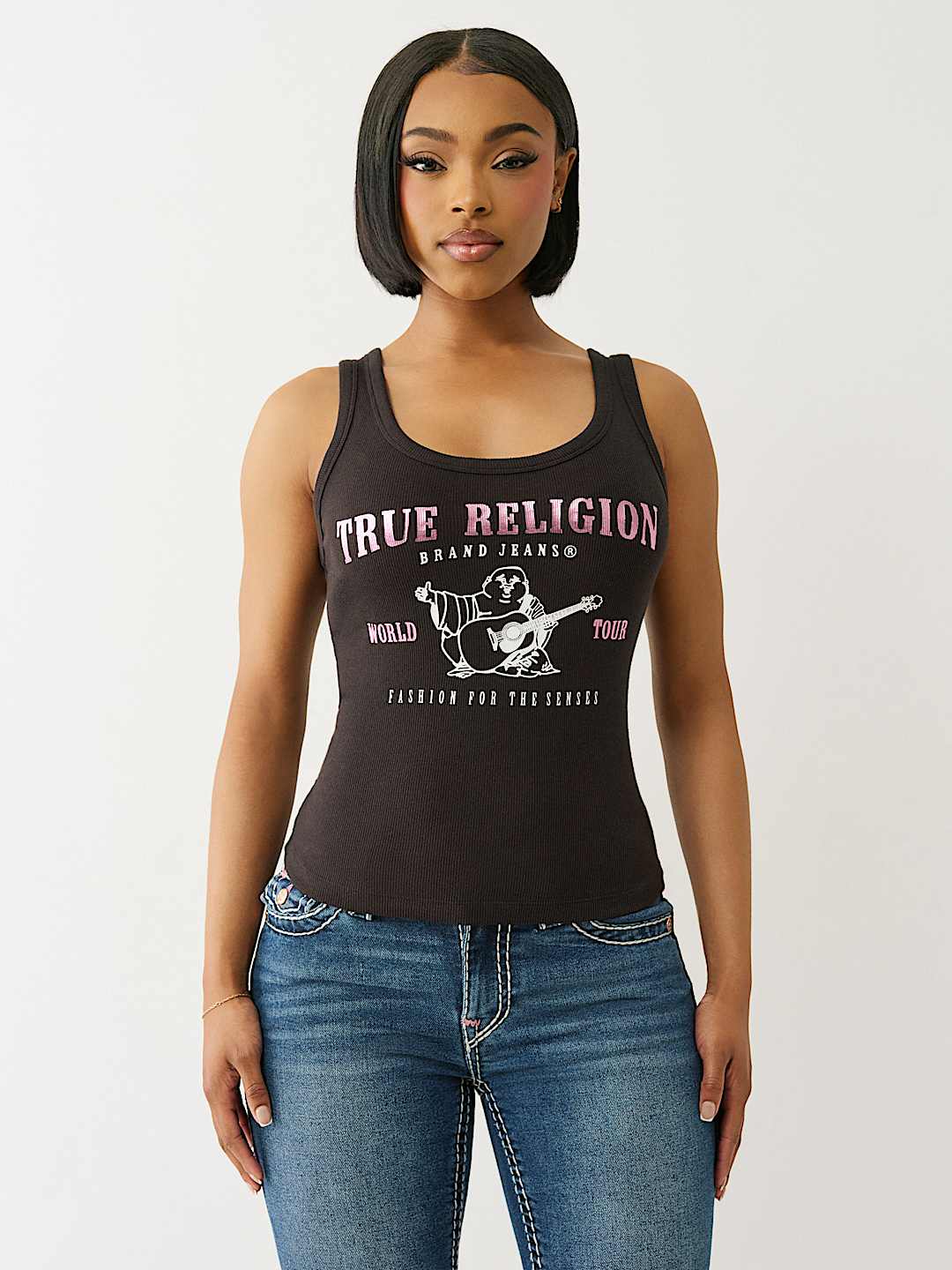 The Ribbed Metallic Buddha Tank is the perfect layering piece and looks great on its own. Crafted from a ribbed cotton blend, this scoop neck tank features a Buddha logo with metallic text.