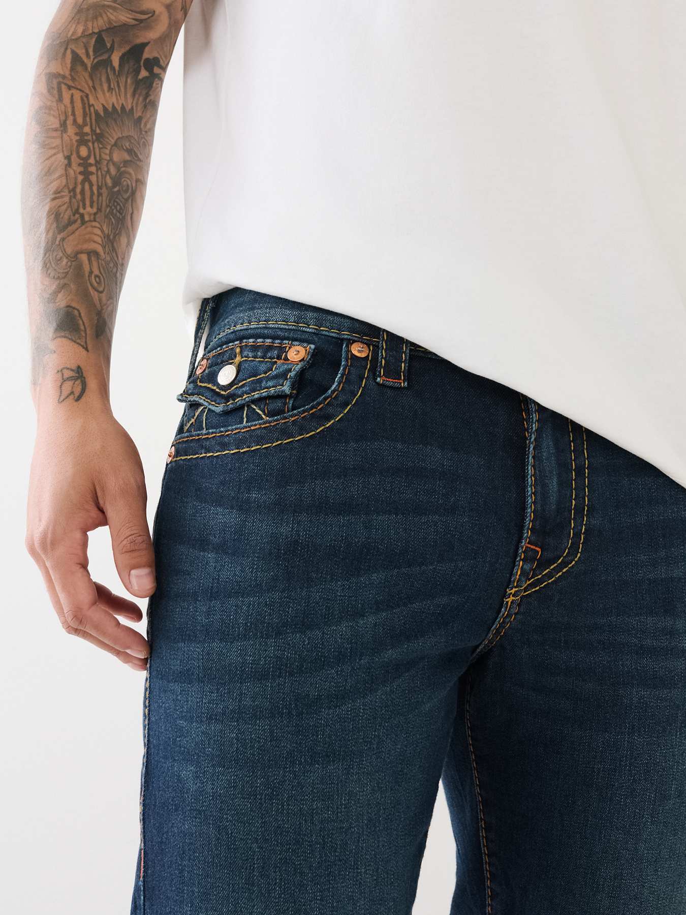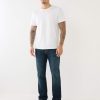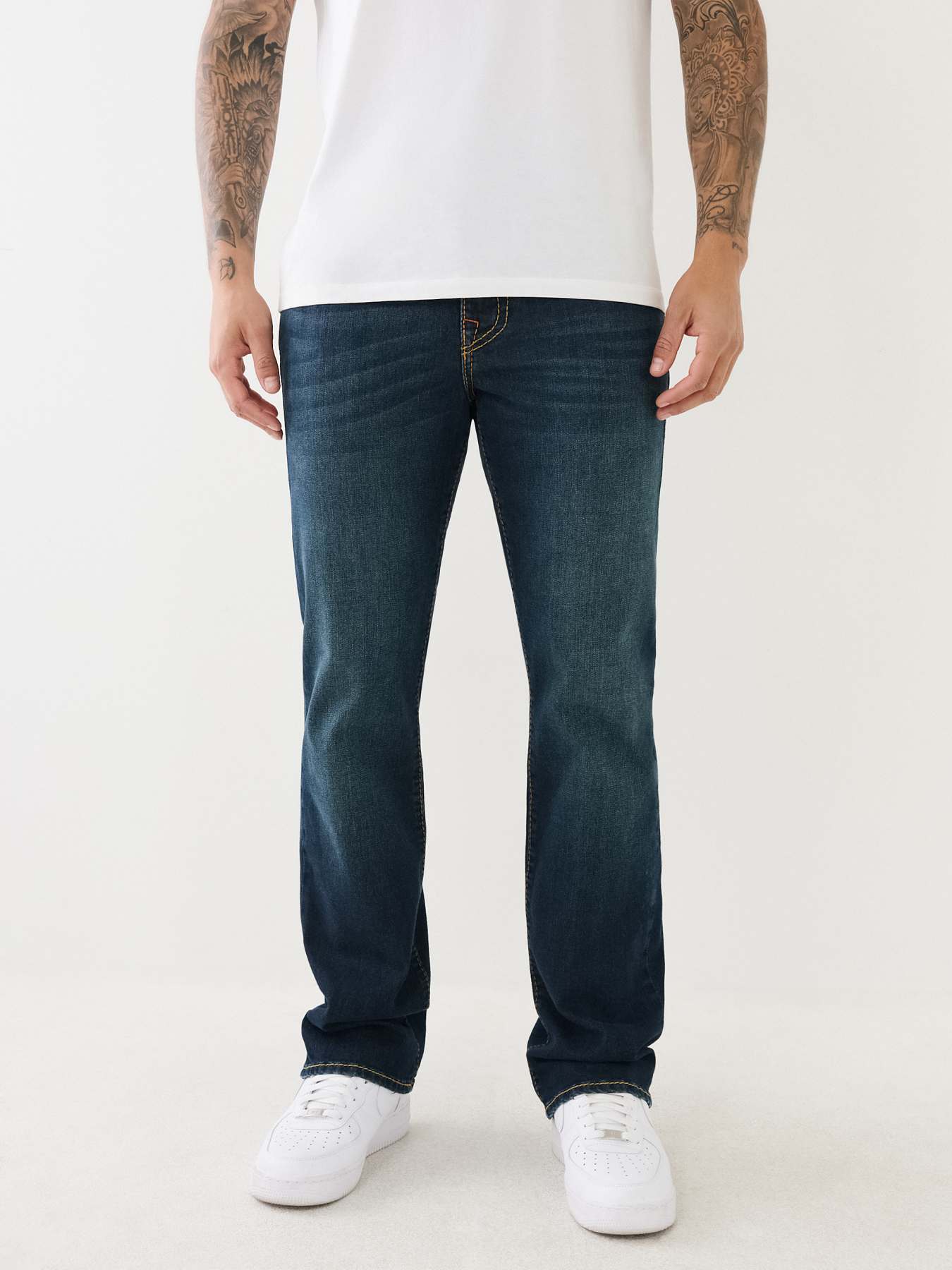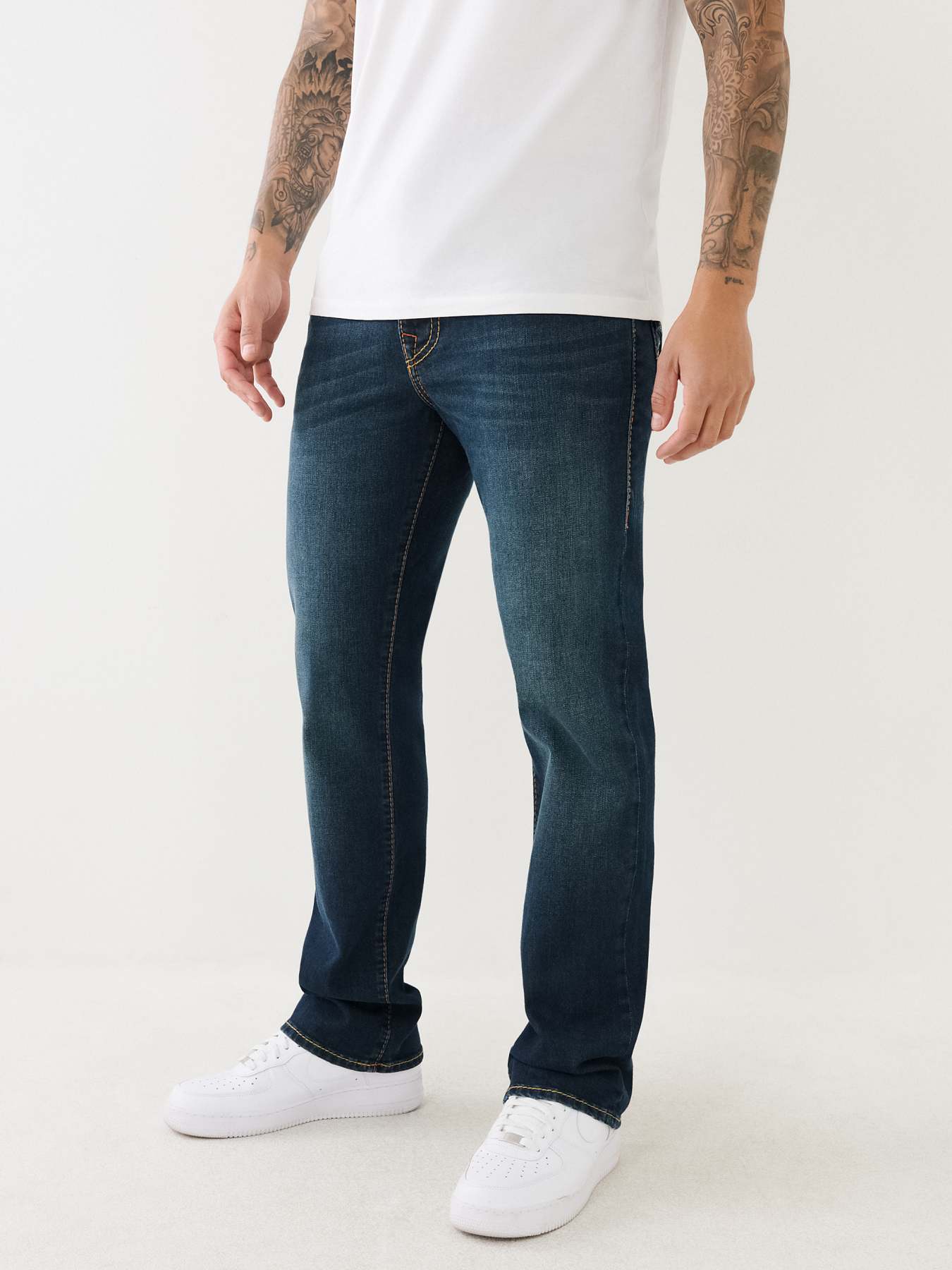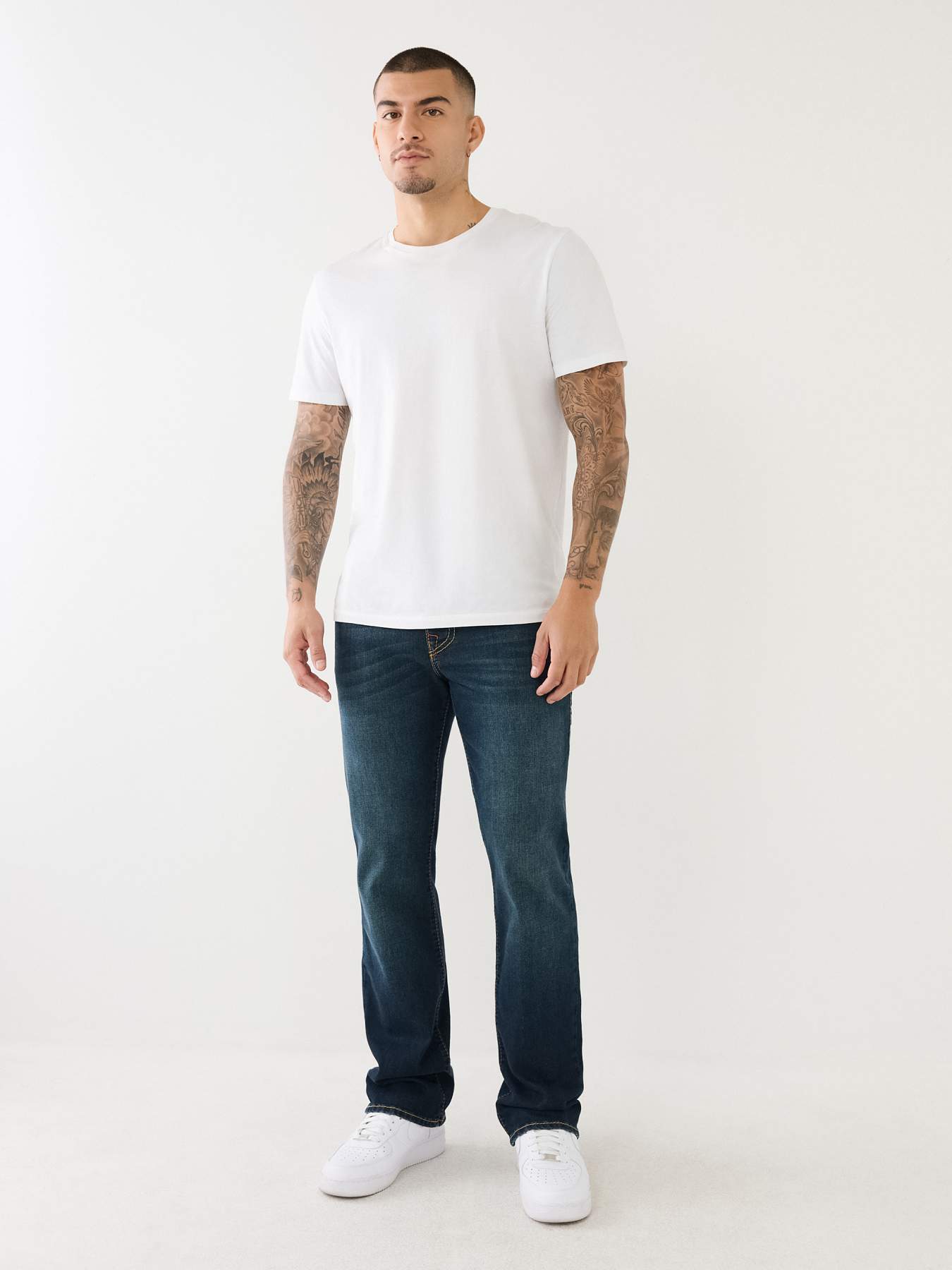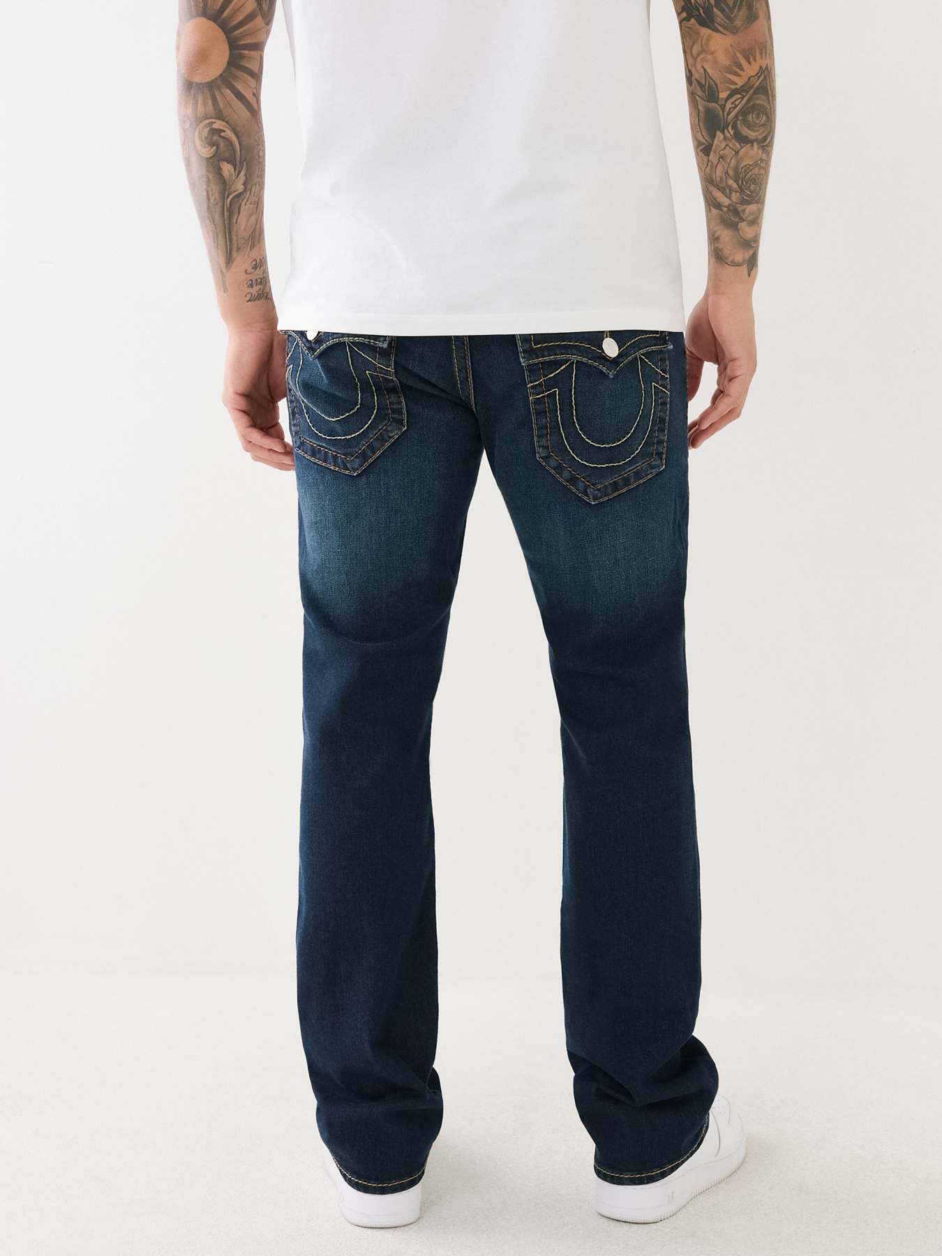 The Ricky Big T Straight Jean is a classic denim pick. This straight leg men's jean features fading, 3D whiskering, and two-tone gold Big T stitching with red bar tacks. Finished with 1/2 inch horseshoe detailing along the back flap pockets and our regular 34” inseam.