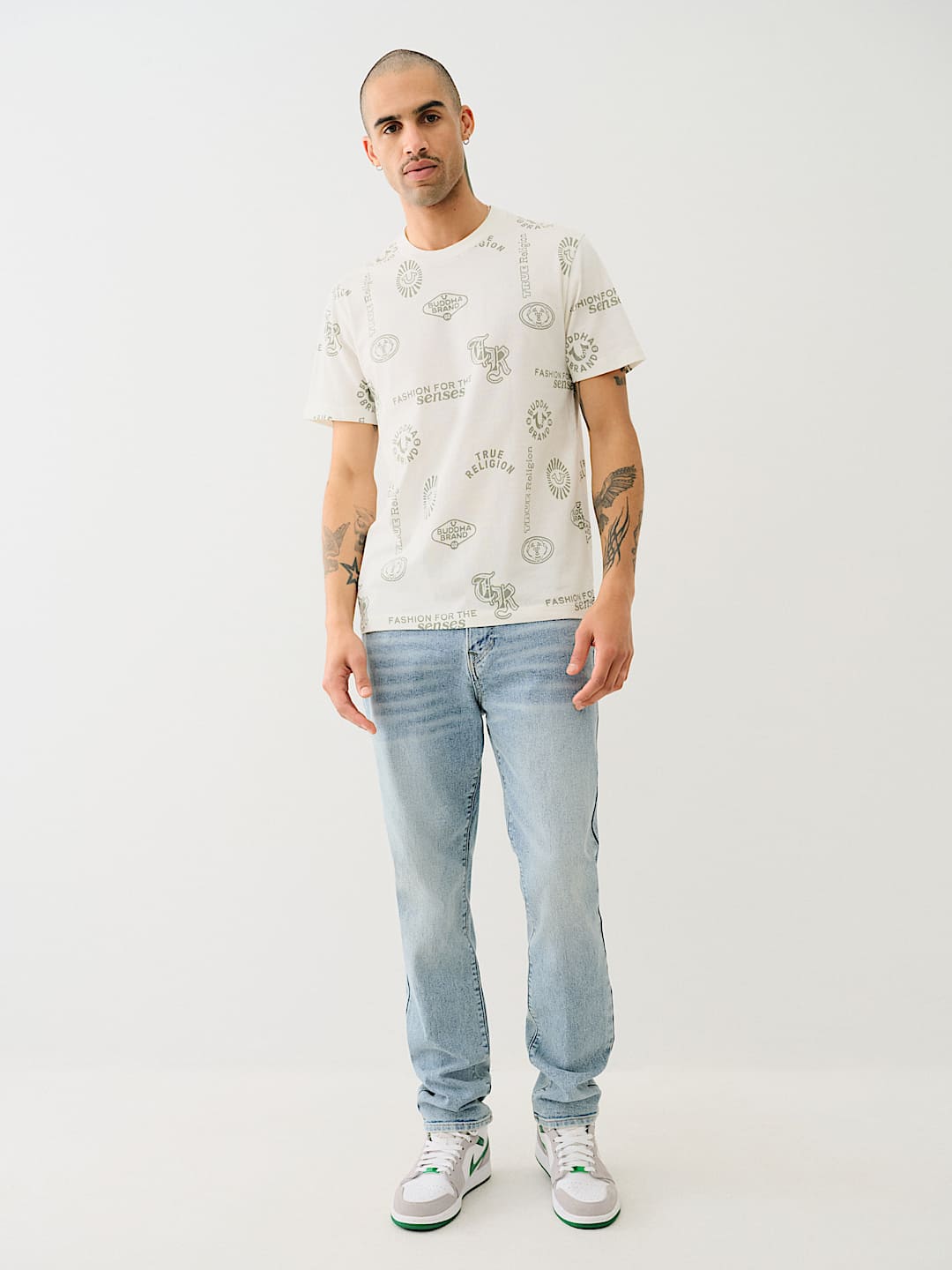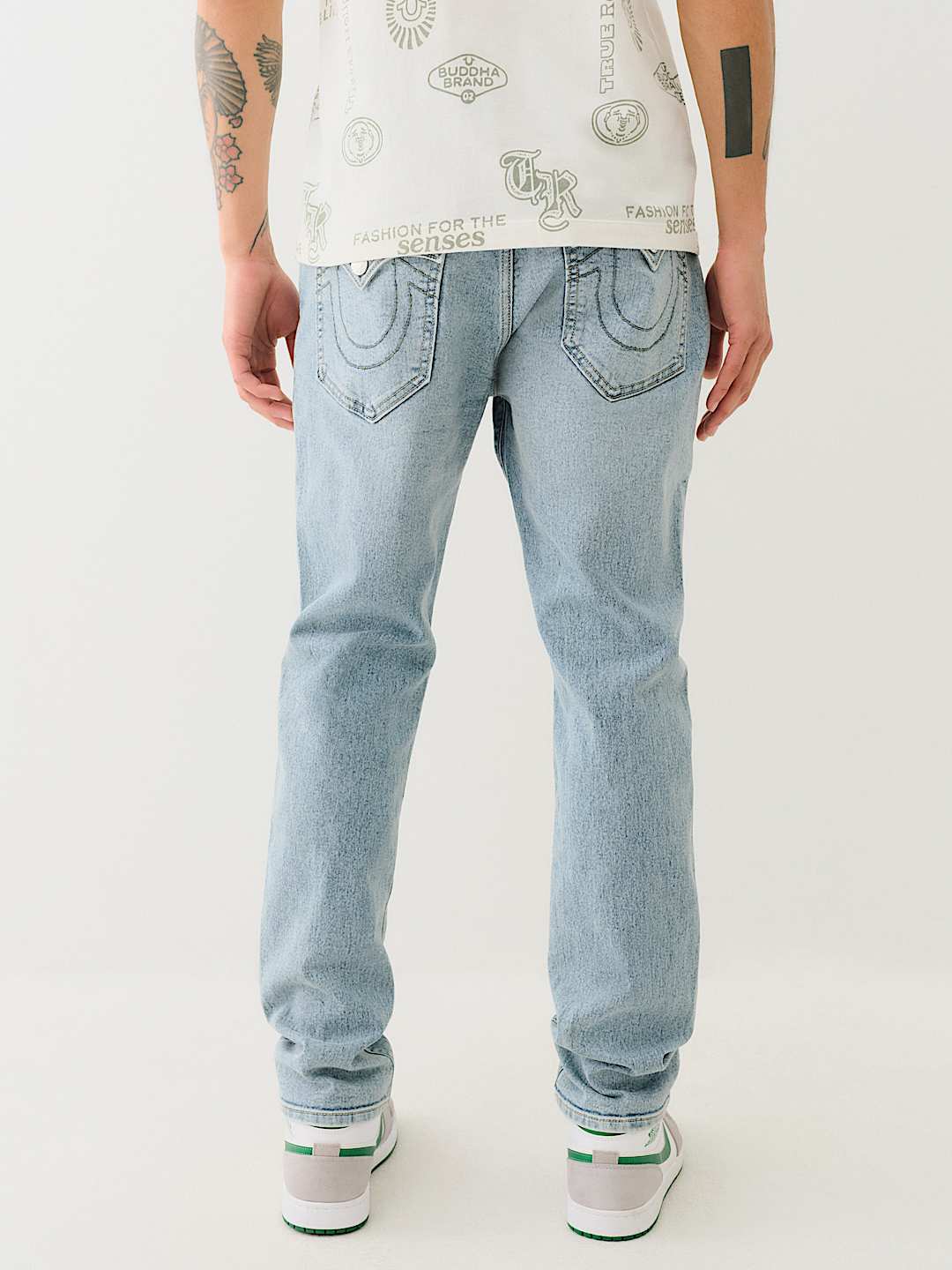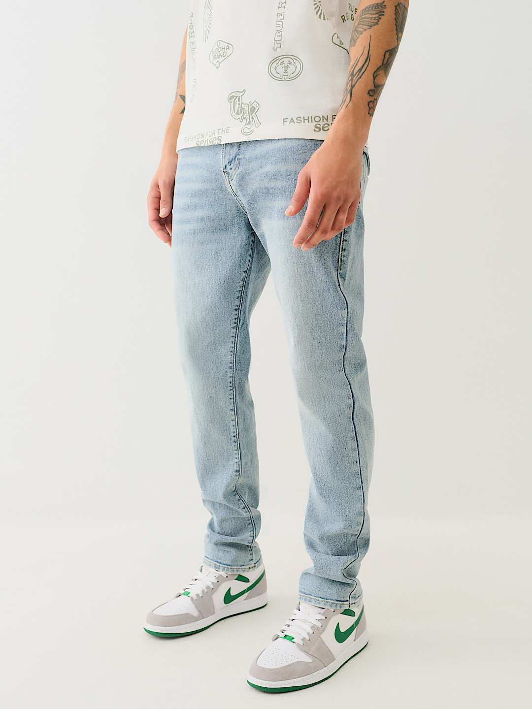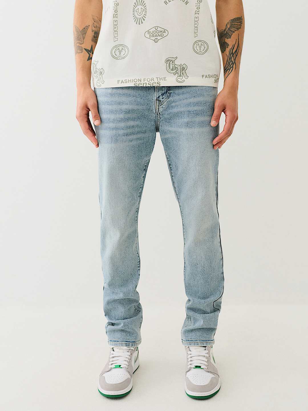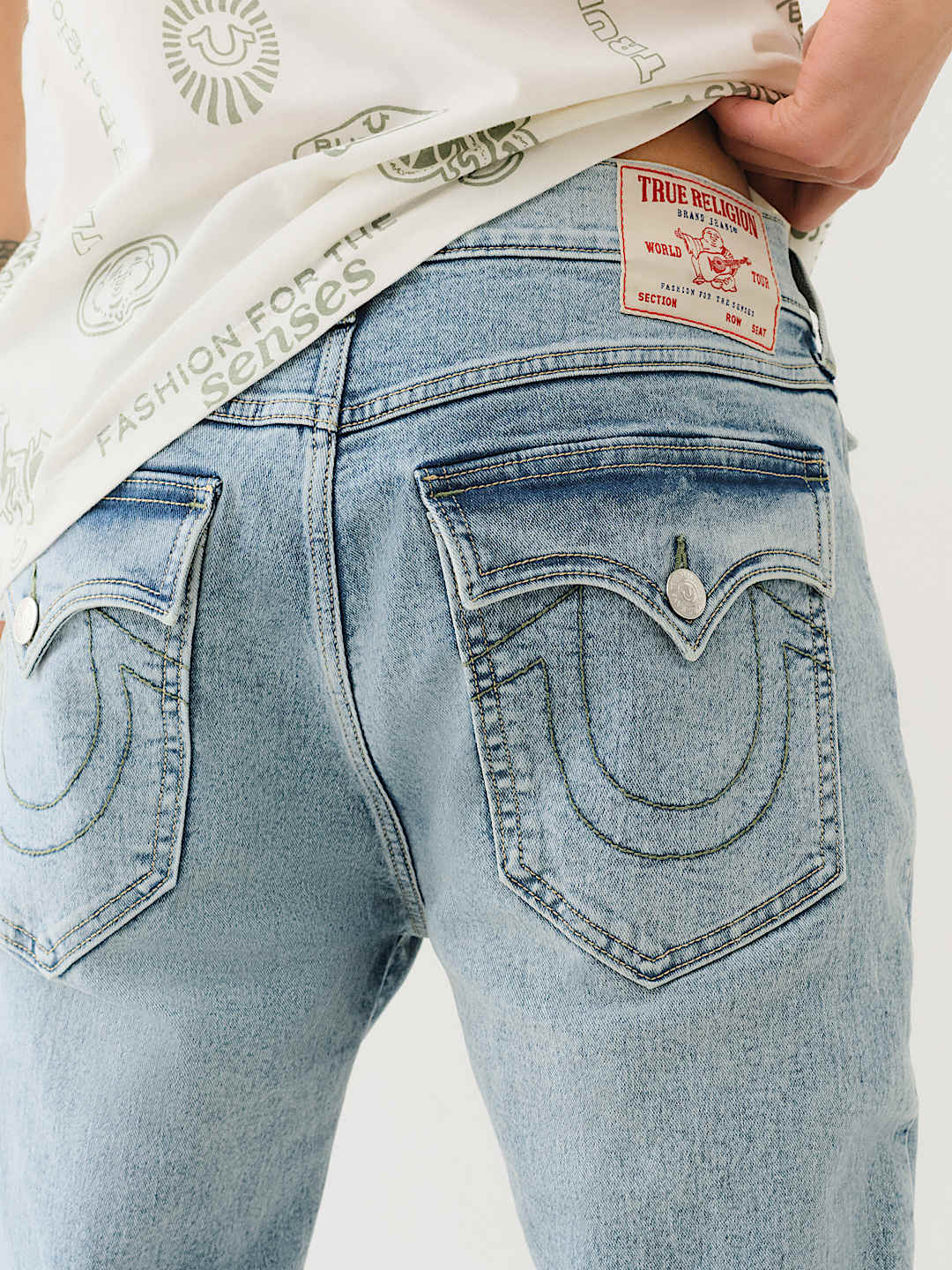 You can't go wrong with the Rocco Flap Skinny Jean. Crafted in a classic light wash, this pair of men's skinny jeans feature a zip fly, belt loops, and whiskering. Complete with single needle stitching and green horseshoe detailing on the back flap pockets.