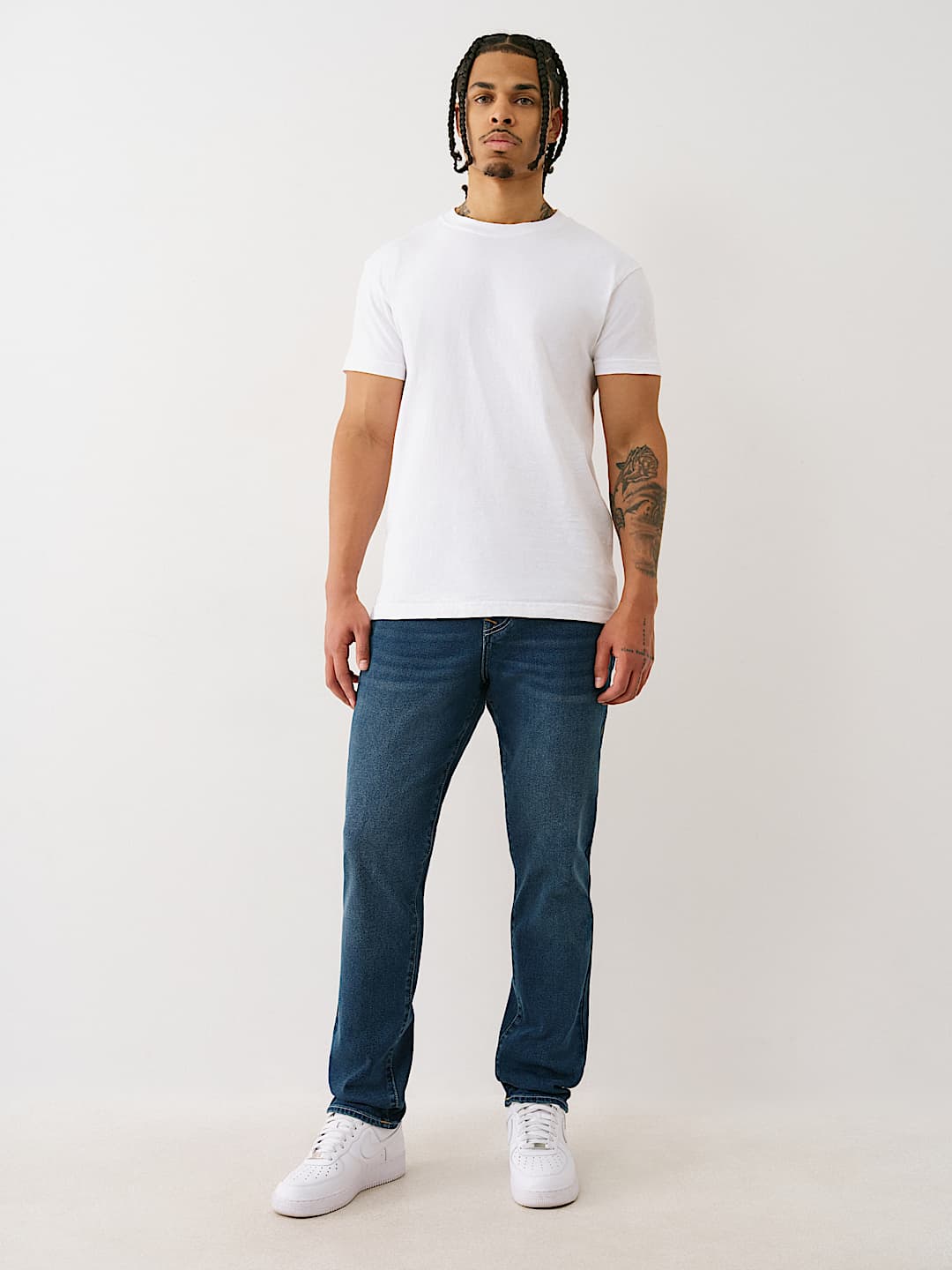 The Rocco Single Needle Skinny Jean keeps your look on point. This pair of men’s jeans features a zip fly, whiskering, and five-pocket construction. Finished with clean hardware, belt loops, single needle stitching, and horseshoe detailing on the back flap pockets.