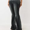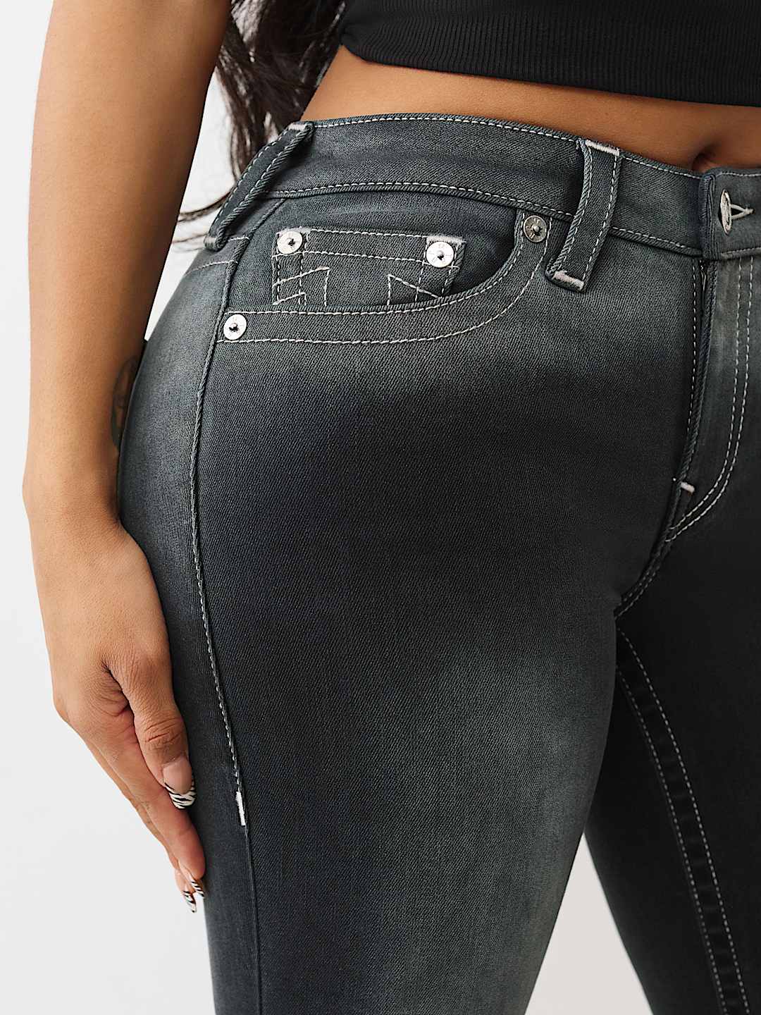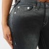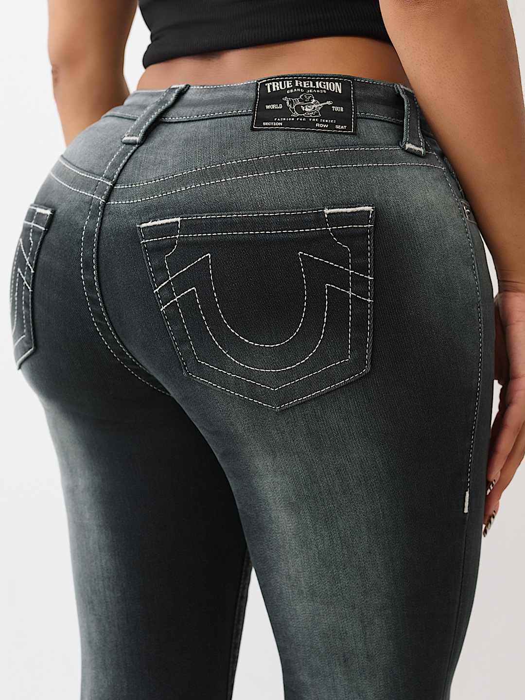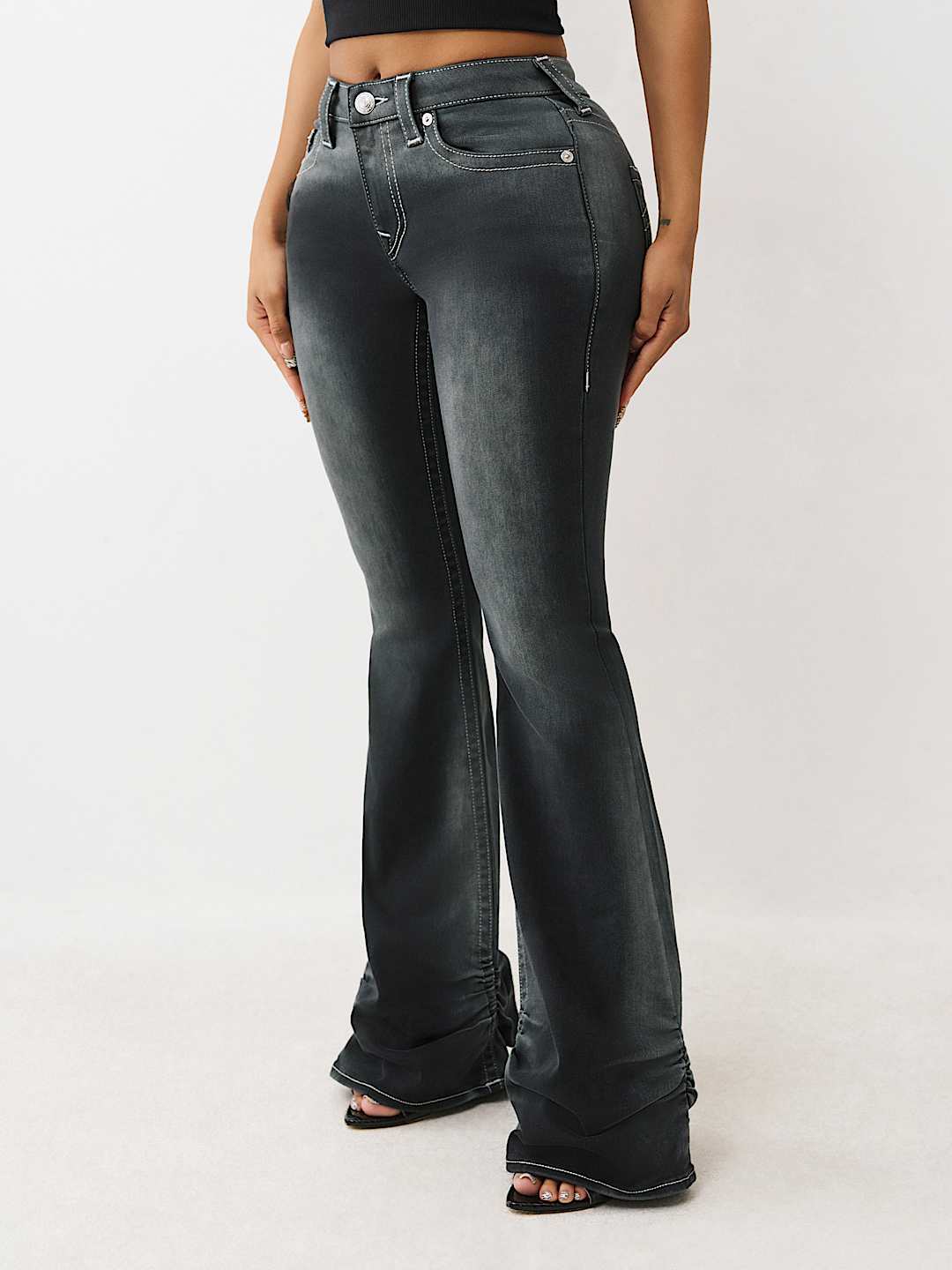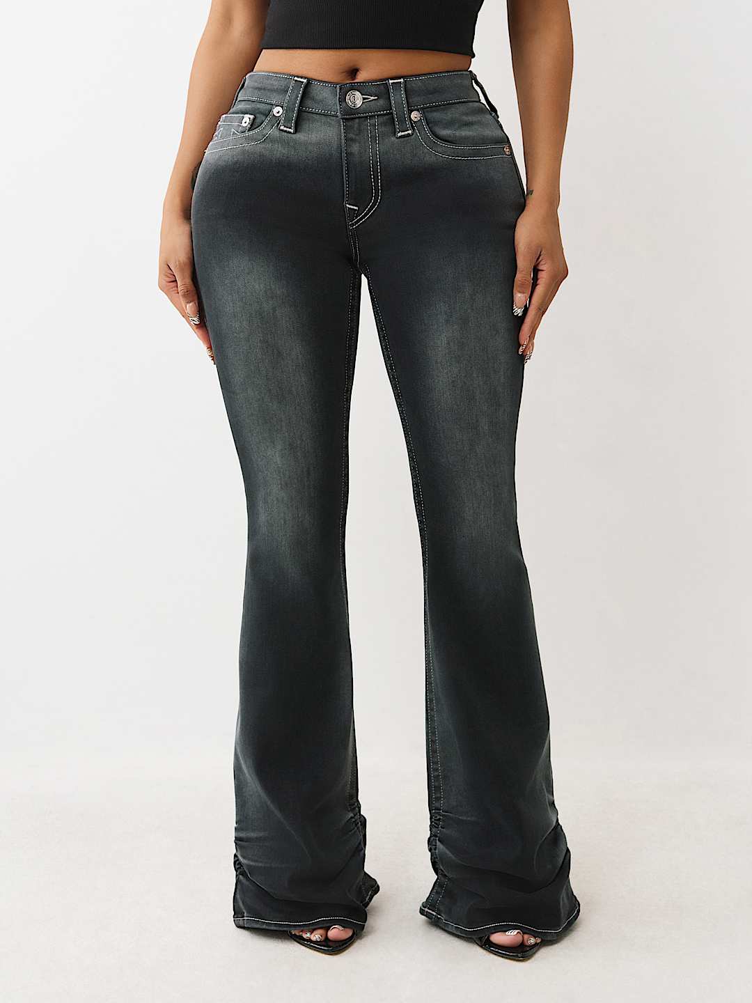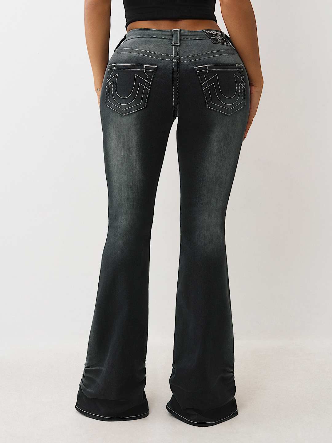 The Ruched Mid Rise Flare Jean delivers timeless, flattering vibes with a twist. Crafted in a leg-lengthening flare fit, these faded dark wash jeans feature ruched hems, Big T stitching, and horseshoe detailing on the back flap pockets.