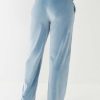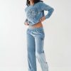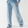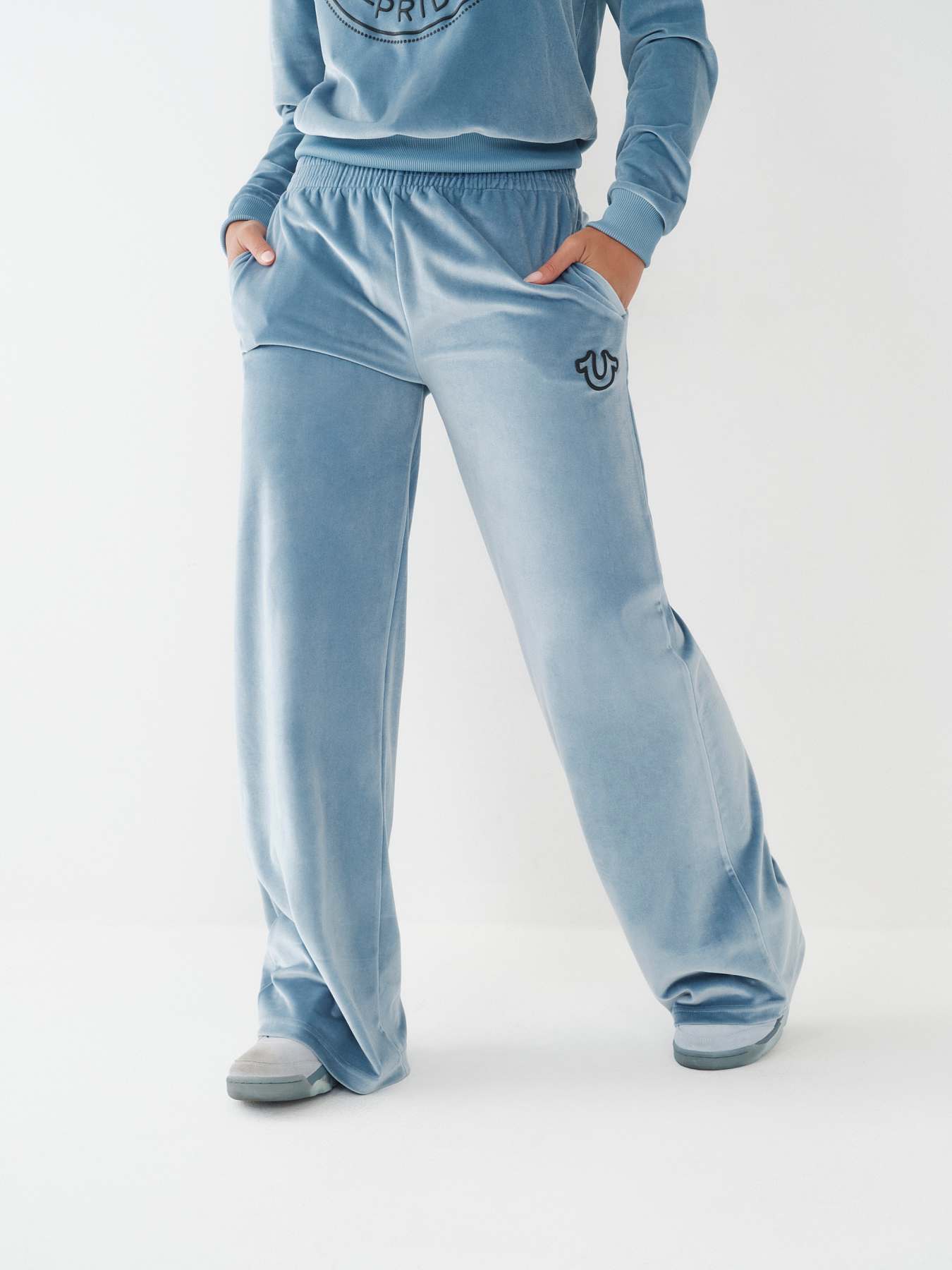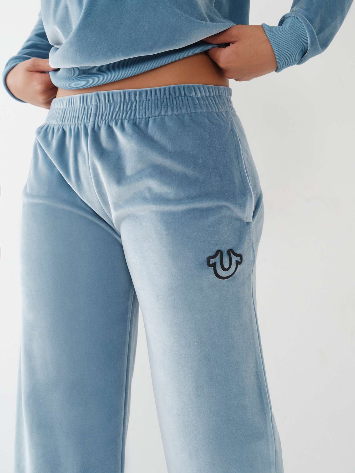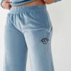 Dress up your sweats with the Velour Wide Leg Pant. This ultra-soft women's velour sweatpant features an elasticized waistband and relaxed wide leg silhouette. Finished with side pockets and puff print horseshoe detail at the hip.