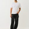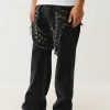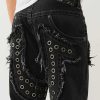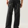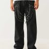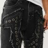 Edgy denim is the game, the Vinny Studded Horseshoe Applique Ultra Baggy Jean is the name. Crafted in a black wash, this pair of baggy jeans features large studded horseshoe appliques across the front and back, with slanted pockets and tonal hardware.