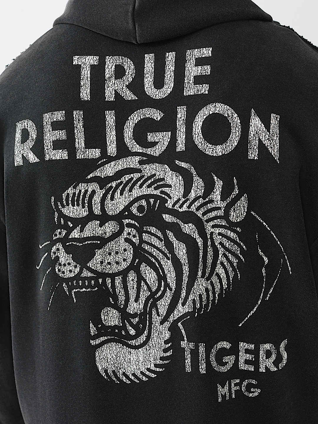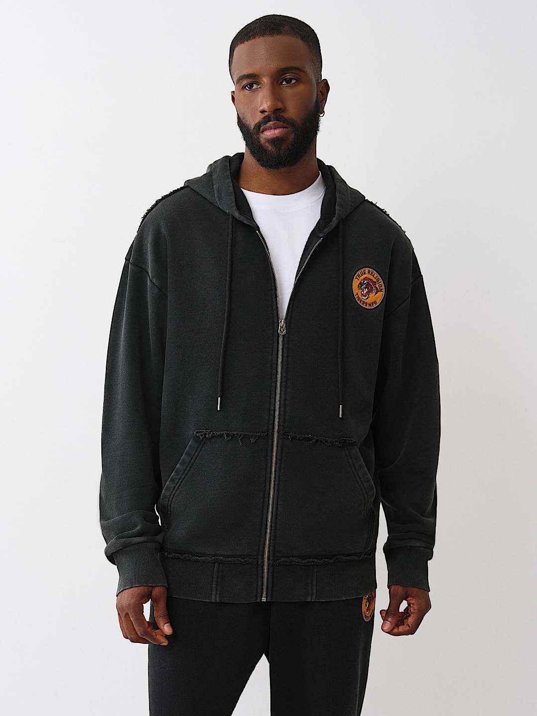 Head back to cool in the Vintage Tiger Zip Hoodie. Crafted in a vintage black wash, this relaxed-fit hoodie features a full-zip front, drawstring hood, and frayed front pockets. Finished with a tiger patch on the front and a faded tiger graphic on the back.