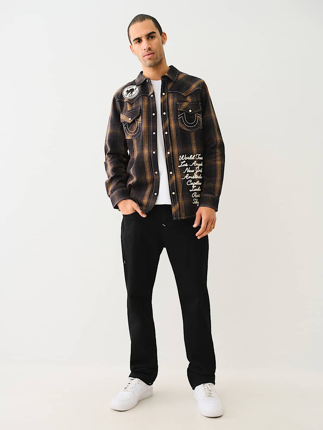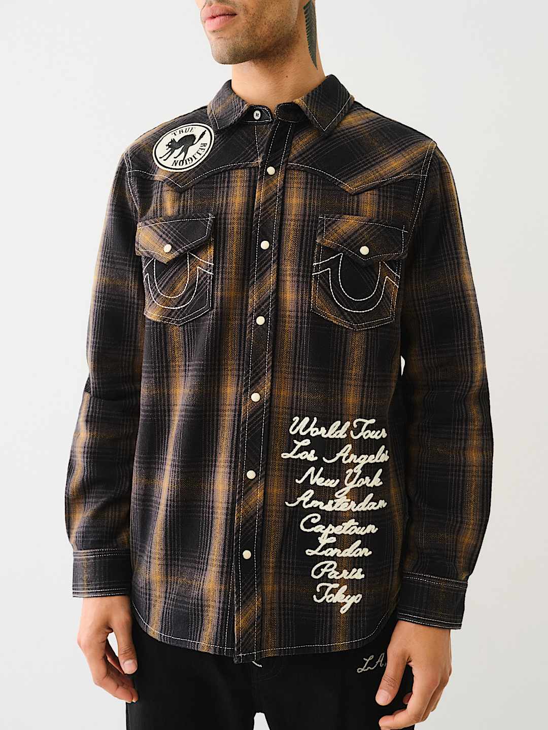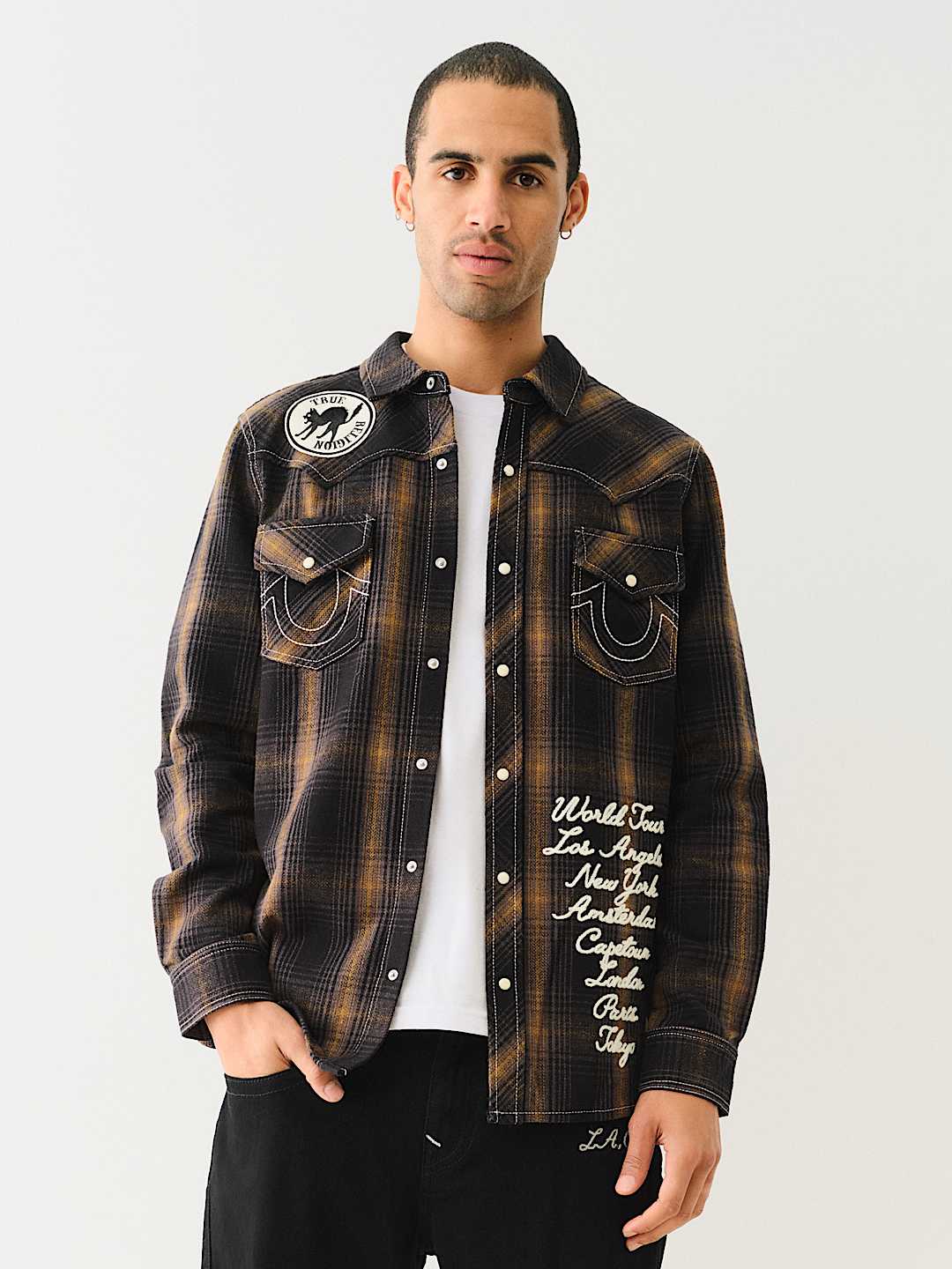 Channel your inner cowboy with the Western Big T Logo Plaid Shirt. Crafted from 100% cotton, this men’s shirt features a plaid pattern, button-up front, basic collar, Big T stitching, and a western-style yoke. Finished with a variety of True-branded patches, embroidery, and horseshoe detailing on the chest flap pockets.