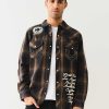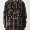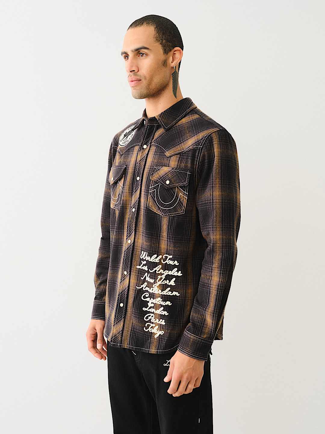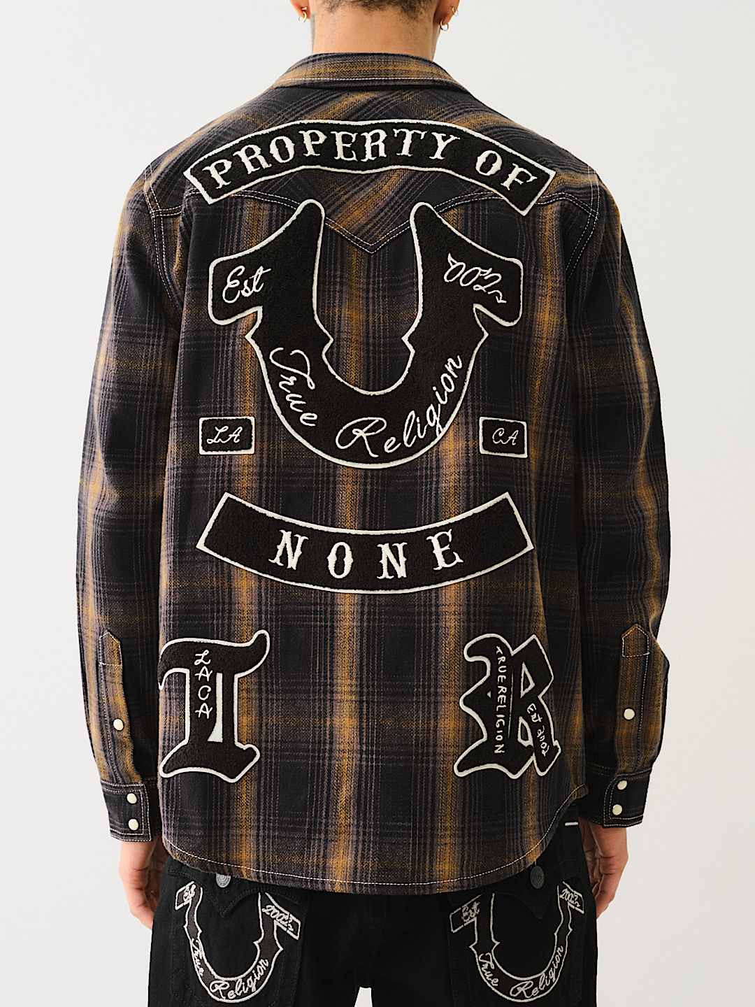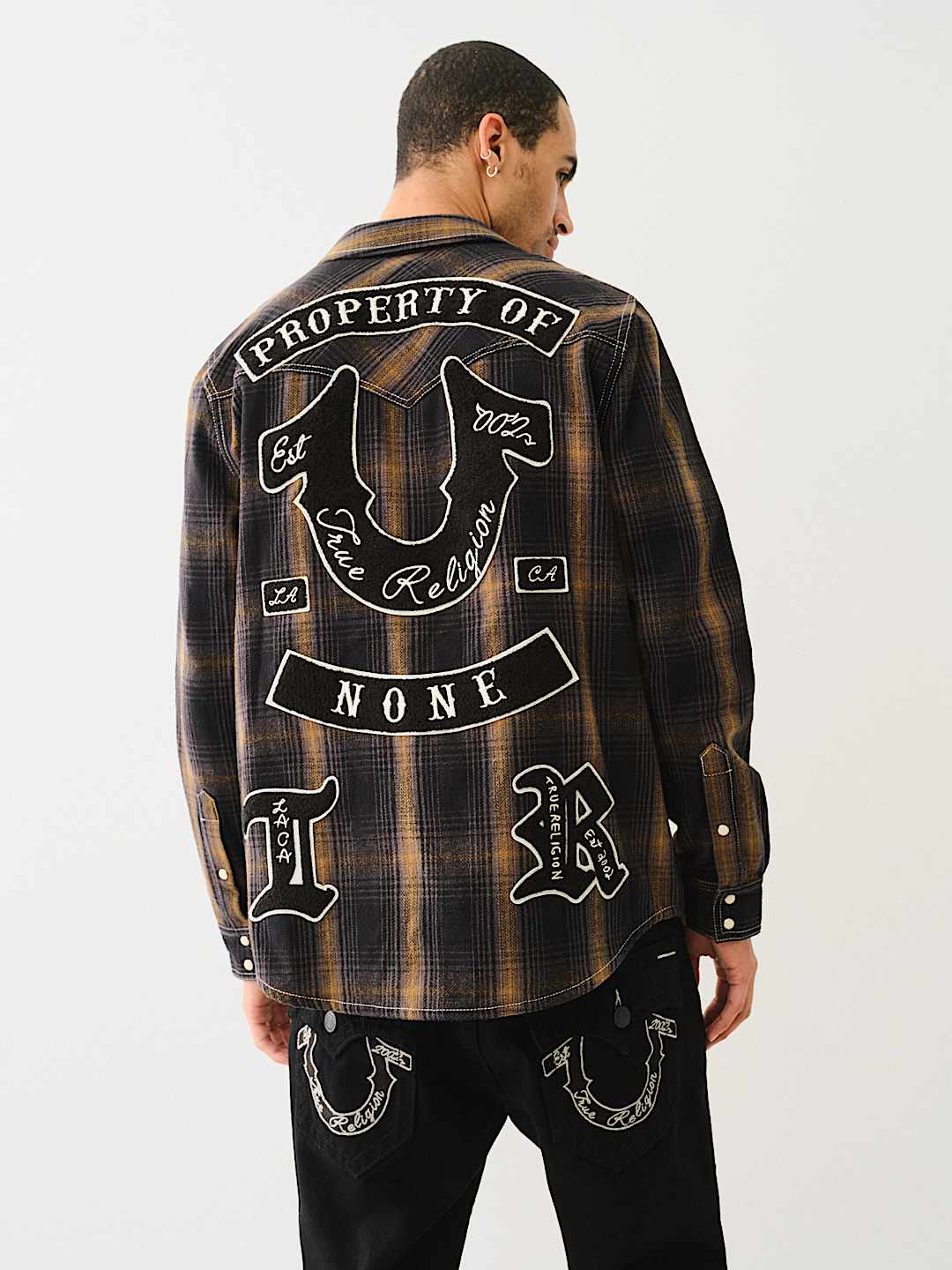 Channel your inner cowboy with the Western Big T Logo Plaid Shirt. Crafted from 100% cotton, this men’s shirt features a plaid pattern, button-up front, basic collar, Big T stitching, and a western-style yoke. Finished with a variety of True-branded patches, embroidery, and horseshoe detailing on the chest flap pockets.